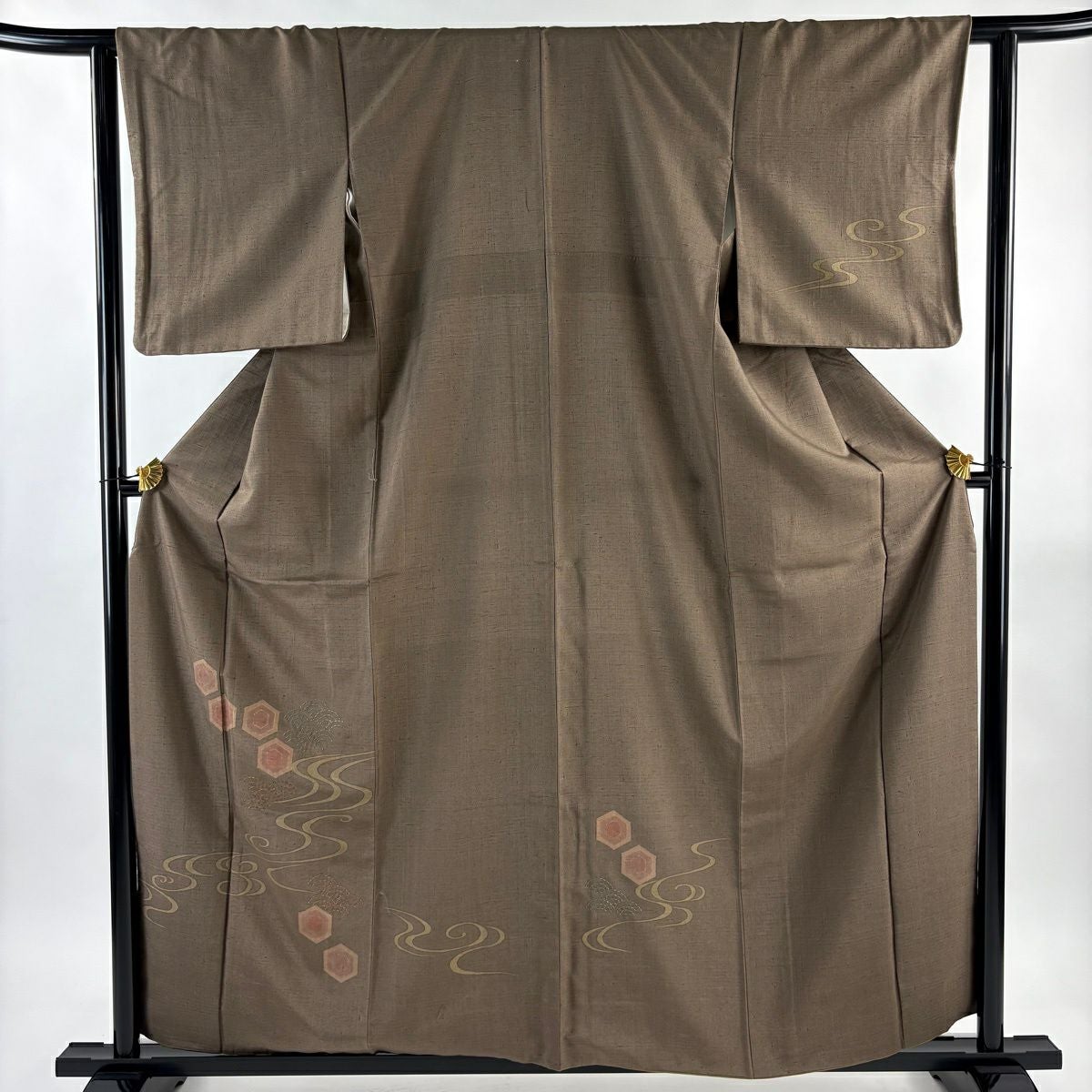【美品】 付下げ 身丈159.5cm 裄丈62.5cm S 袷 紬地 青海波 亀甲 刺繍 金彩 灰茶 正絹 秀品