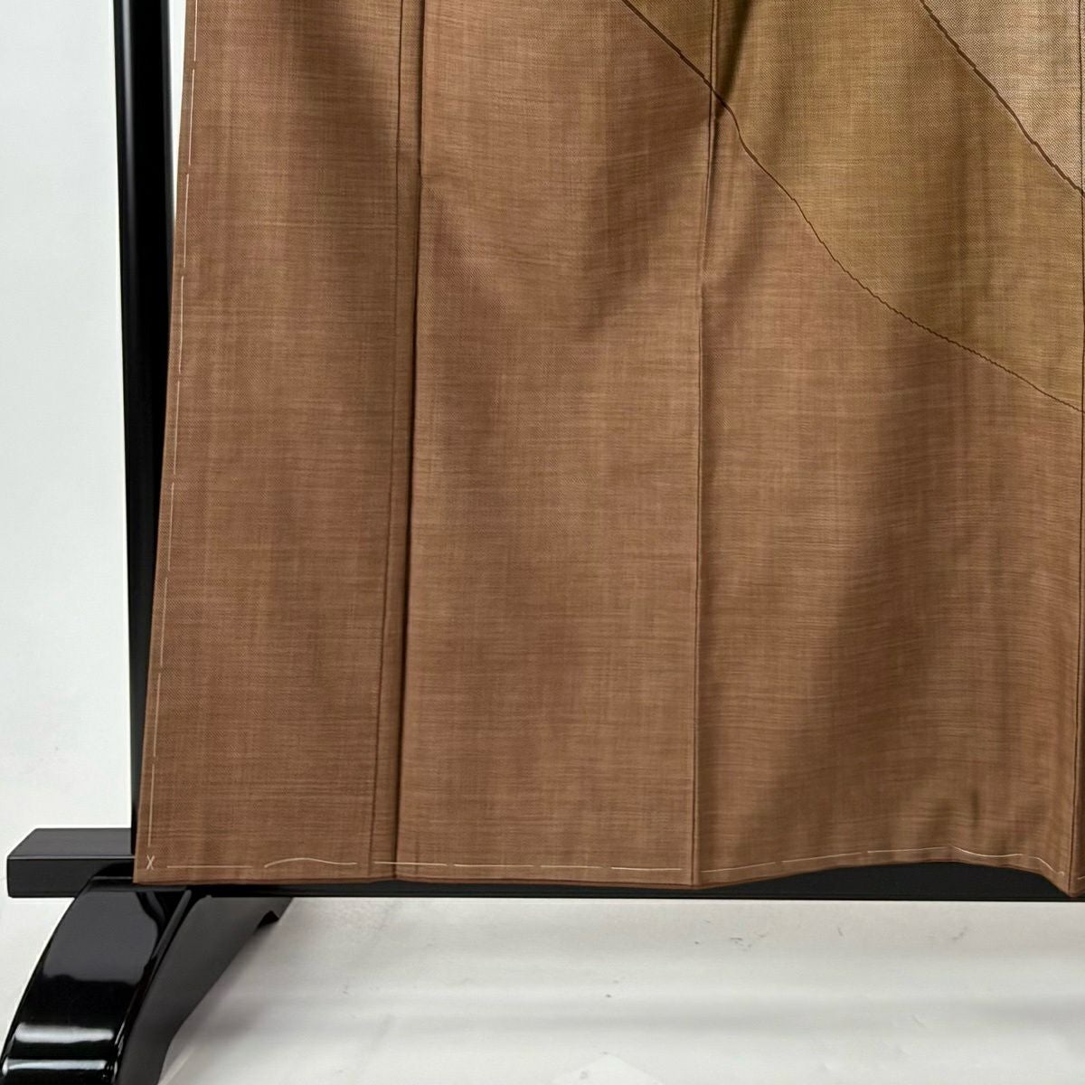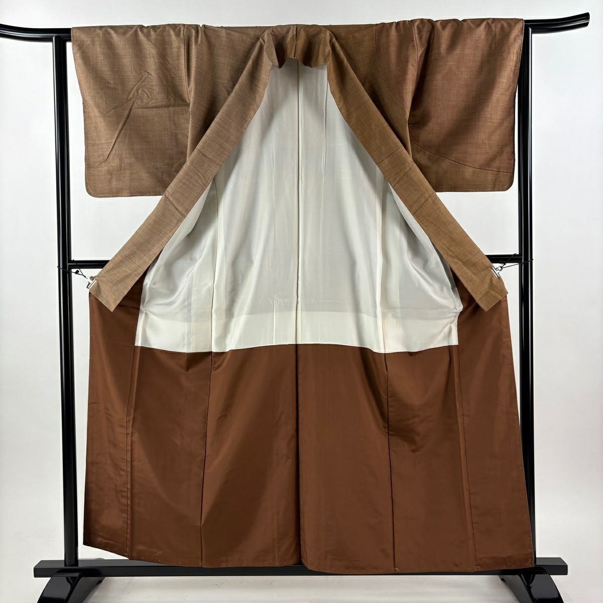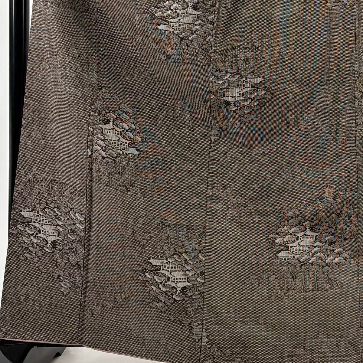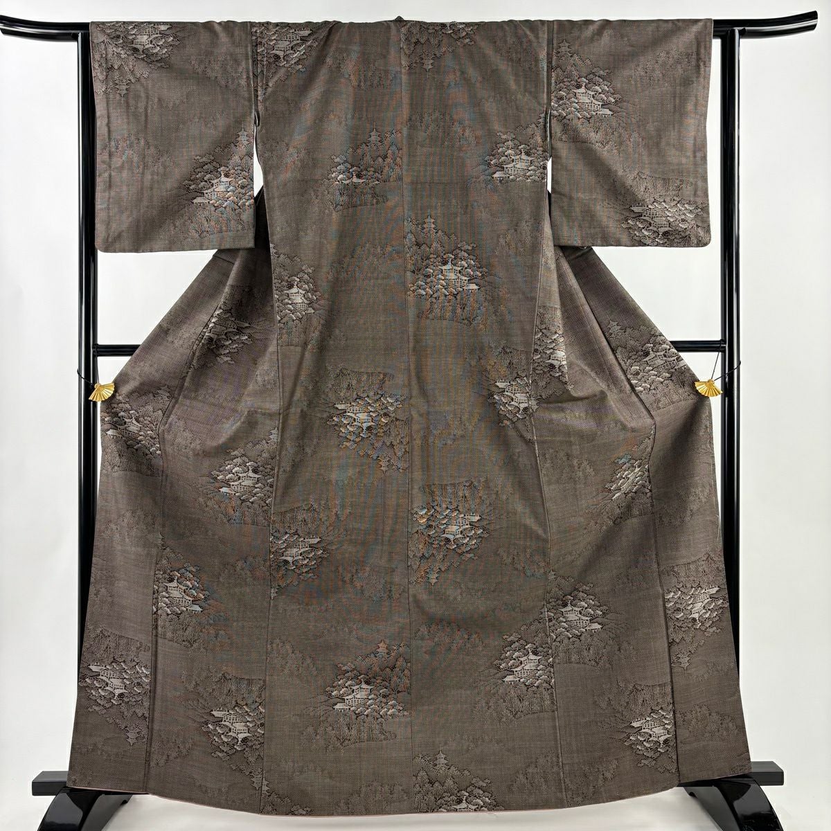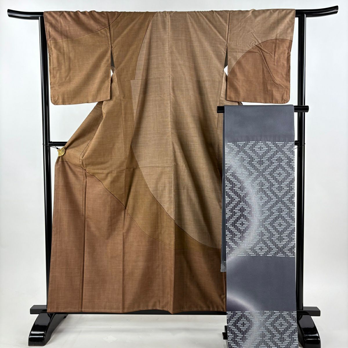 【美品】 訪問着 身丈159cm 裄丈64cm M 袷 袋名古屋帯セット 紬地 幾何学模様 茶色 正絹 秀品