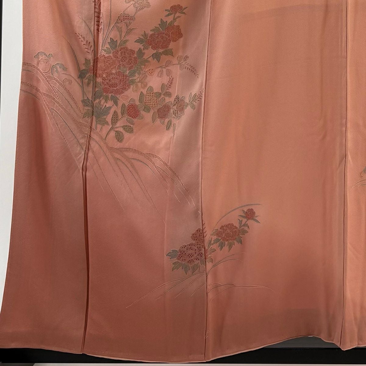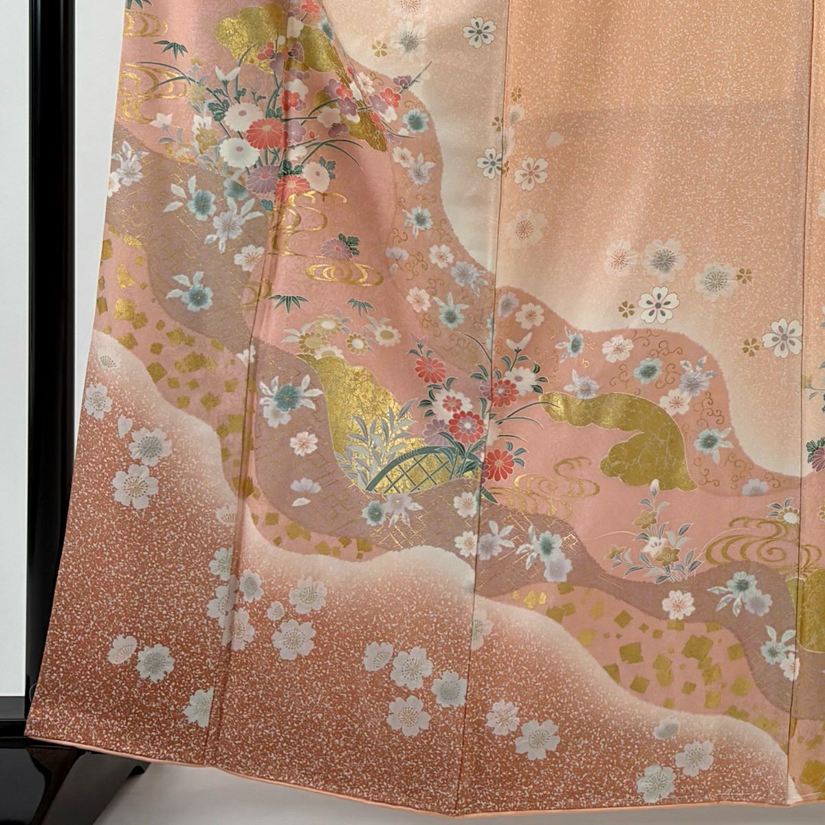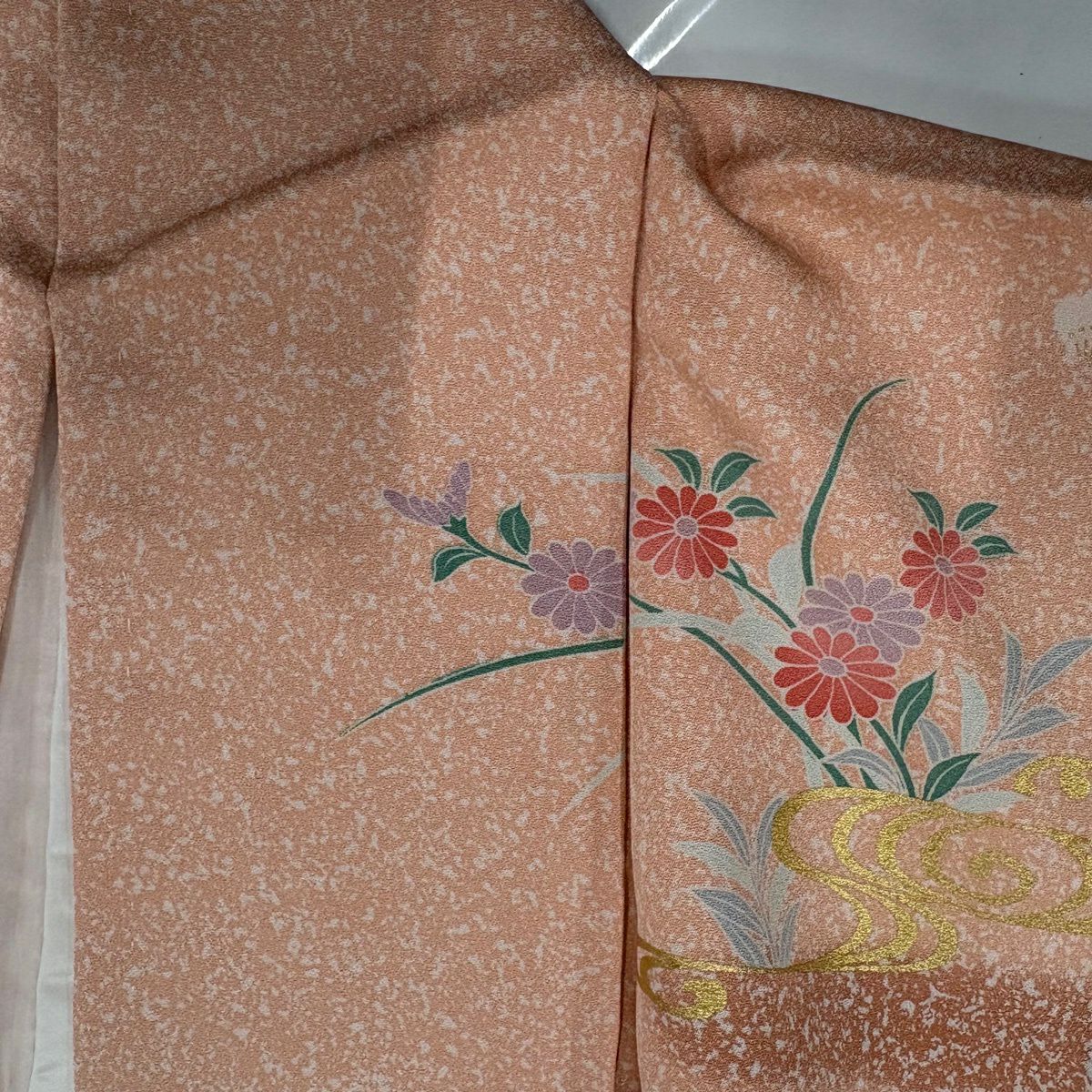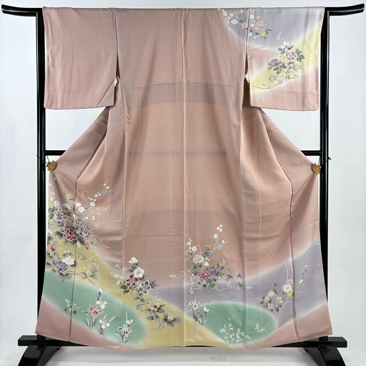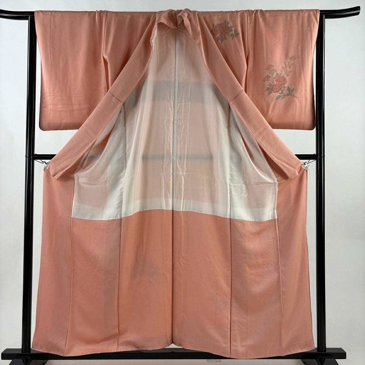 訪問着 身丈163.5cm 裄丈64cm M 袷 草花 道長取り 金彩 ぼかし サーモンピンク 正絹 秀品