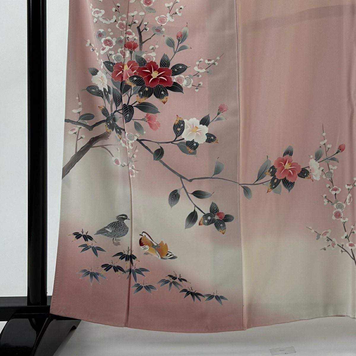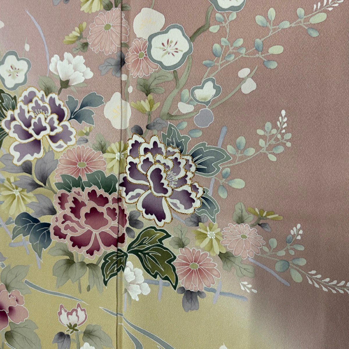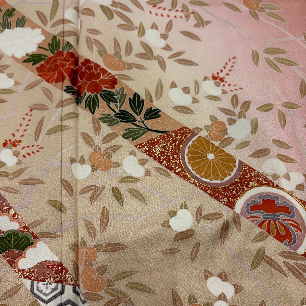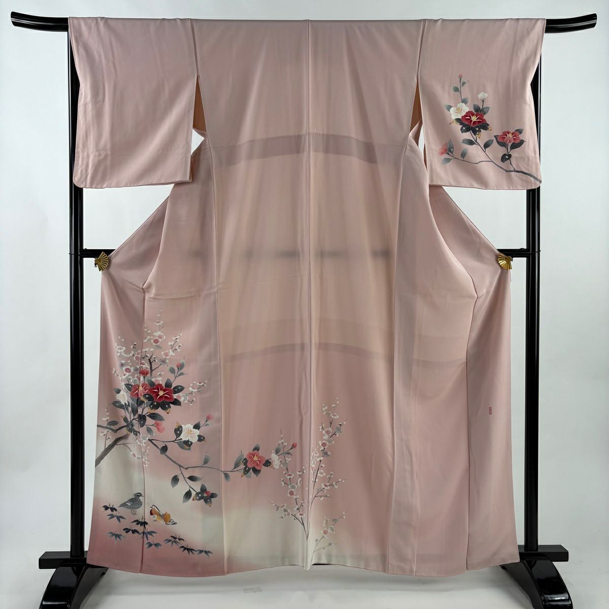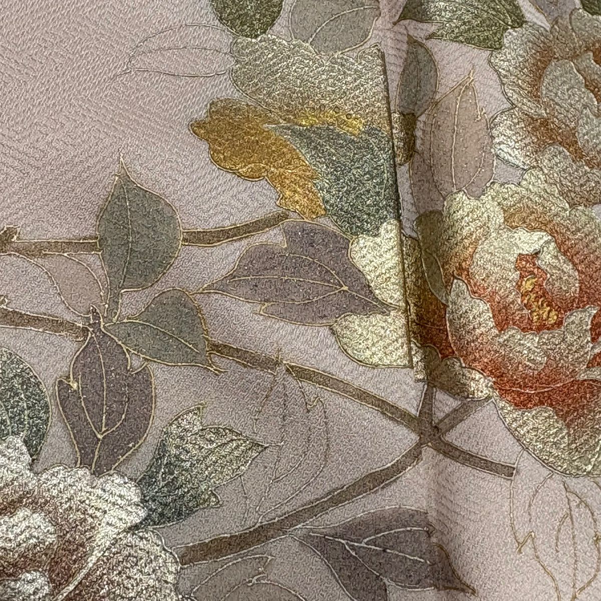 訪問着 身丈160cm 裄丈64.5cm M 袷 牡丹 枝梅 ぼかし 金糸 ピンクベージュ 正絹 秀品