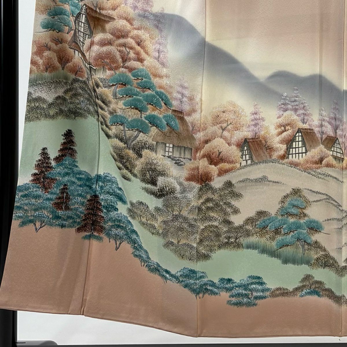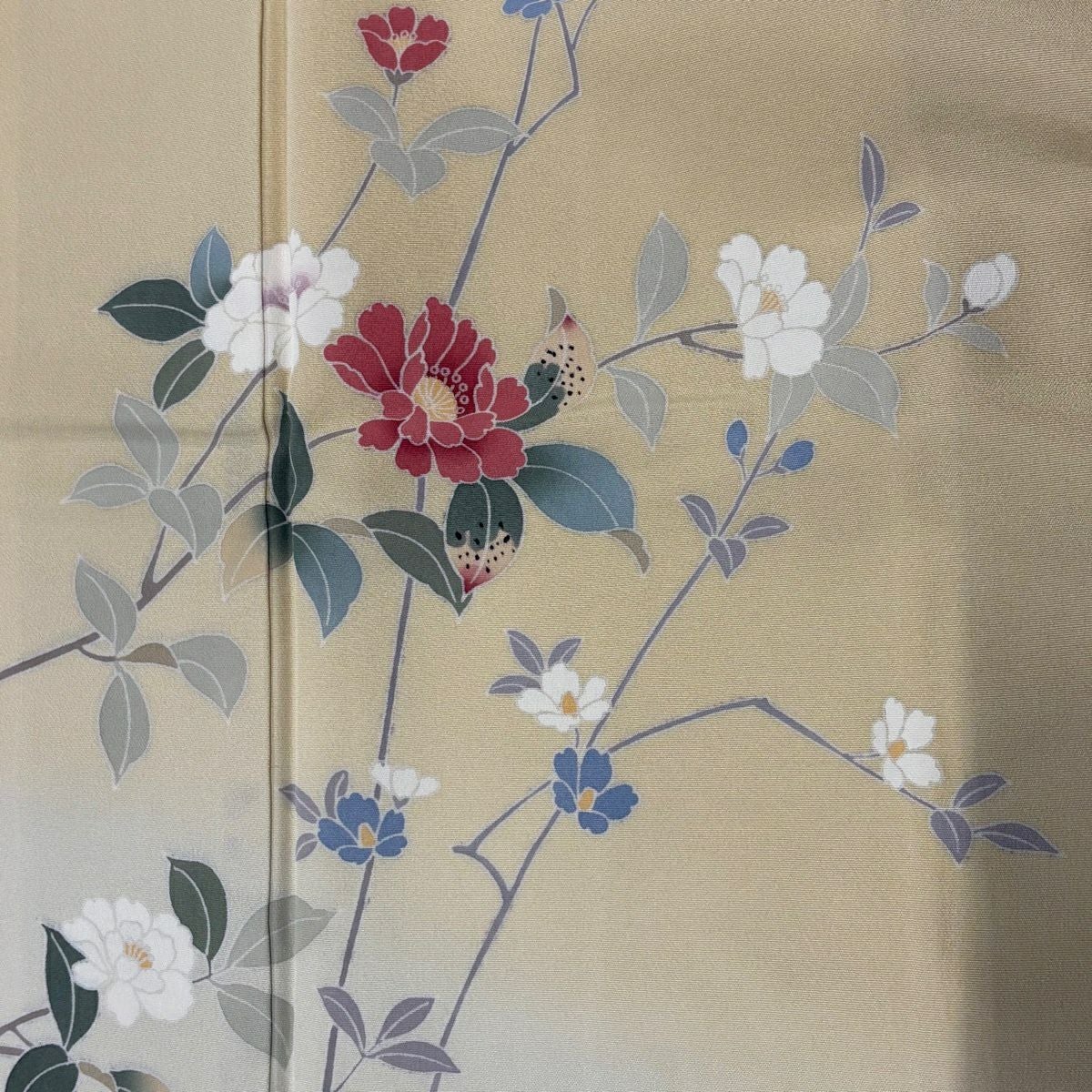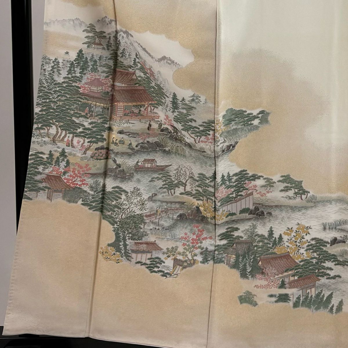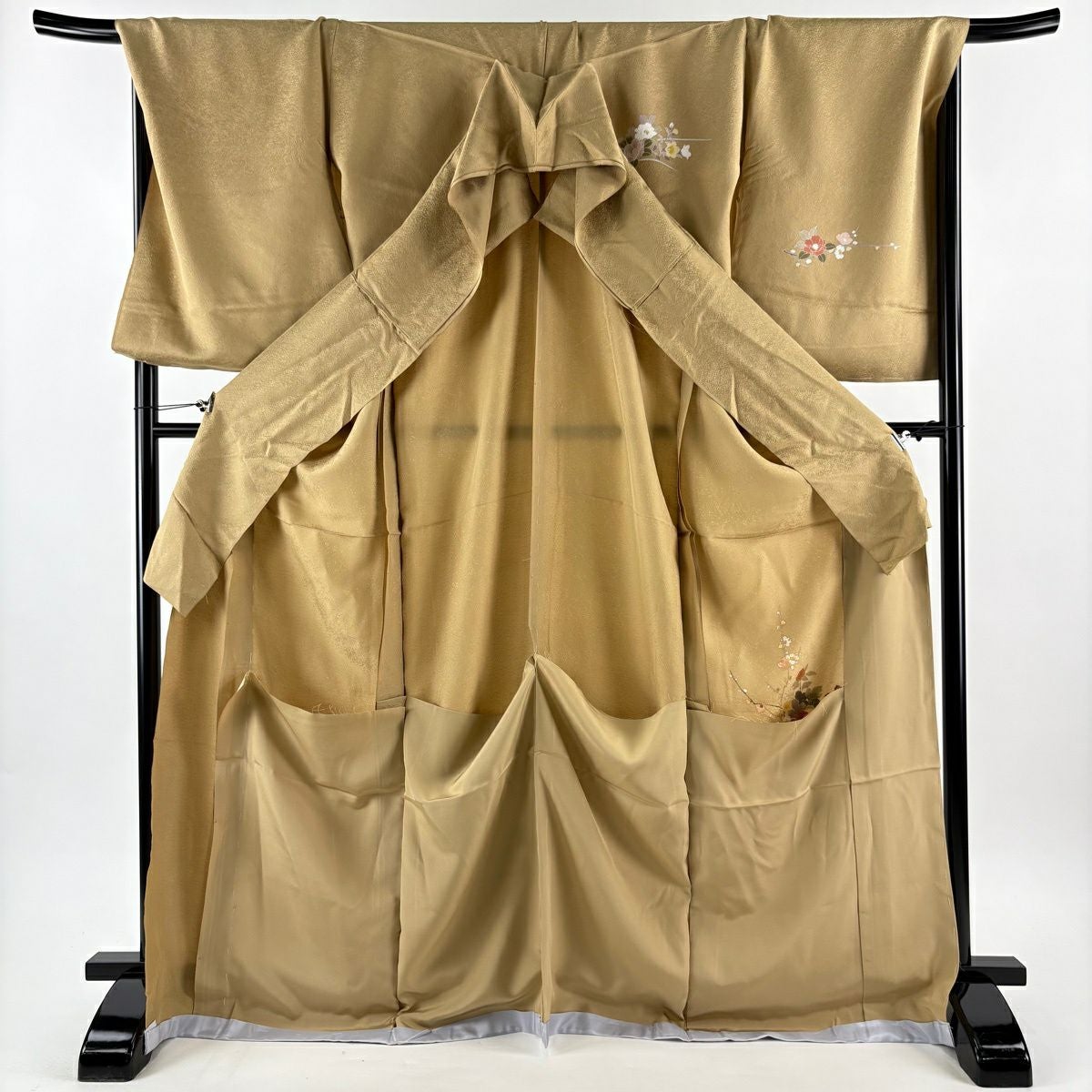 色留袖 身丈162cm 裄丈67cm M 袷 落款あり 遠山 枝桜 ぼかし ベージュ 正絹 秀品 三つ紋