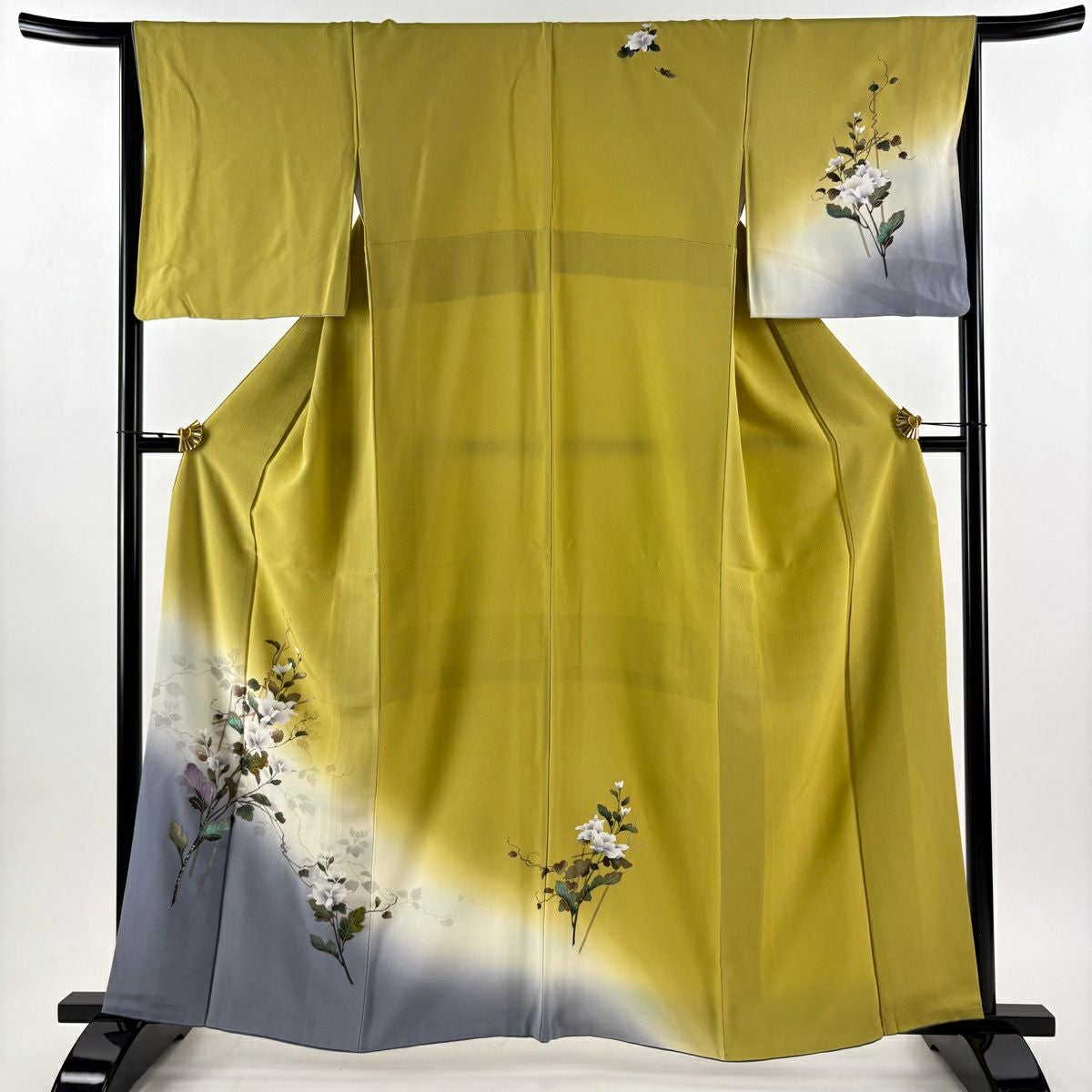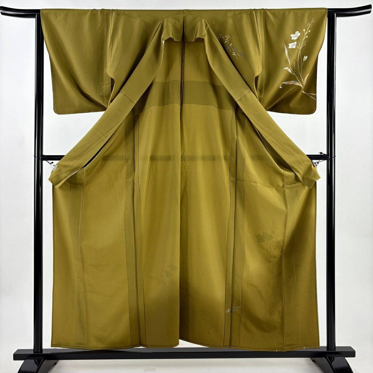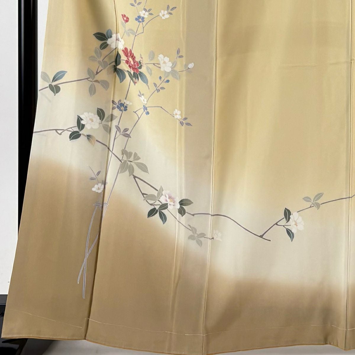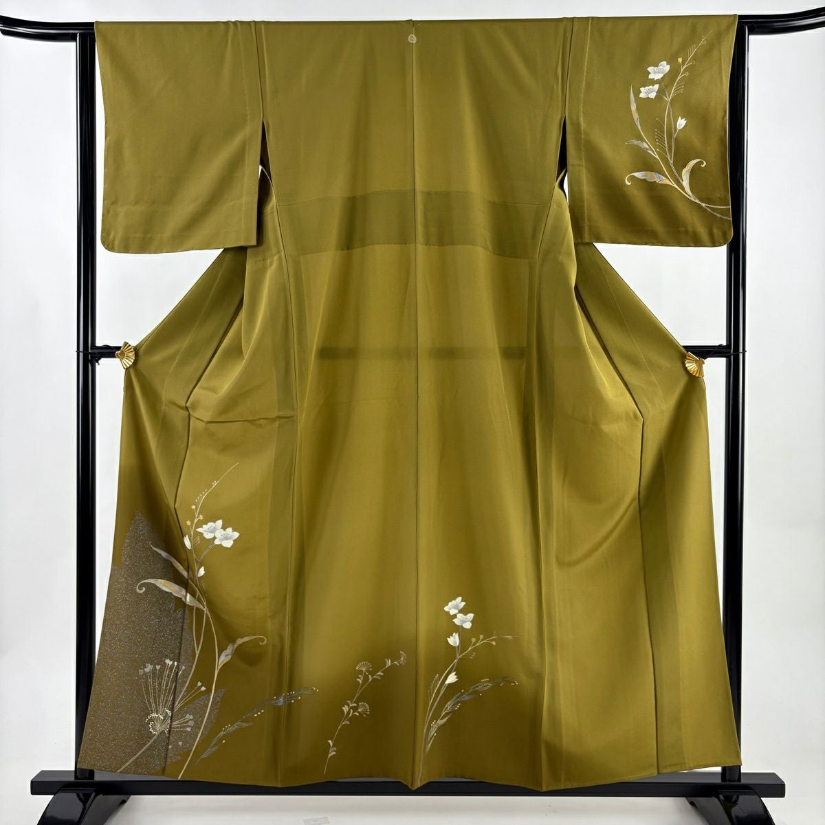 付下げ 身丈162cm 裄丈66cm M 袷 鈴乃屋 枝花 シルエット 金銀彩 ぼかし からし色 正絹 秀品