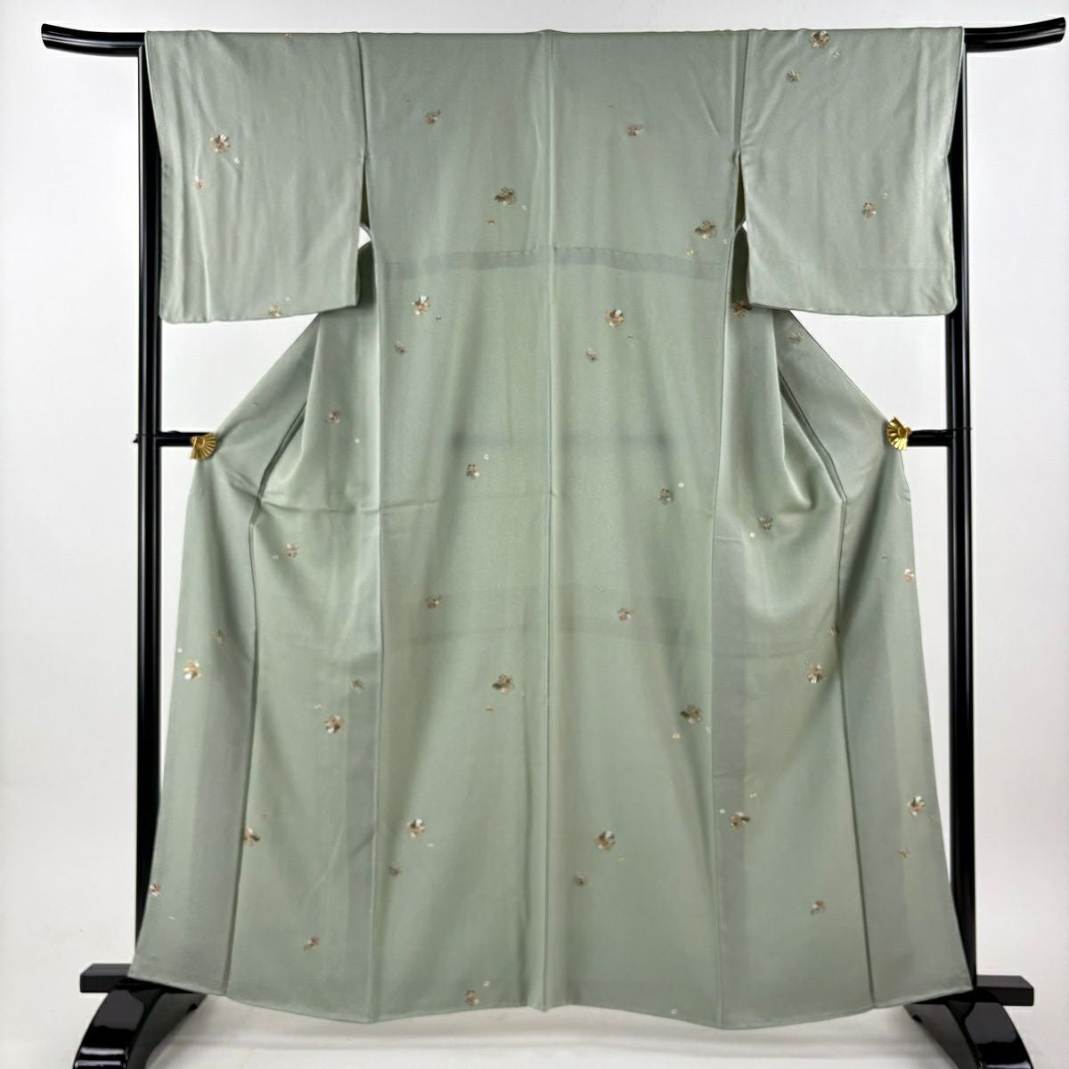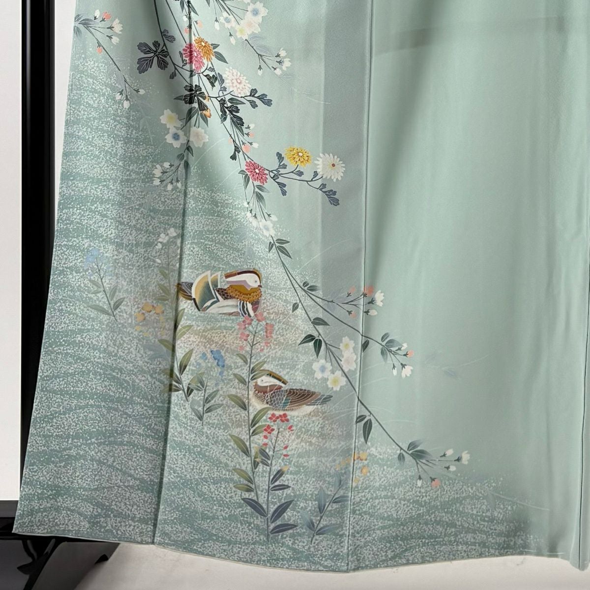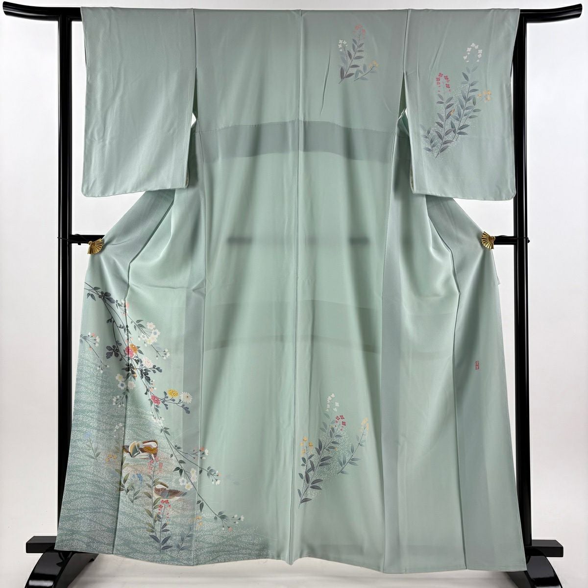 【美品】 付下げ 身丈163cm 裄丈62cm S 袷 落款あり 菊 鴛鴦 金銀彩 ぼかし 薄緑 正絹 秀品