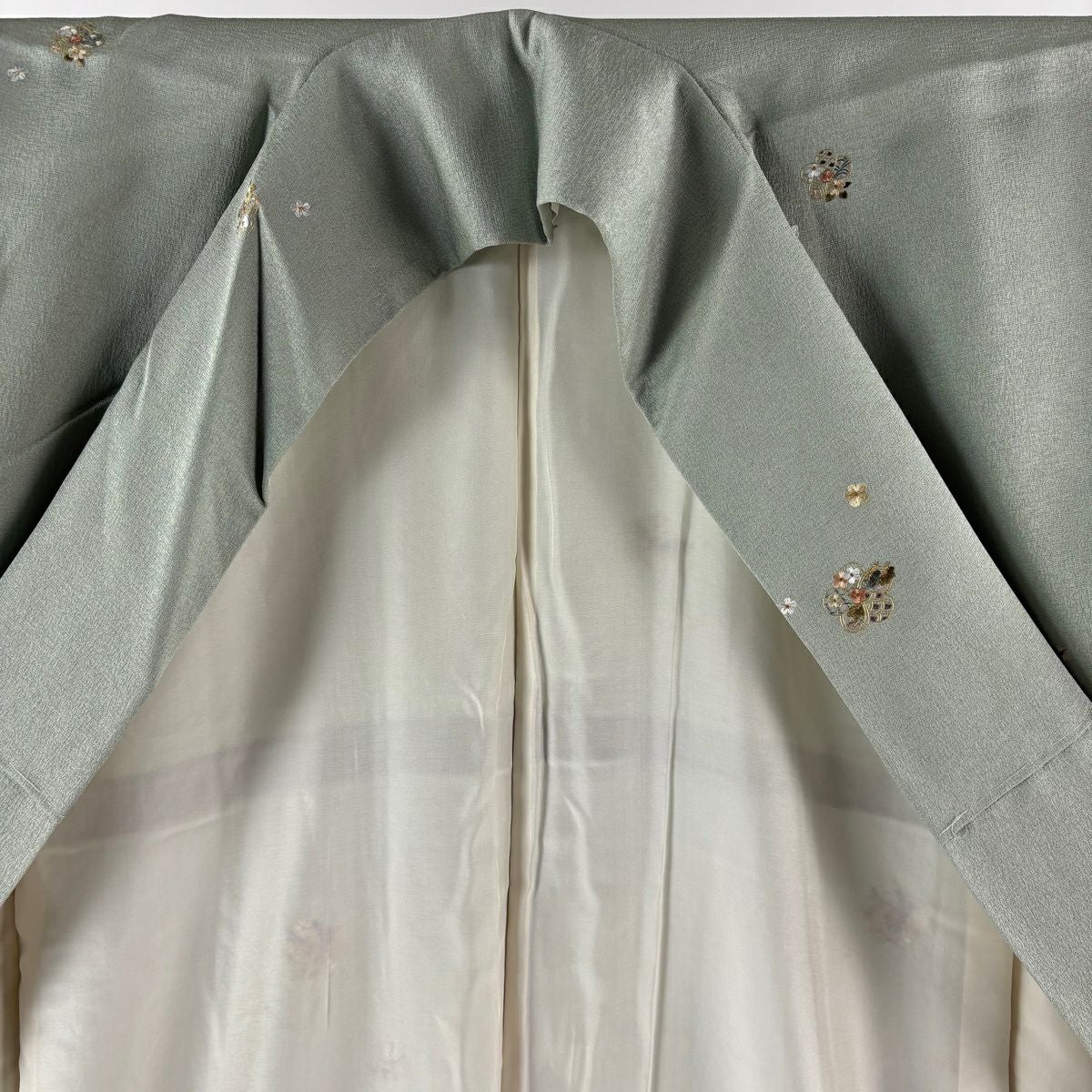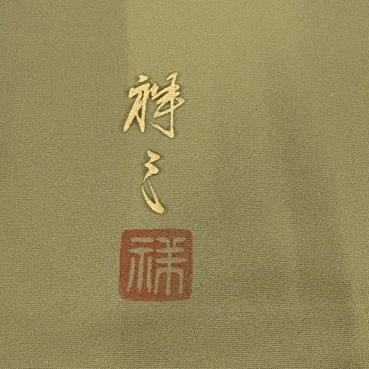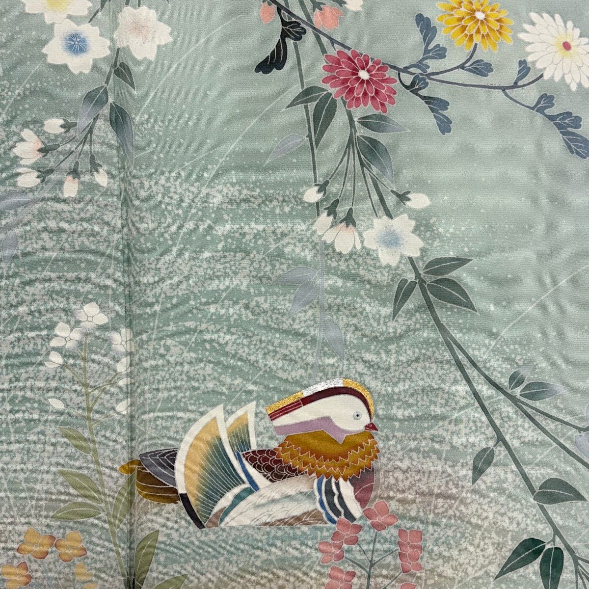 【美品】 付下げ 身丈163cm 裄丈62cm S 袷 落款あり 菊 鴛鴦 金銀彩 ぼかし 薄緑 正絹 秀品