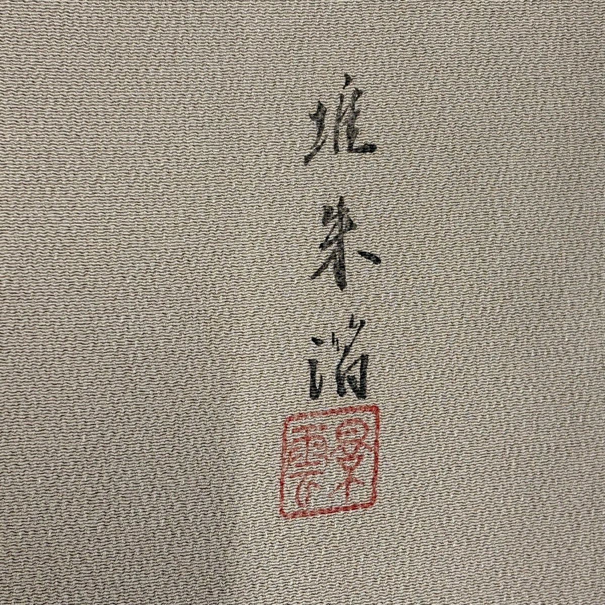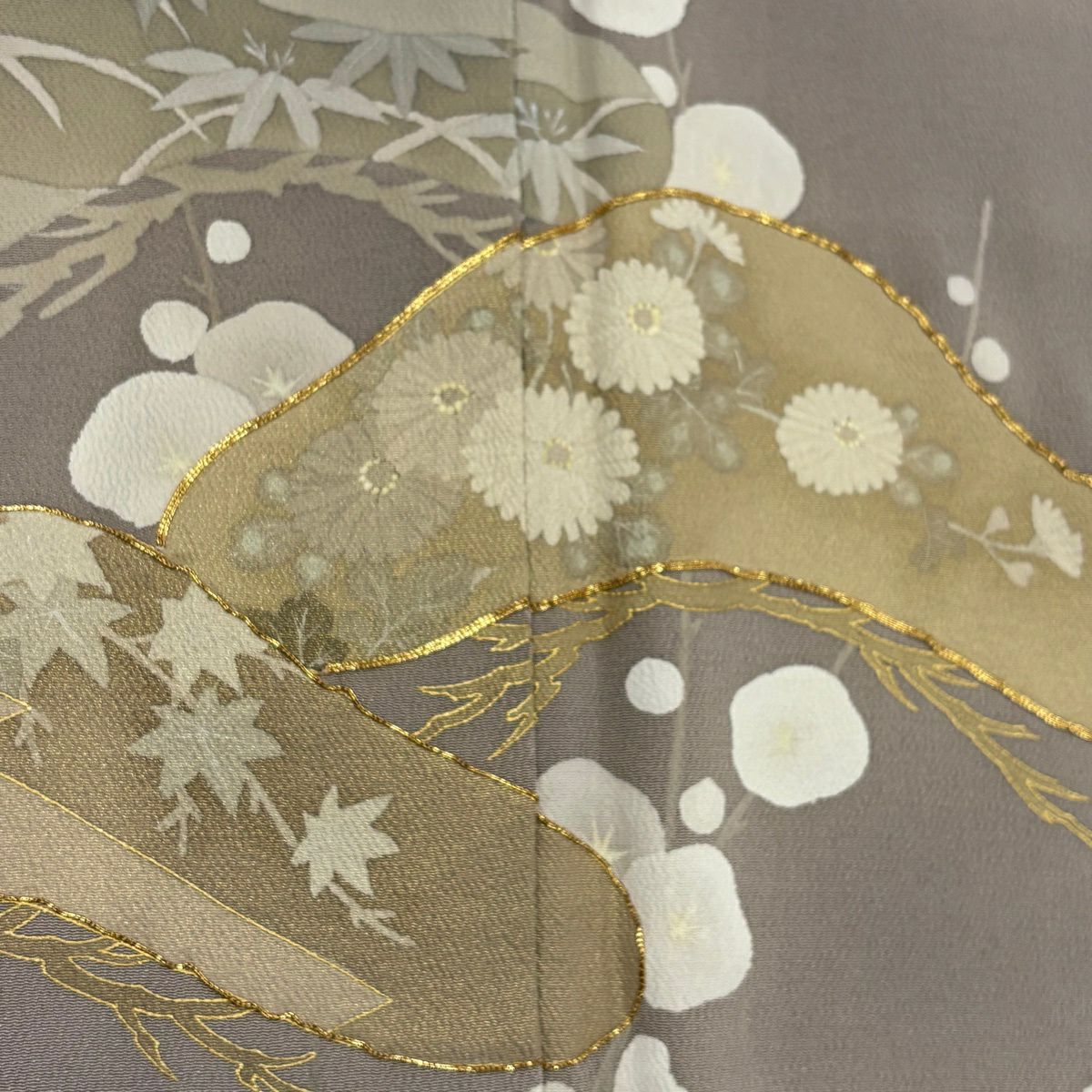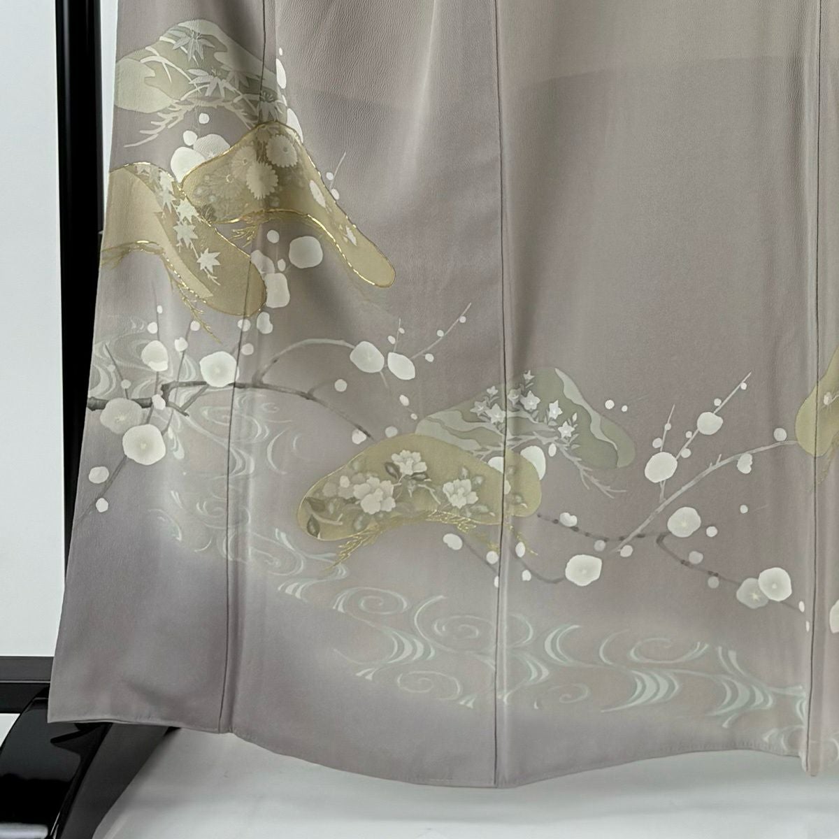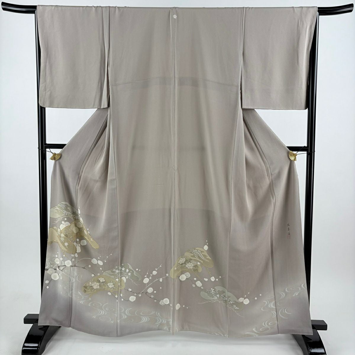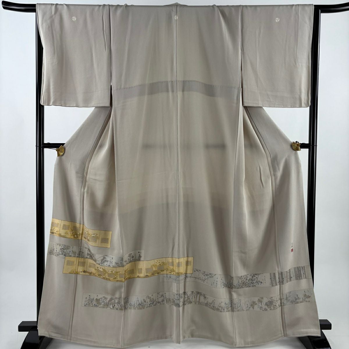 色留袖 身丈164cm 裄丈66cm M 袷 松尾光琳 落款あり 屏風 草花 金彩 灰茶 正絹 秀品 三つ紋