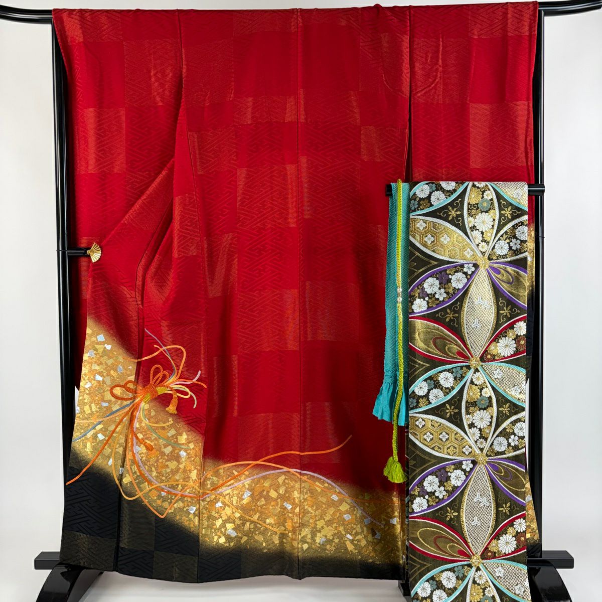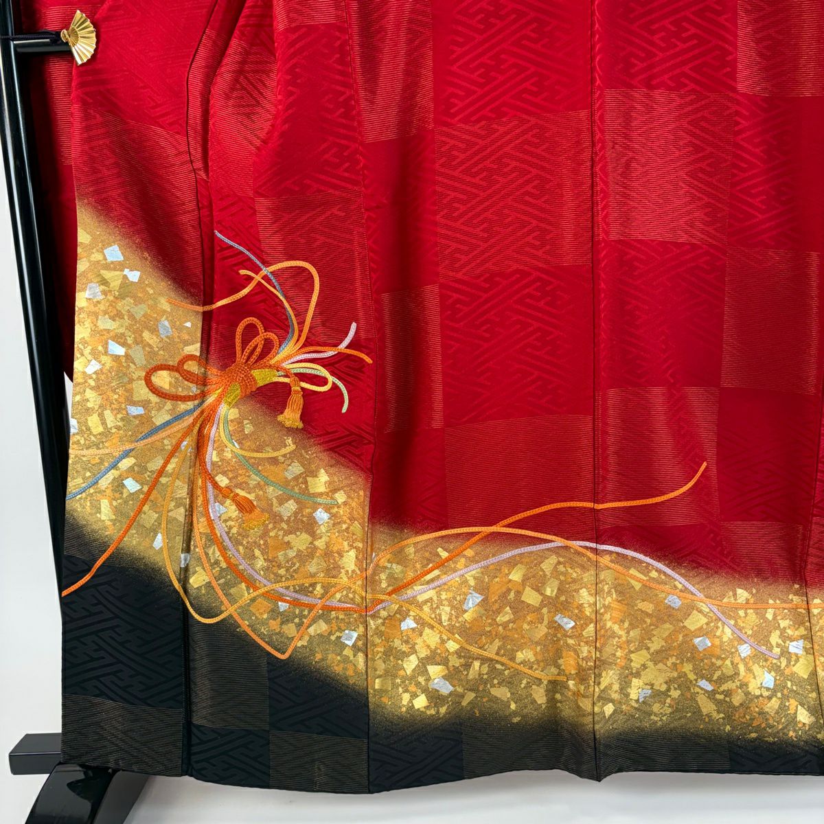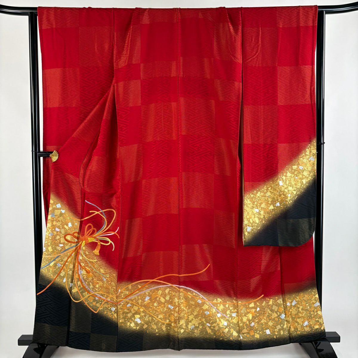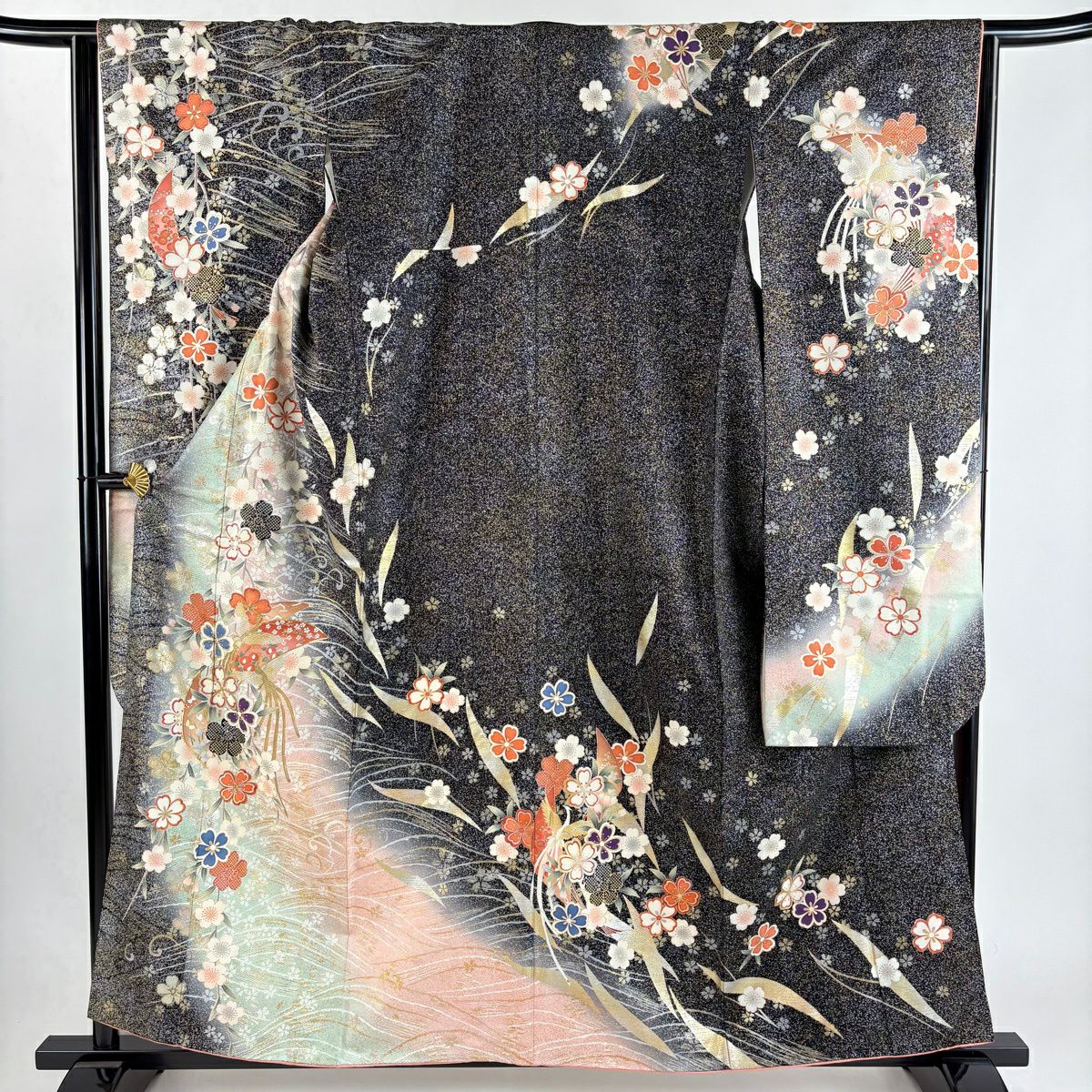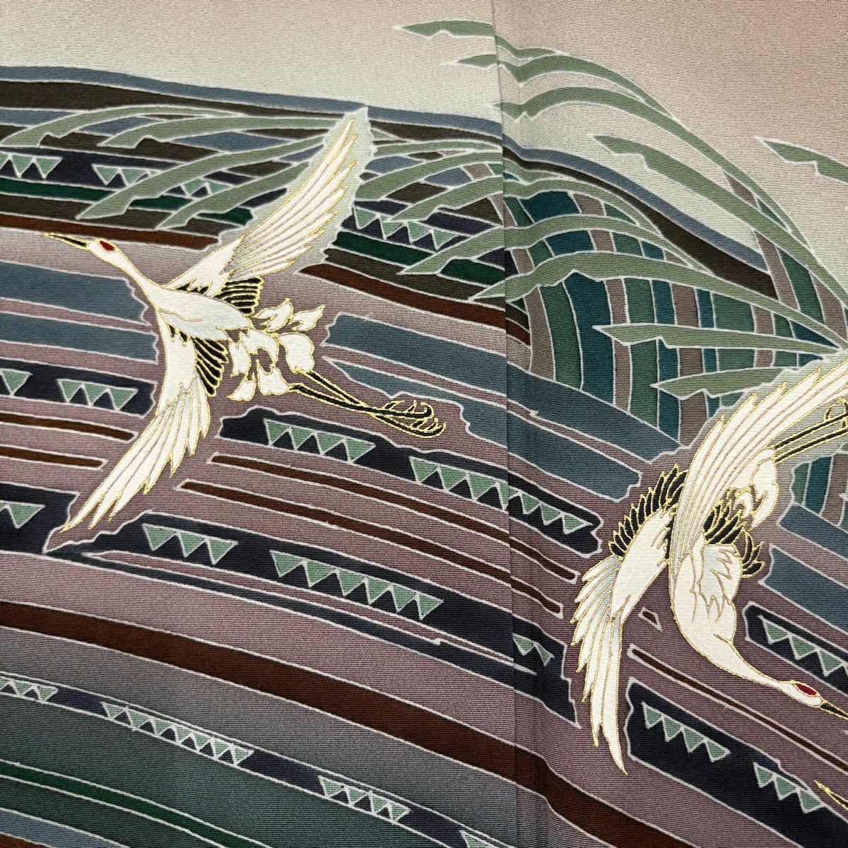 色留袖 身丈164cm 裄丈66cm M 袷 松尾光琳 落款あり 屏風 草花 金彩 灰茶 正絹 秀品 三つ紋