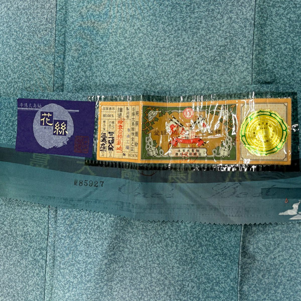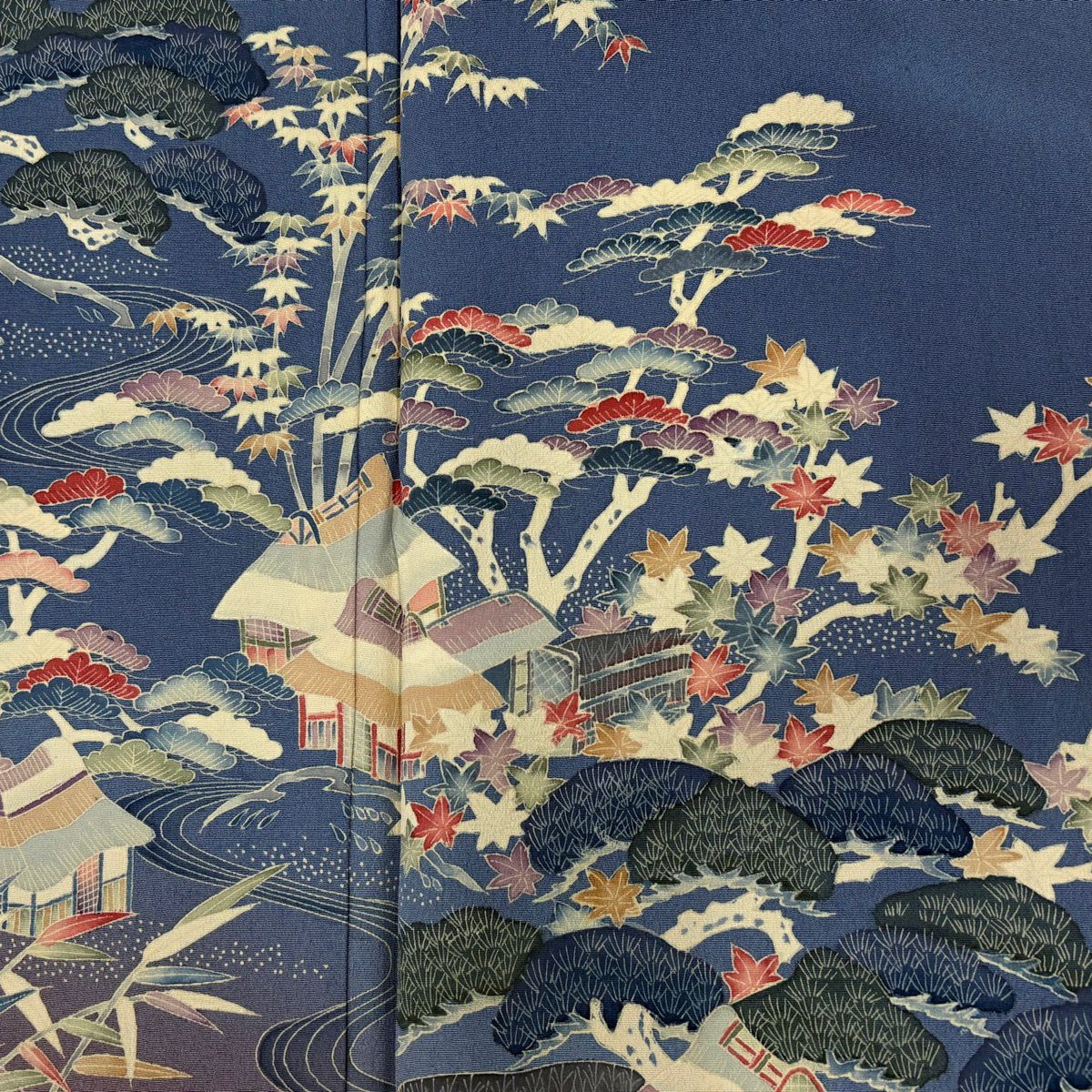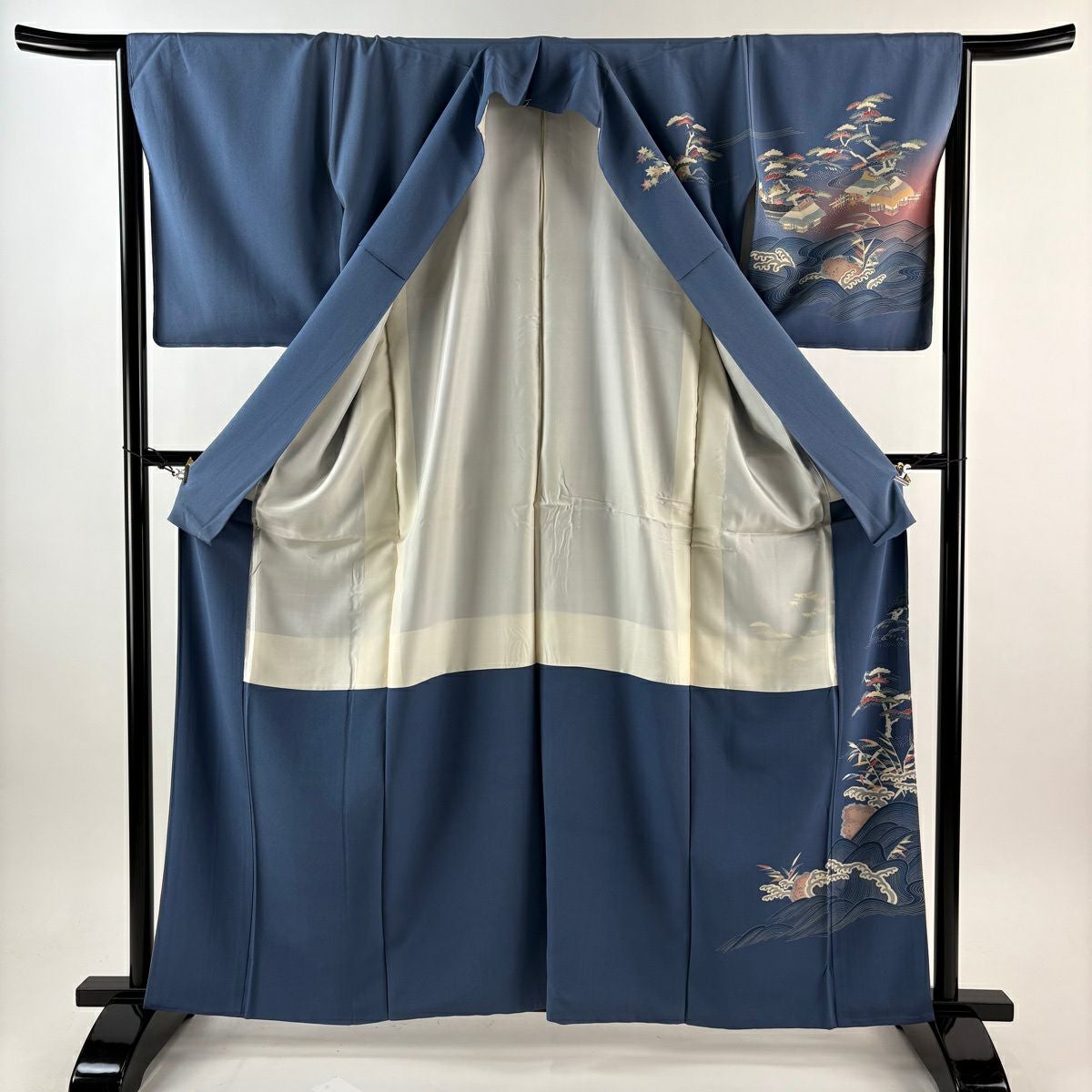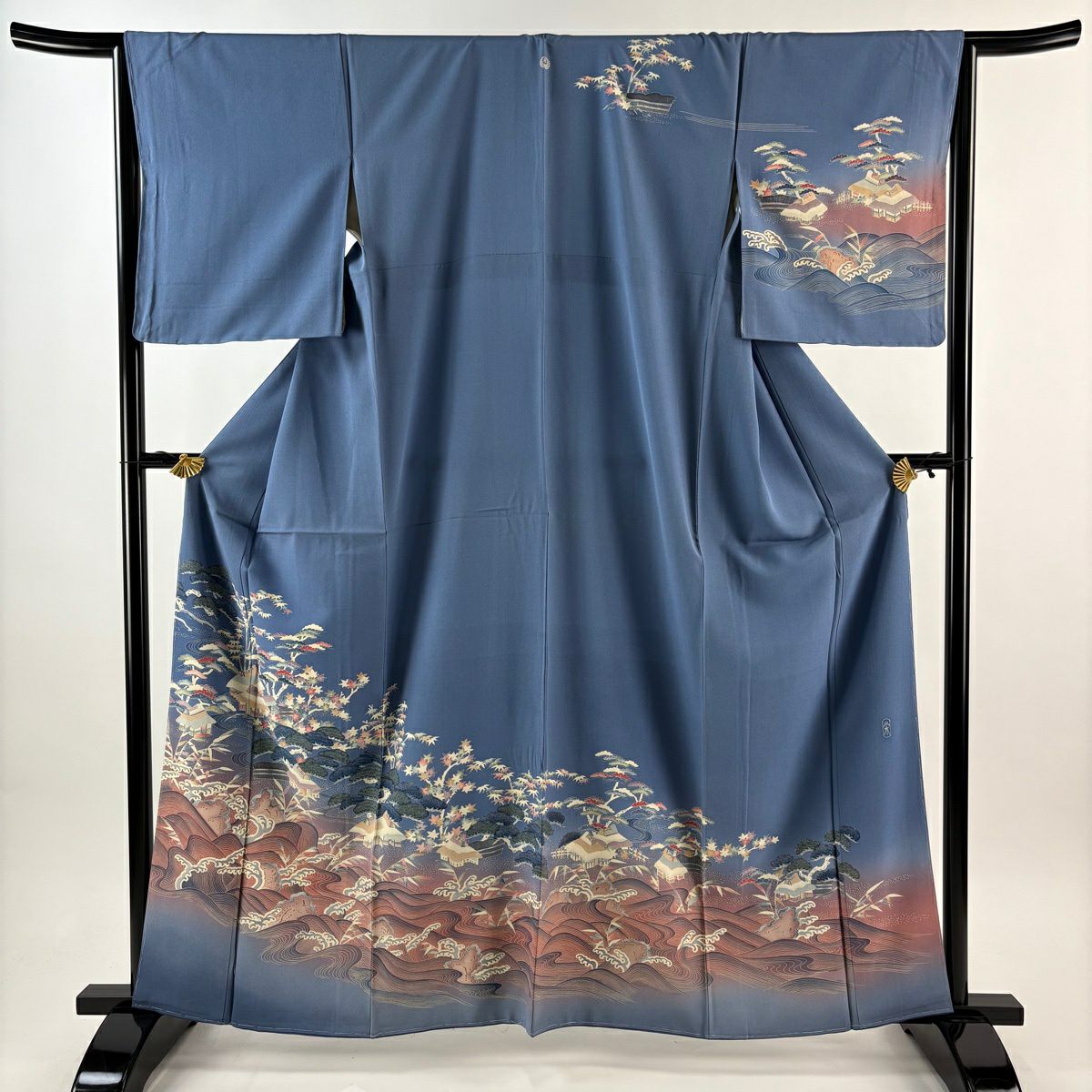 訪問着 身丈161.5cm 裄丈66cm M 袷 落款あり 松 波 ぼかし 染め分け 青 正絹 秀品 一つ紋