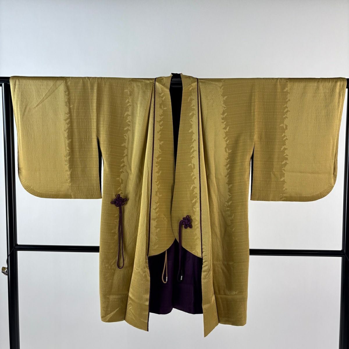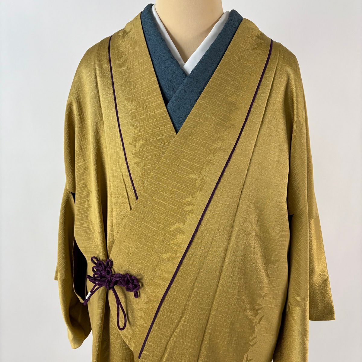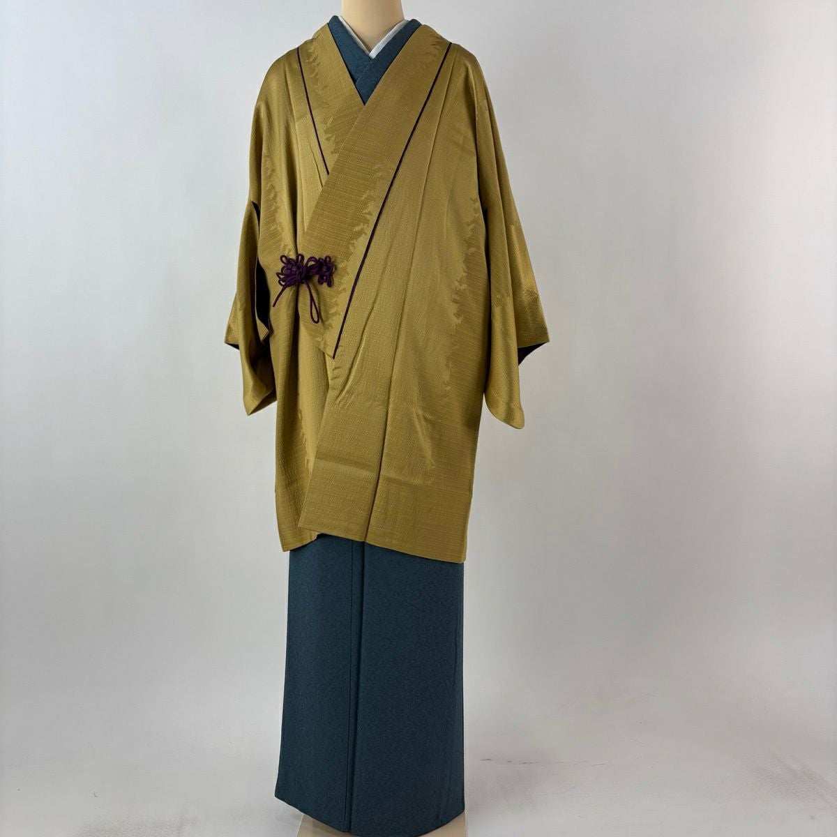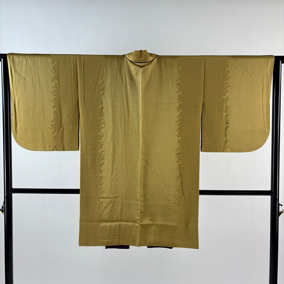 【美品】 道中着 身丈92cm 裄丈65cm M 和装コート 着物衿 シルエット 横縞 からし色 正絹 秀品