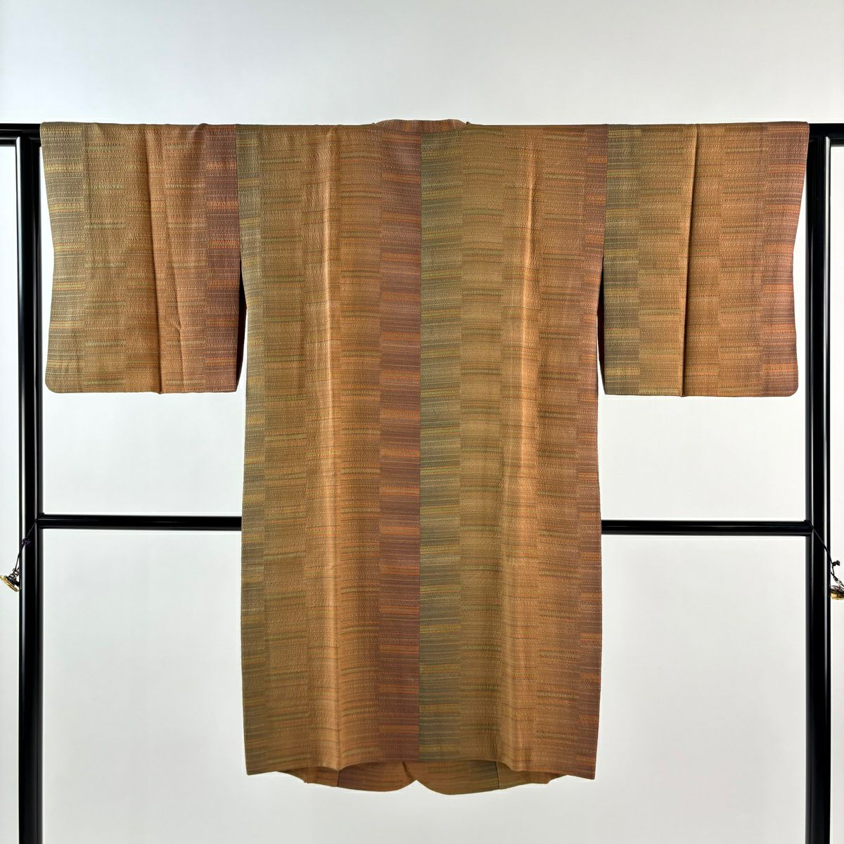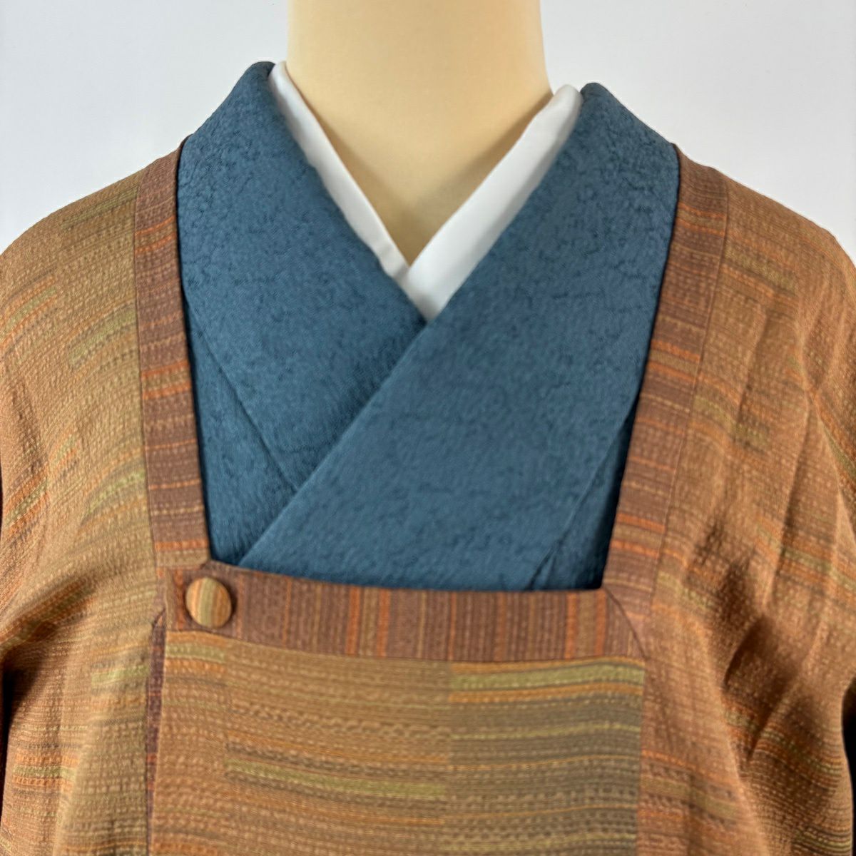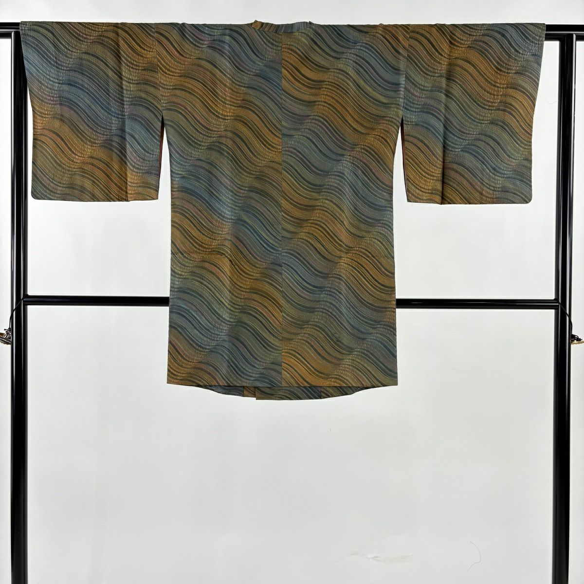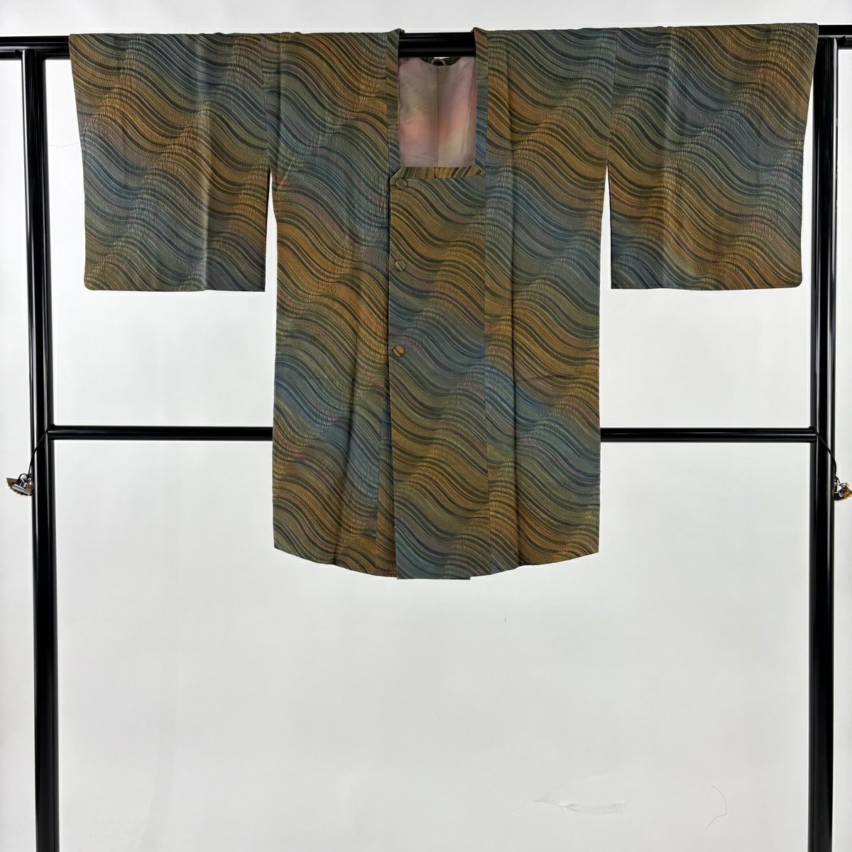 【美品】 道中着 身丈92cm 裄丈65cm M 和装コート 着物衿 シルエット 横縞 からし色 正絹 秀品