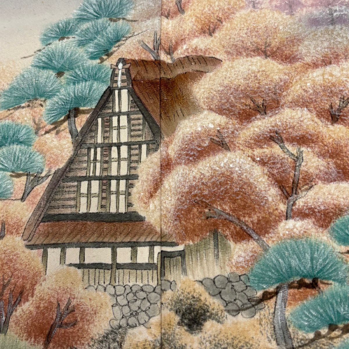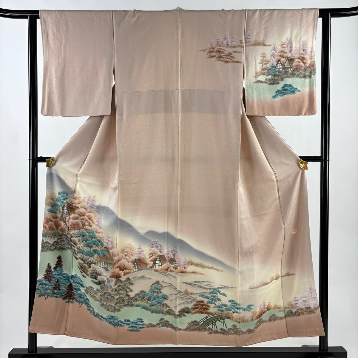 訪問着 身丈152.5cm 裄丈62cm S 袷 落款あり 建物 松 ぼかし 薄ピンク 正絹 秀品 一つ紋
