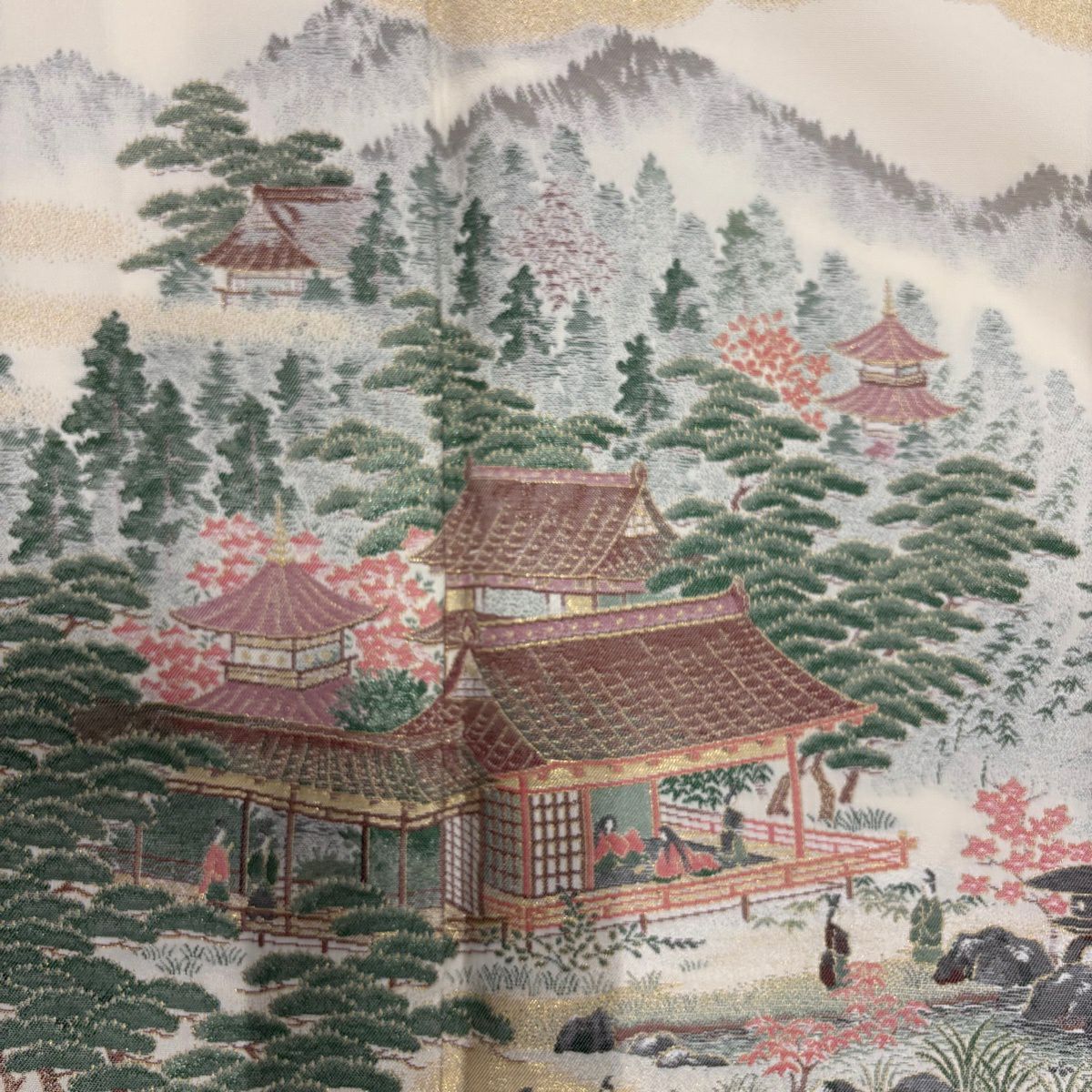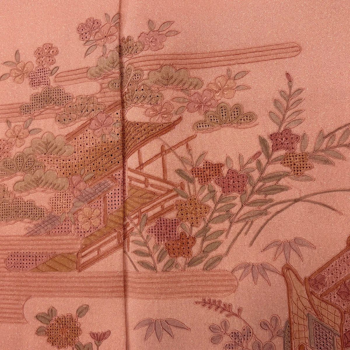 【美品】 付下げ 身丈152.5cm 裄丈64cm M 袷 蘇州刺繍 建物 松梅 刺繍 薄ピンク 正絹 秀品