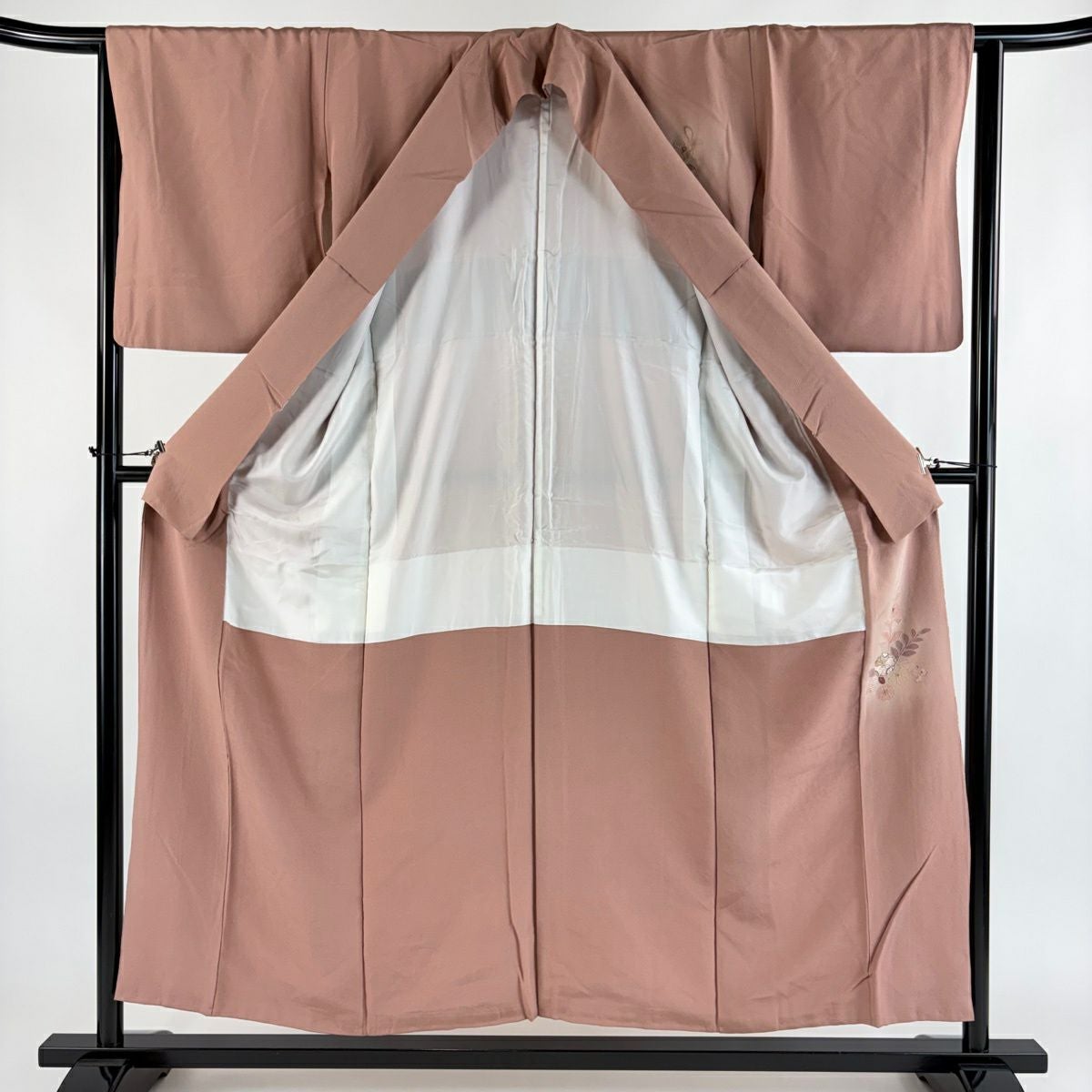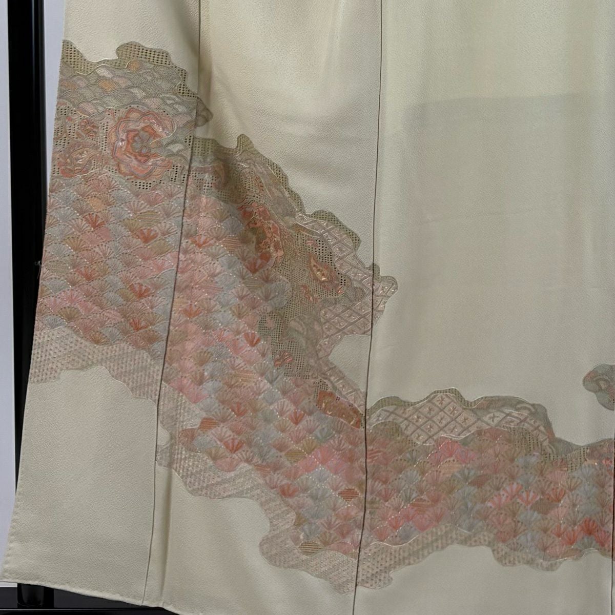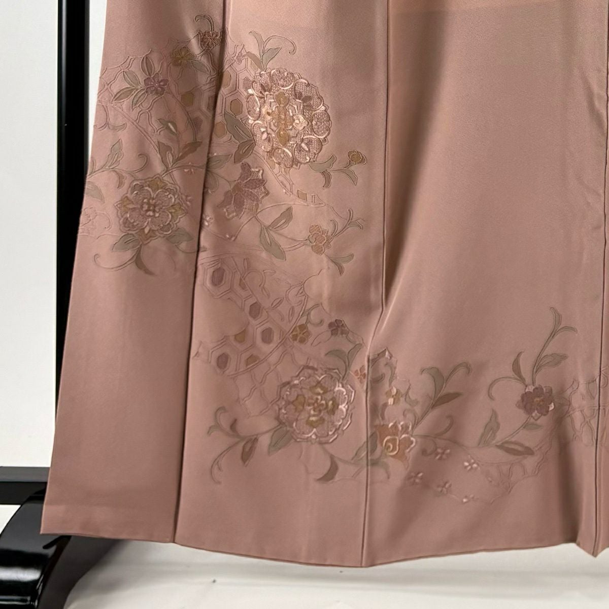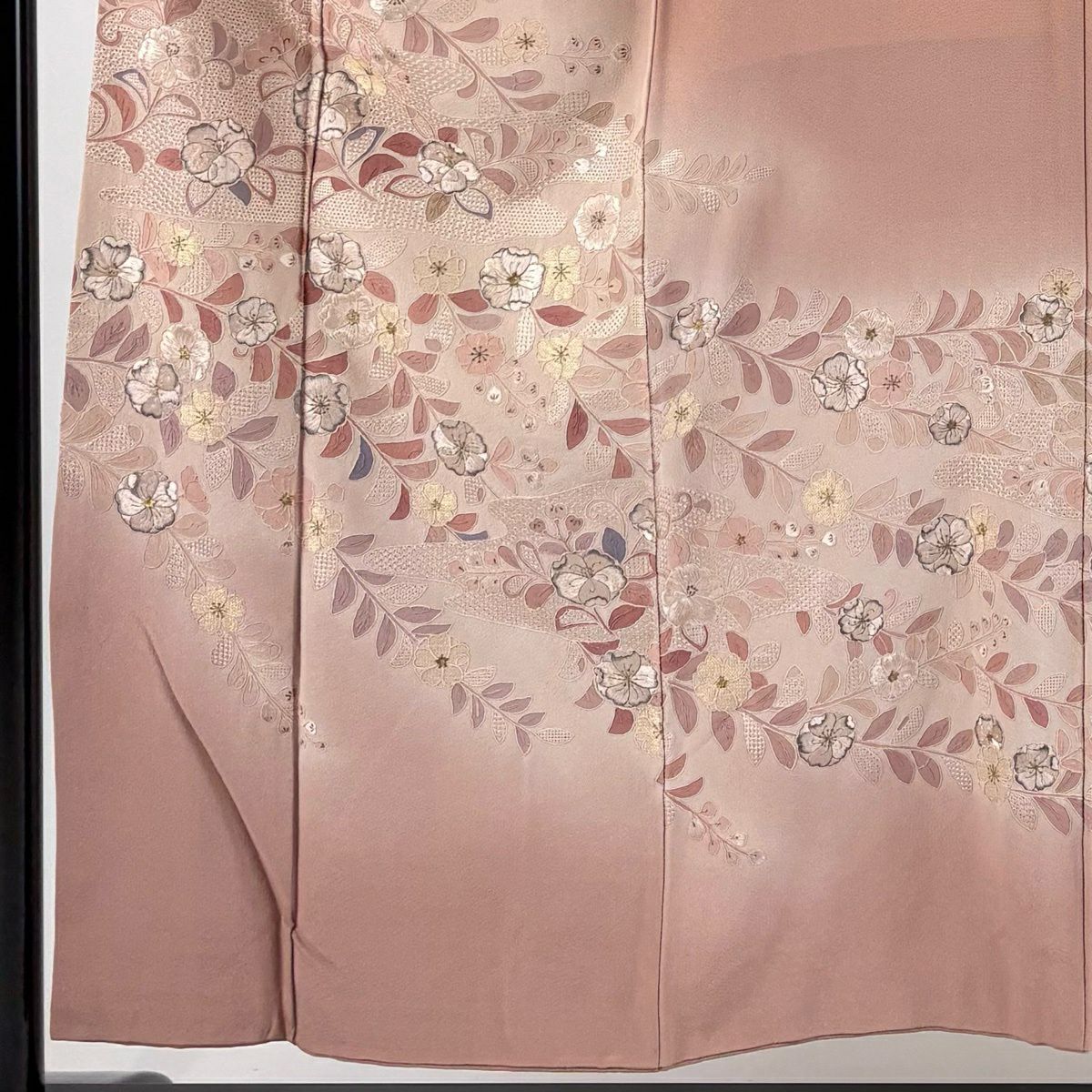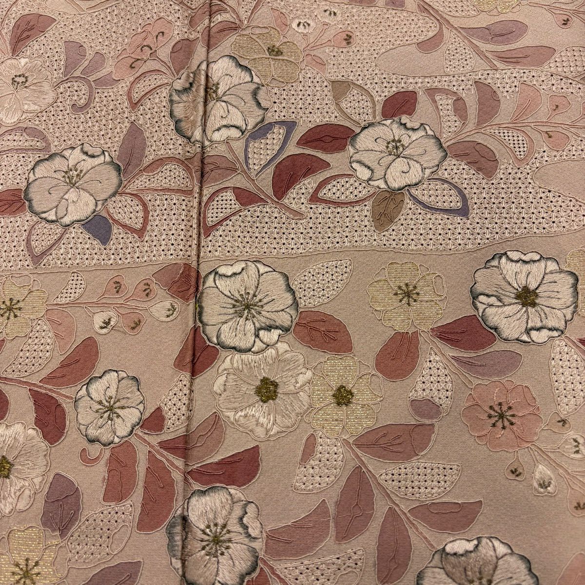 付下げ 身丈163cm 裄丈66.5cm M 袷 華文 花唐草 刺繍 金糸 ピンクベージュ 正絹 秀品