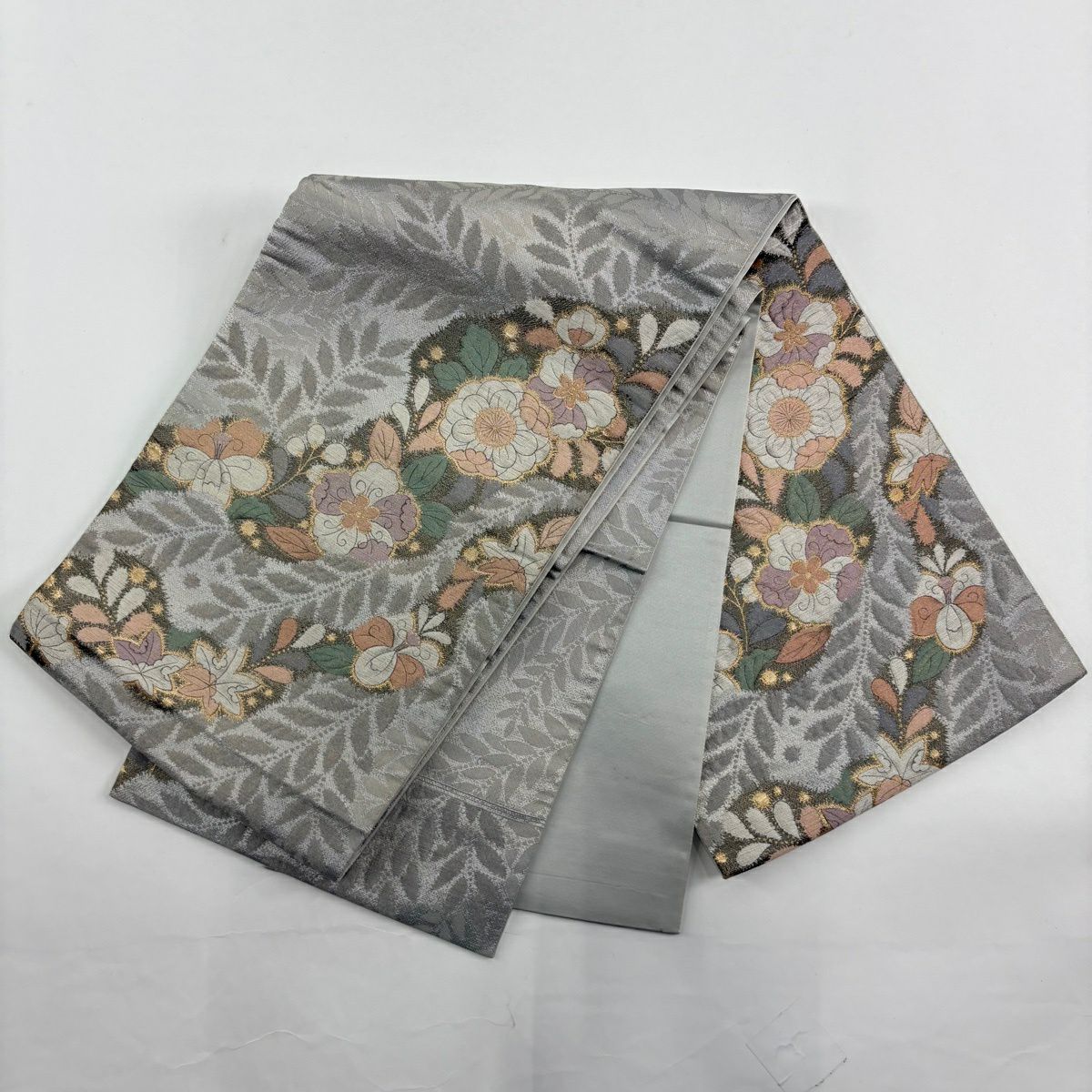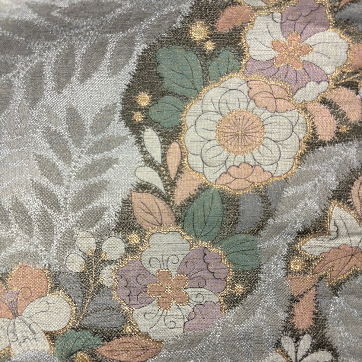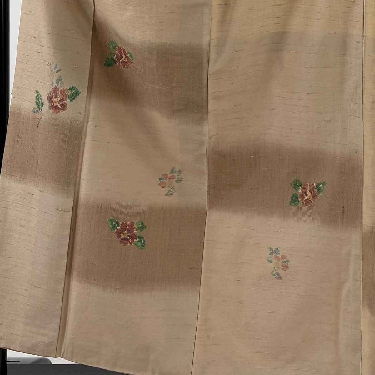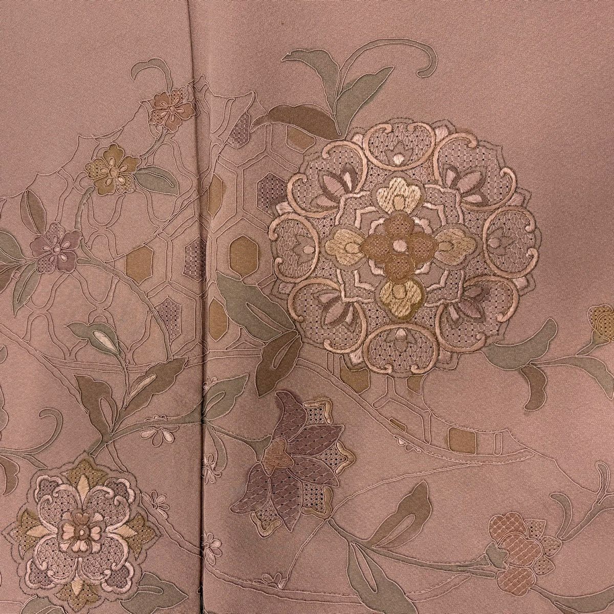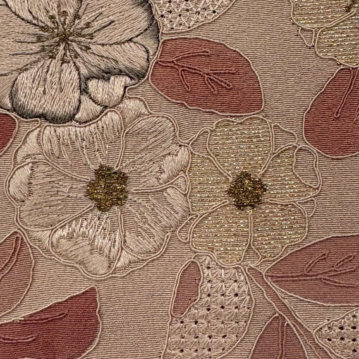 付下げ 身丈163cm 裄丈66.5cm M 袷 華文 花唐草 刺繍 金糸 ピンクベージュ 正絹 秀品
