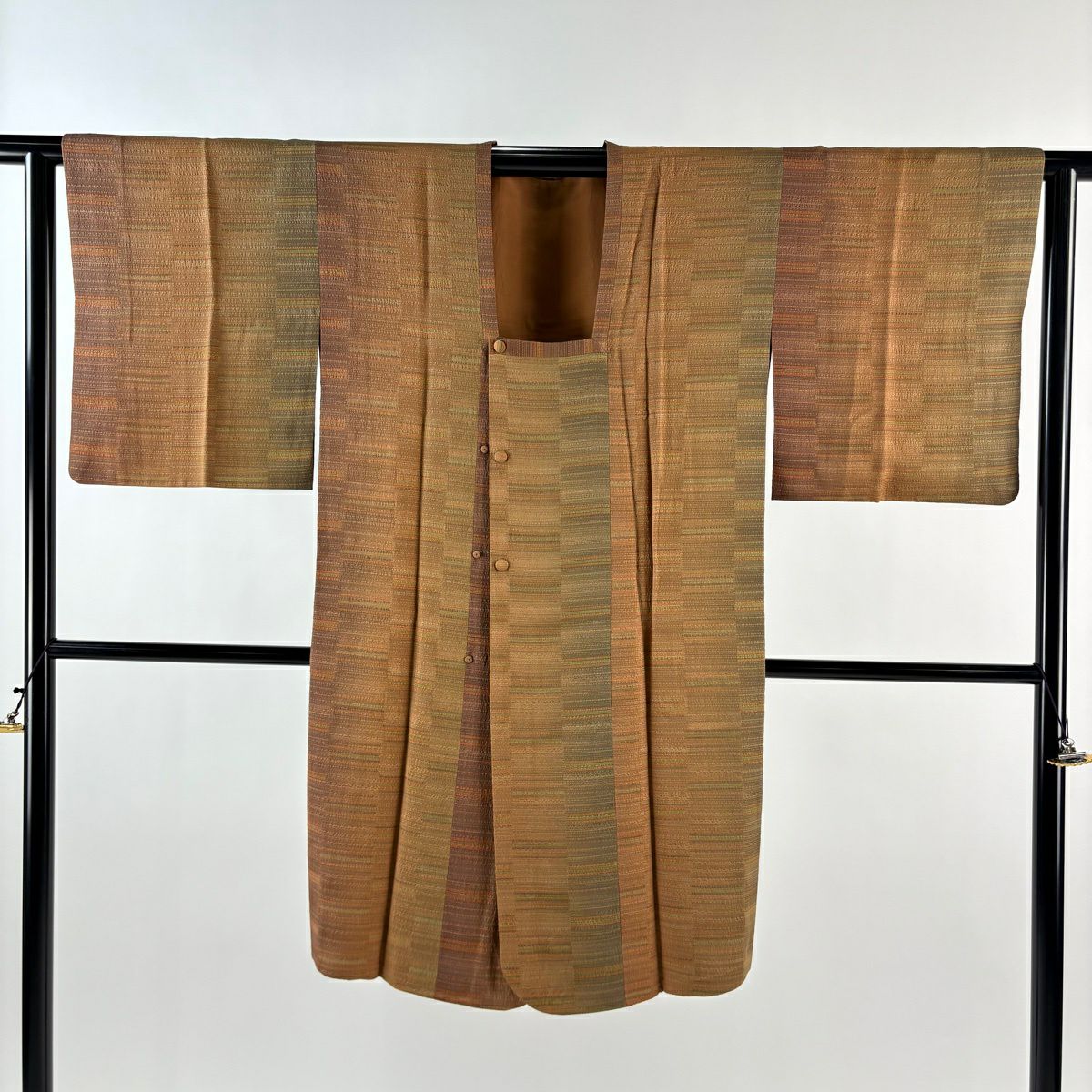 【美品】 道行 身丈108cm 裄丈63.5cm S 和装コート 角衿 縞 幾何学模様 山吹茶色 正絹 秀品