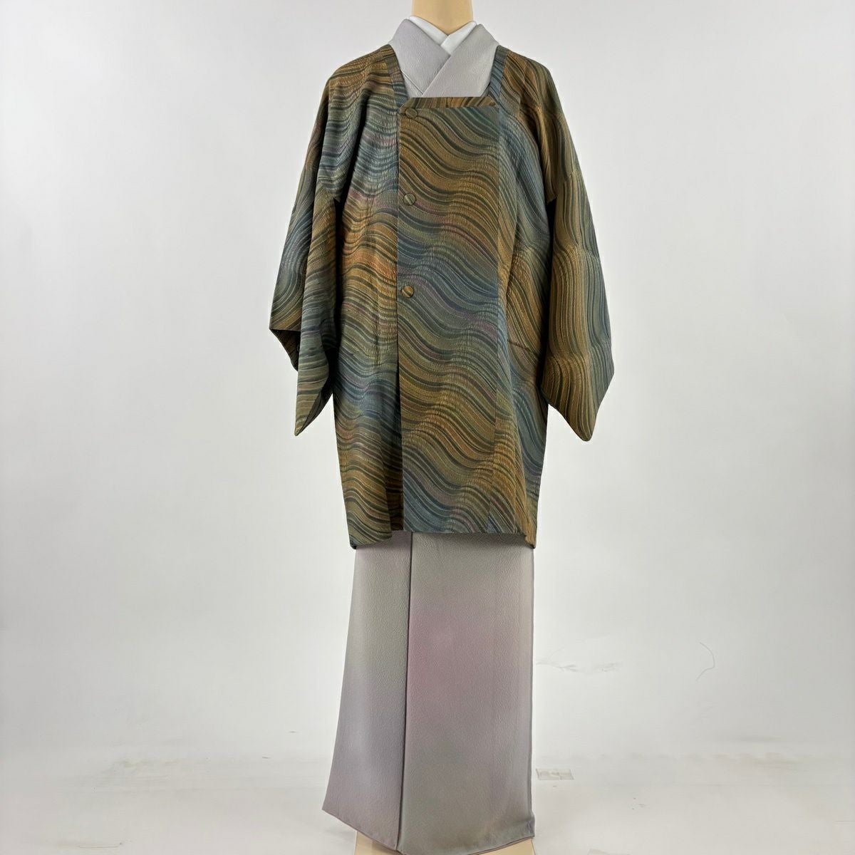 【美品】 道行 身丈88cm 裄丈62.5cm S 和装コート 角衿 落款あり よろけ縞 薄茶色 正絹 秀品