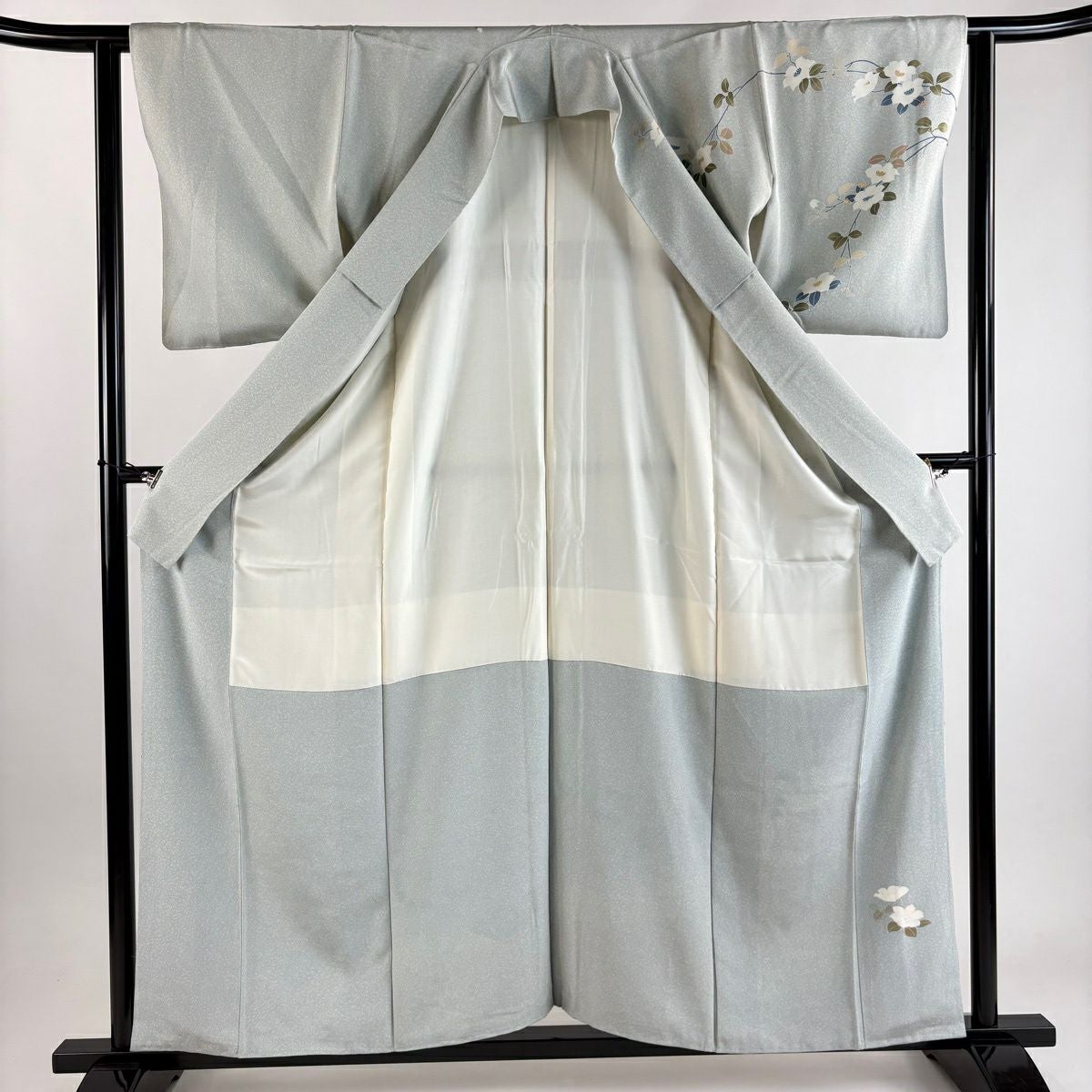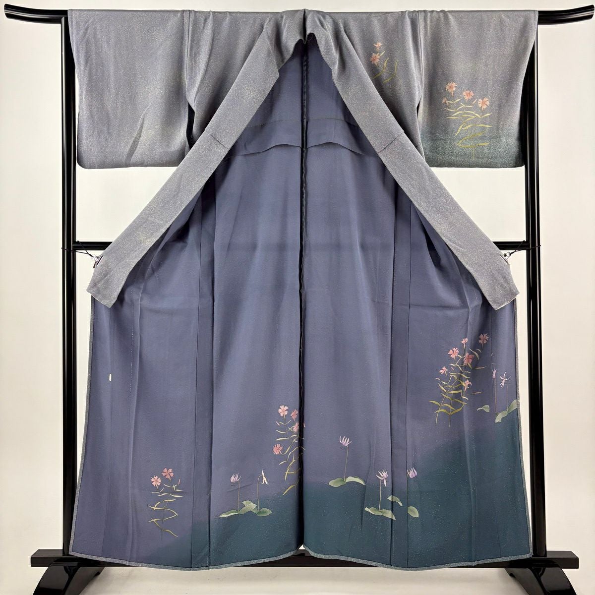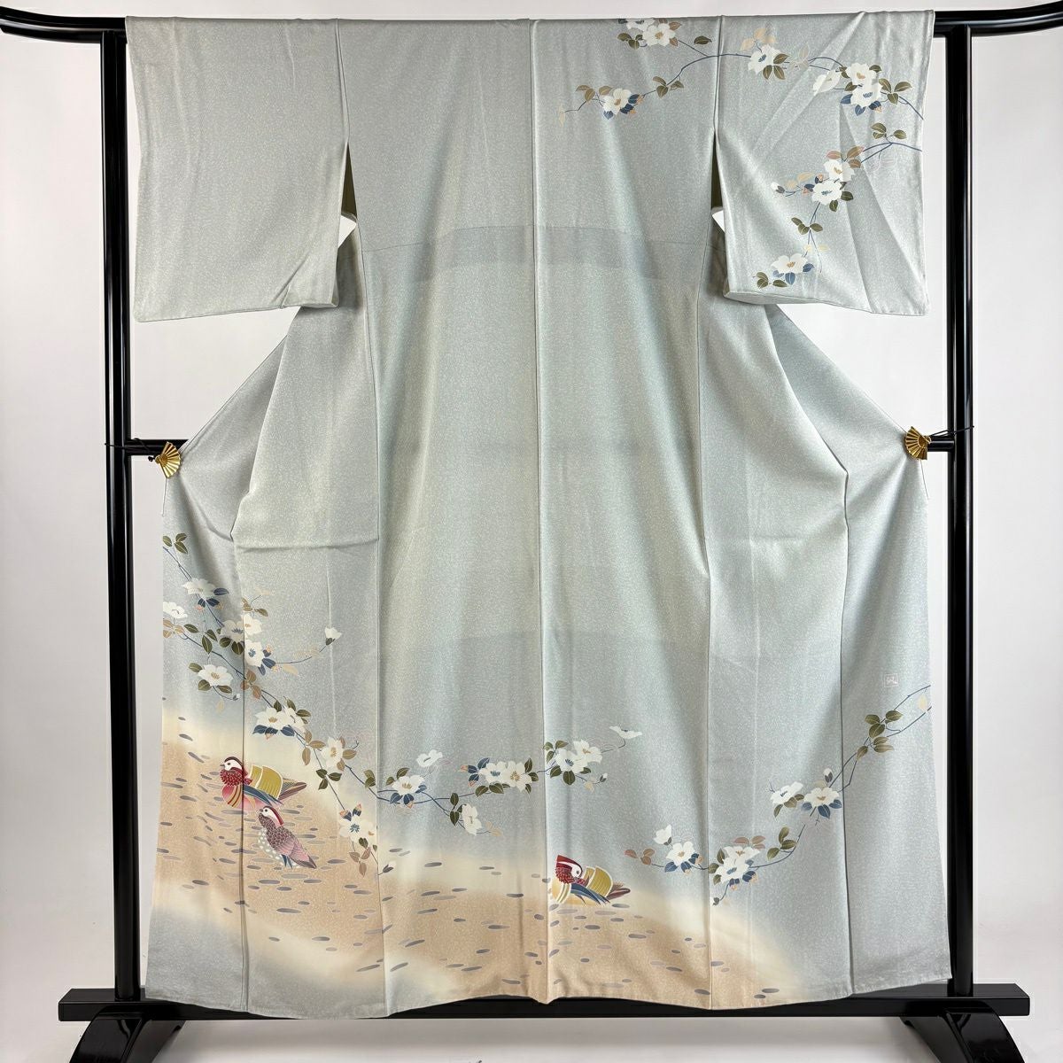 訪問着 身丈157.5cm 裄丈61cm S 袷 落款あり 鴛鴦 枝花 染め分け ぼかし 青灰色 正絹 秀品