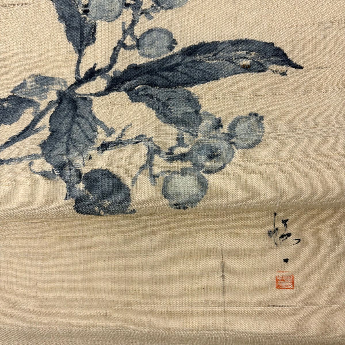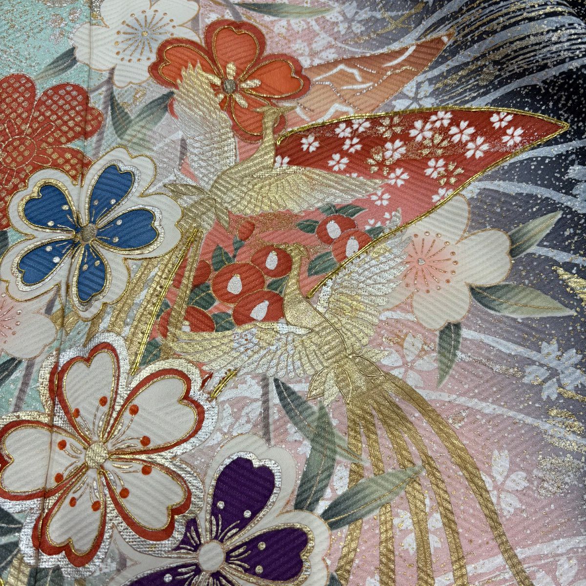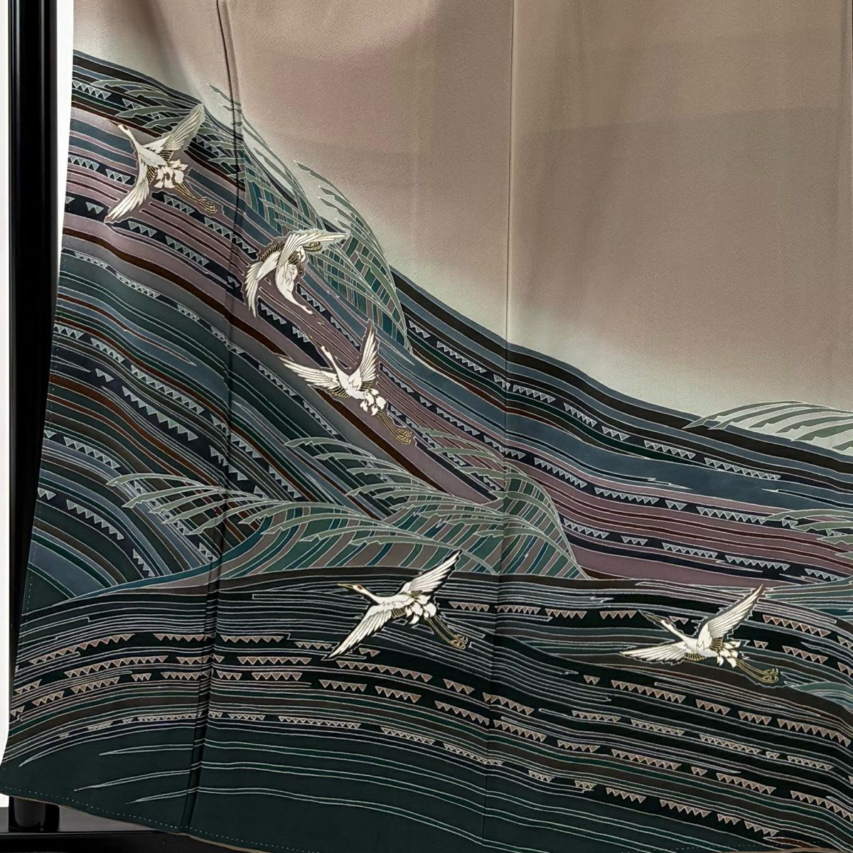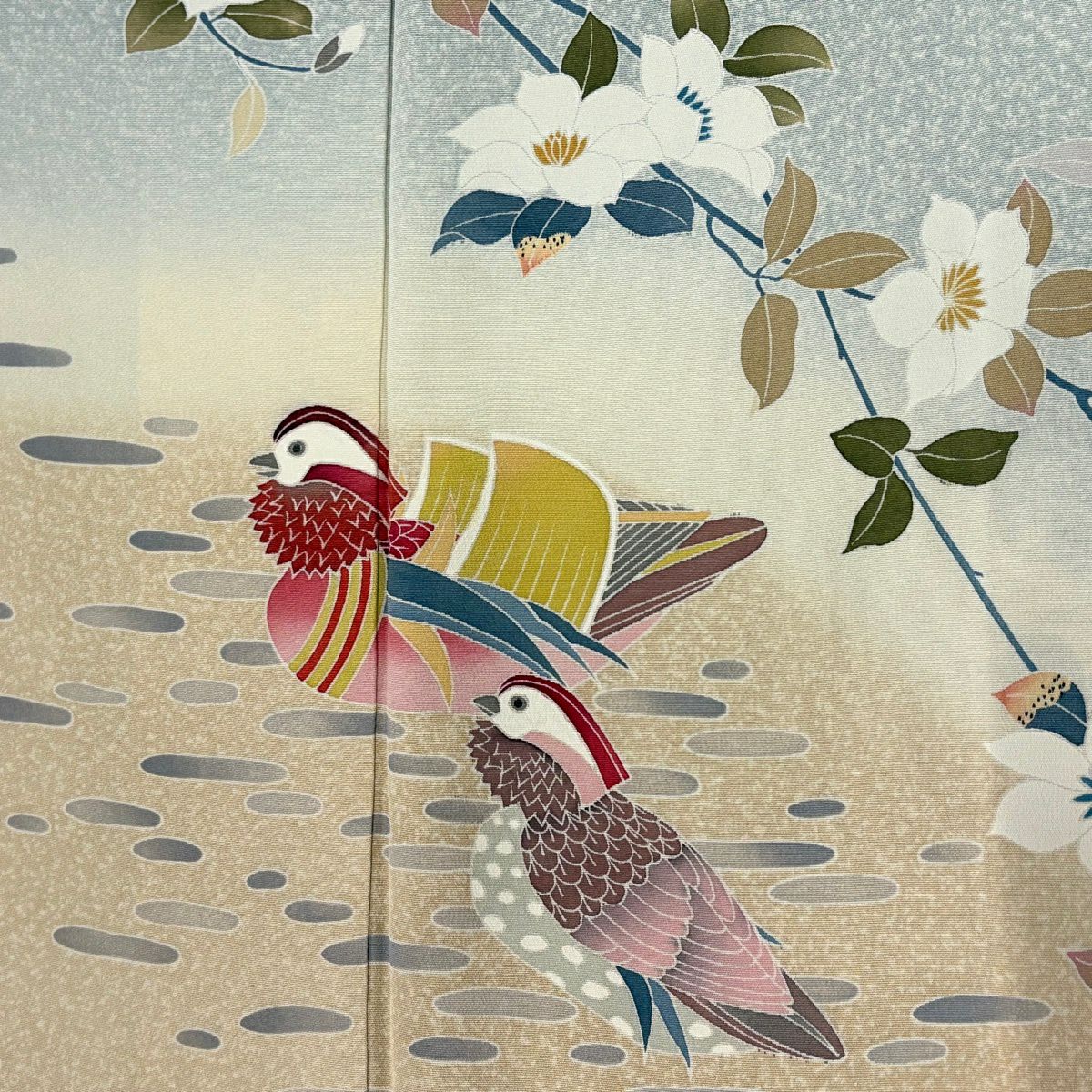 訪問着 身丈157.5cm 裄丈61cm S 袷 落款あり 鴛鴦 枝花 染め分け ぼかし 青灰色 正絹 秀品