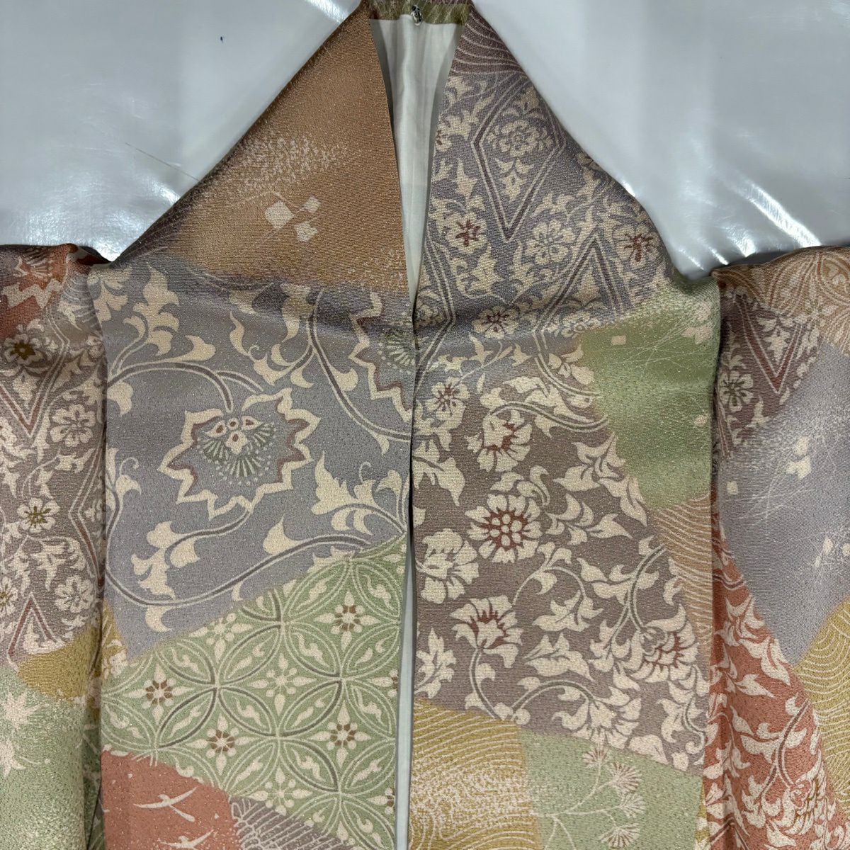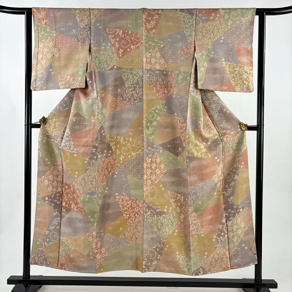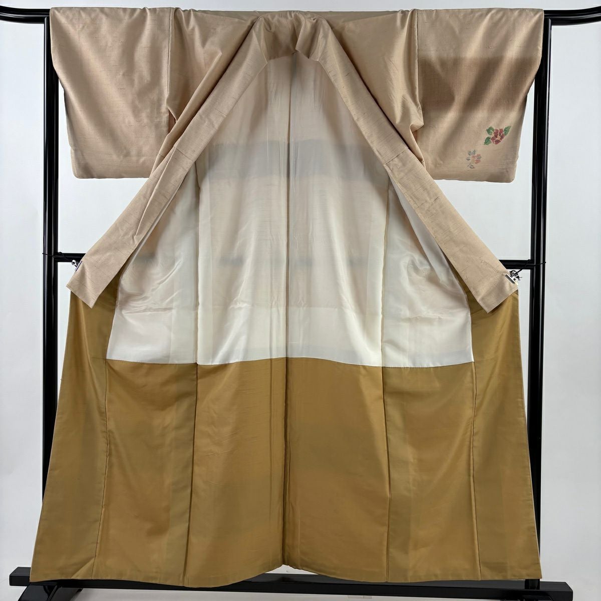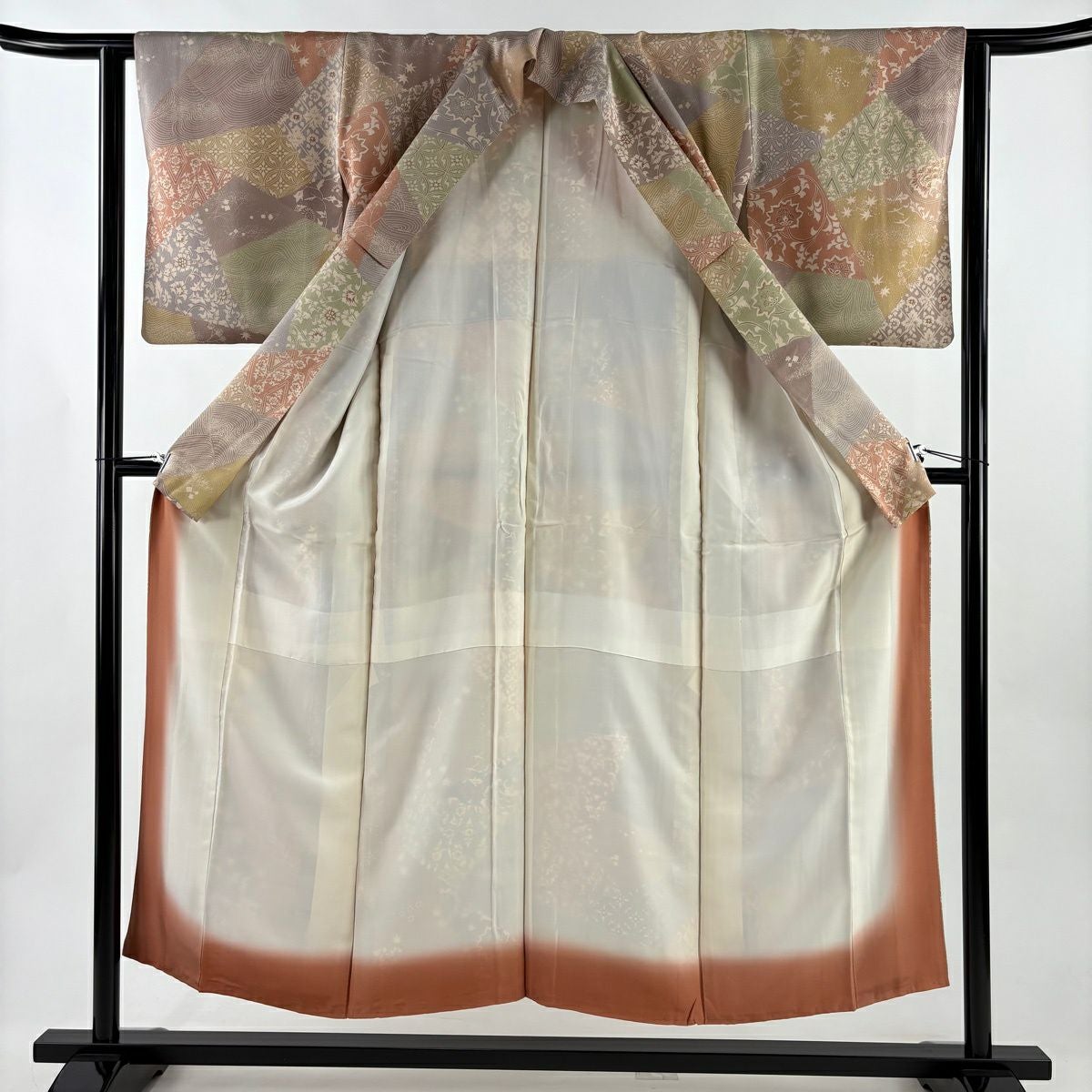 【美品】 付下げ 身丈158cm 裄丈65.5cm M 袷 紬地 変わり市松 草花 ベージュ 正絹 秀品