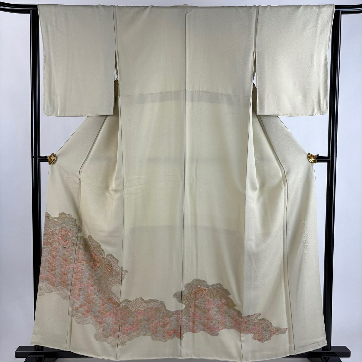 訪問着 身丈156cm 裄丈63cm S 袷 落款あり 菊 ヱ霞 金糸 金彩 ピンクベージュ 正絹 秀品
