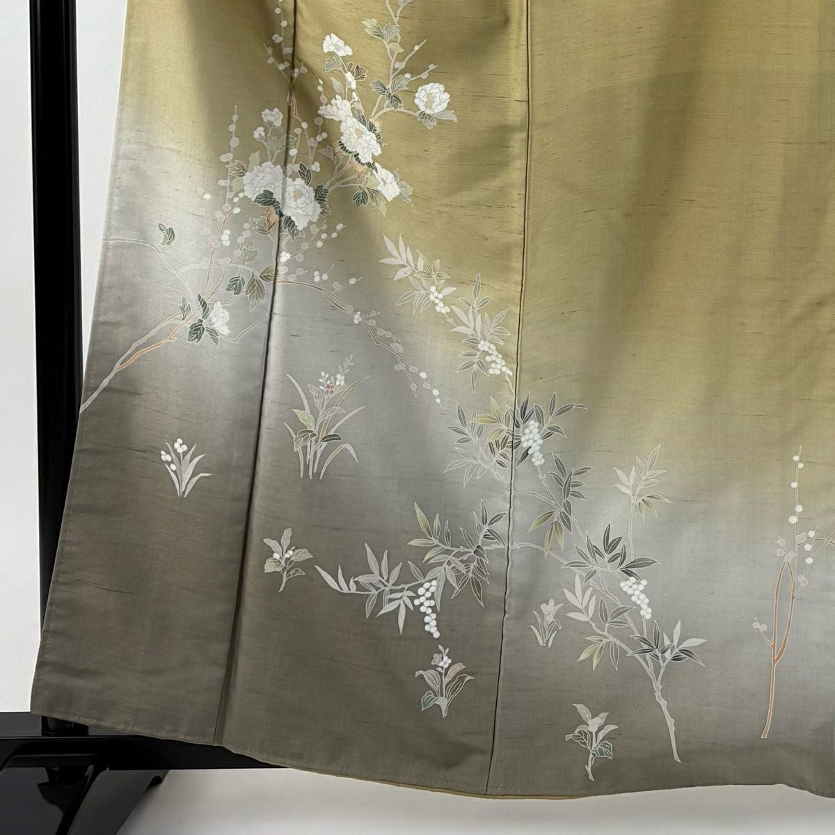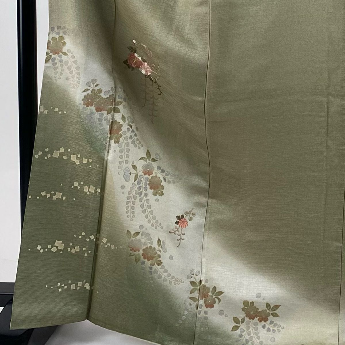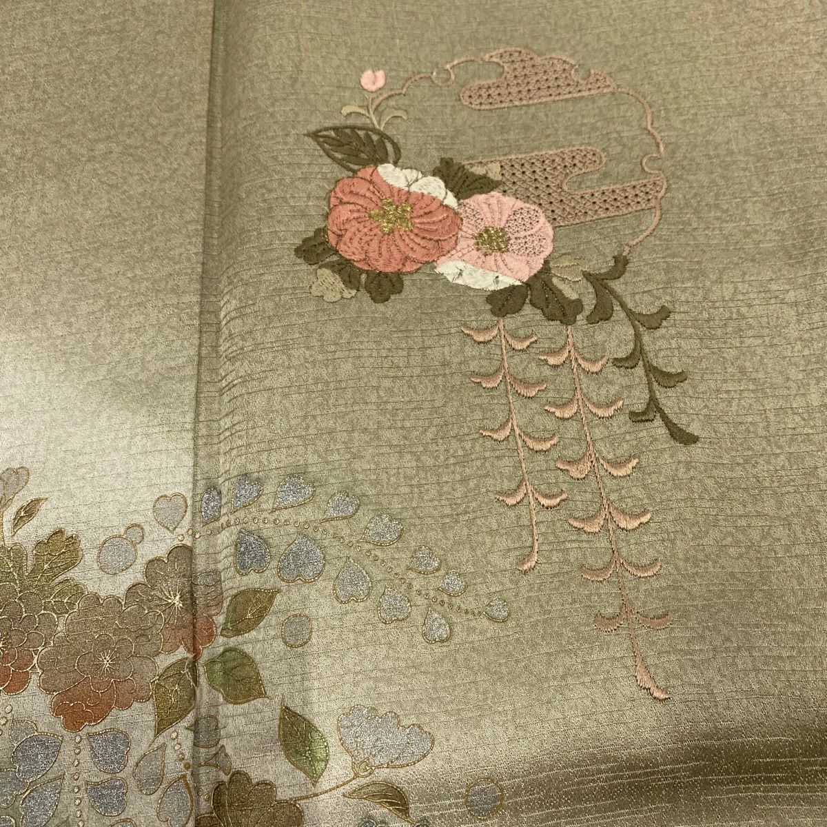 【在庫一掃】 付下げ 身丈161.5cm 裄丈63.5cm S 袷 雪輪 草花 刺繍 霞ぼかし 鶯色 正絹 秀品