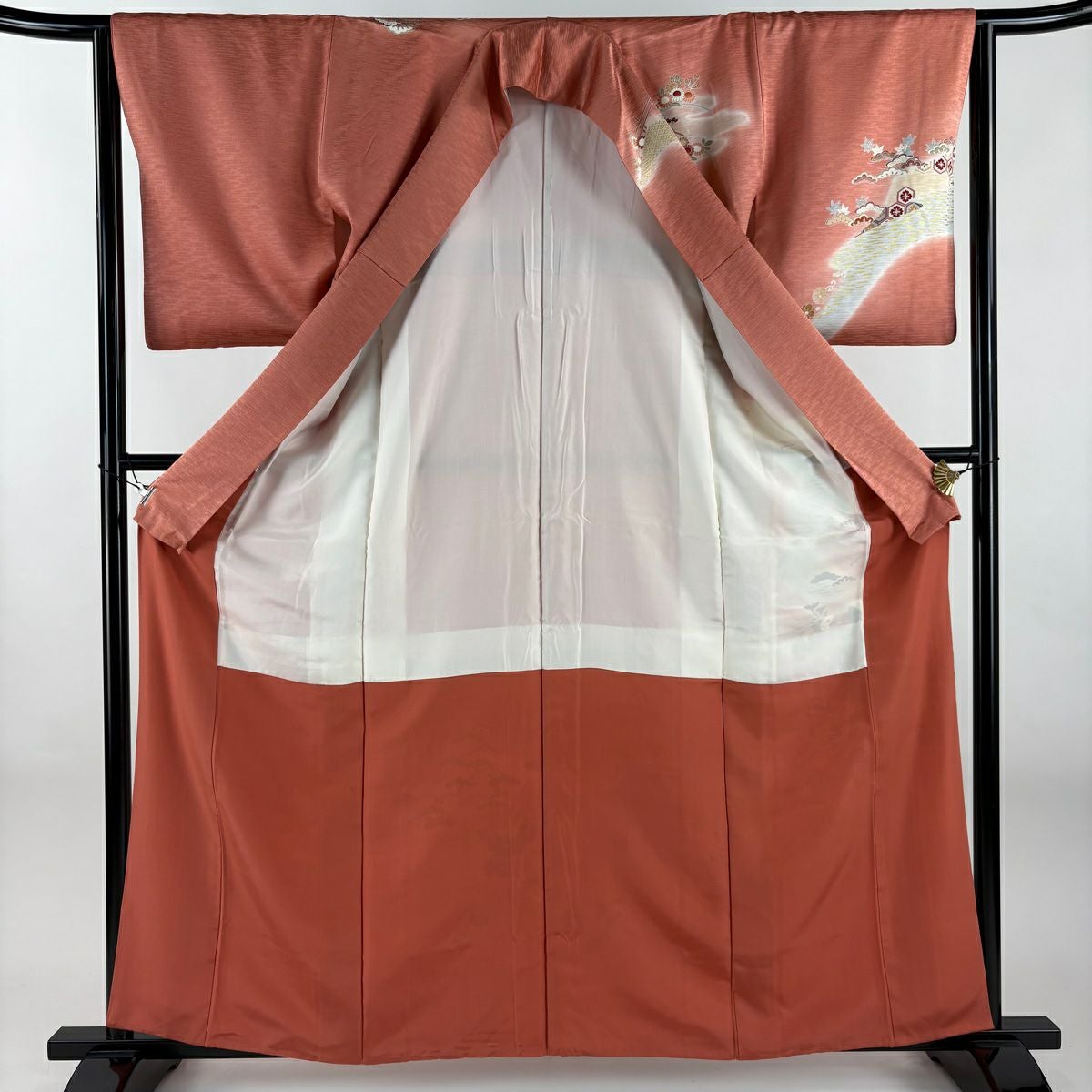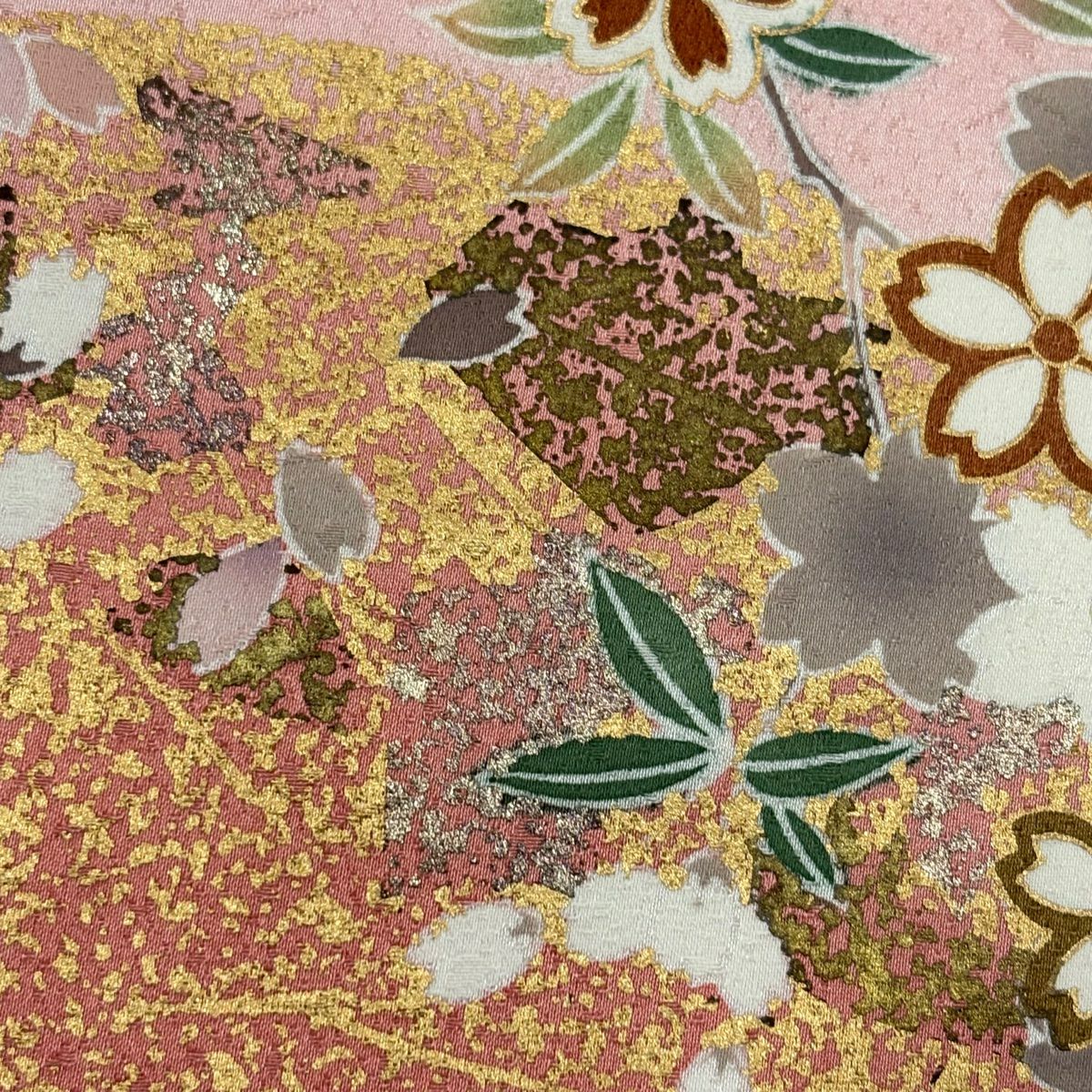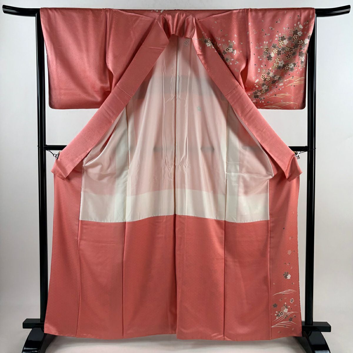 【在庫一掃】 訪問着 身丈155cm 裄丈64cm M 袷 枝花 金銀彩 螺鈿 サーモンピンク 正絹 秀品