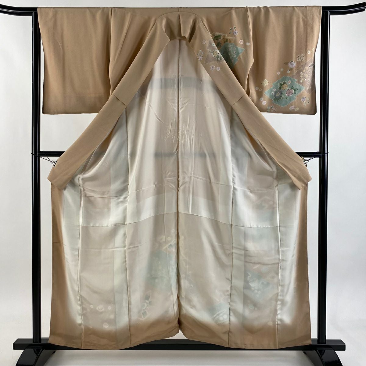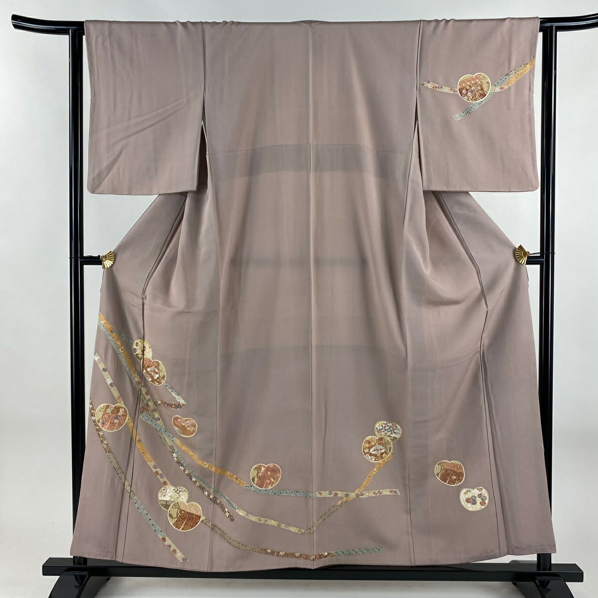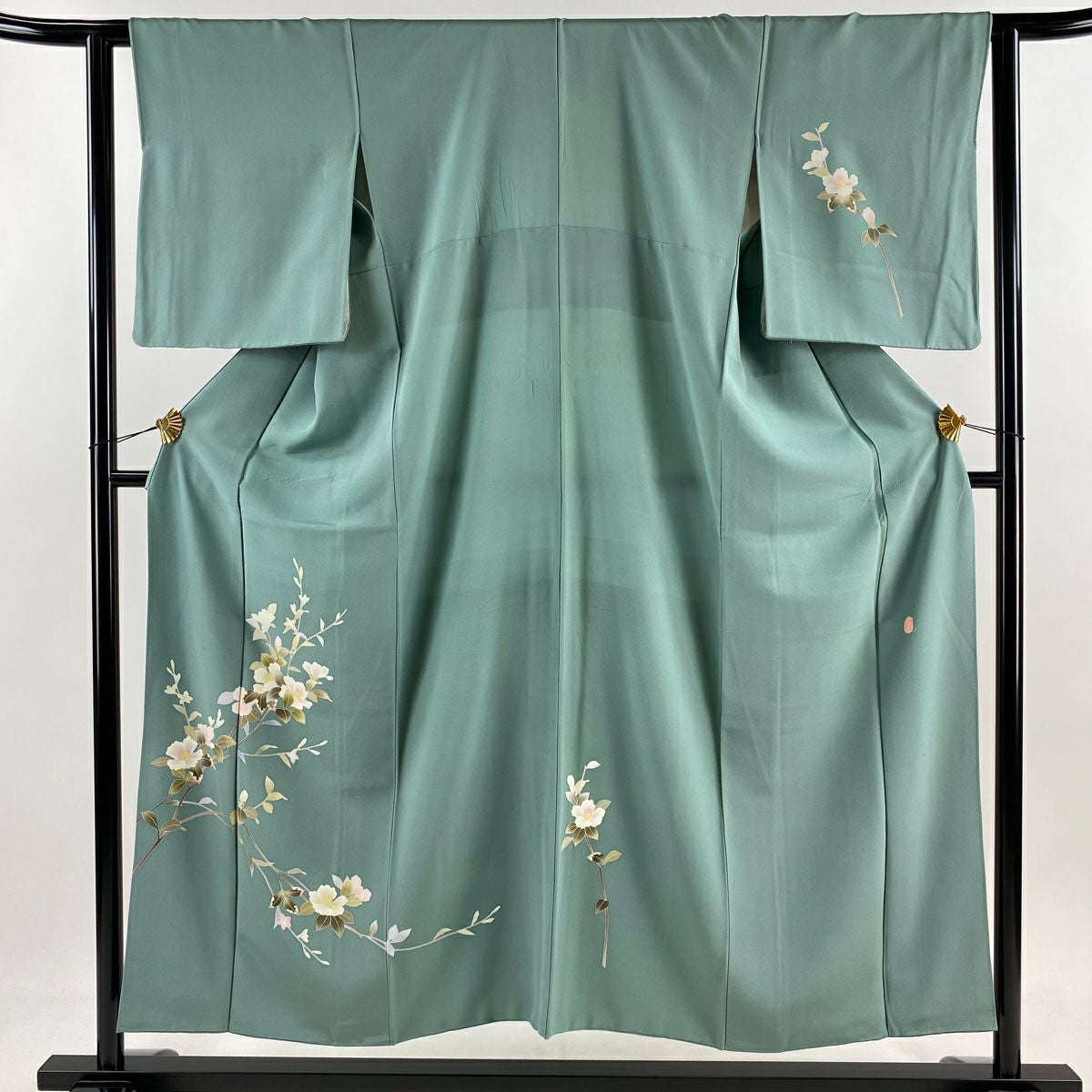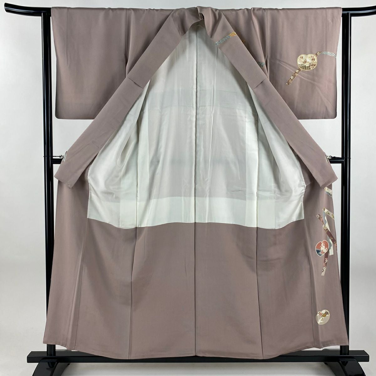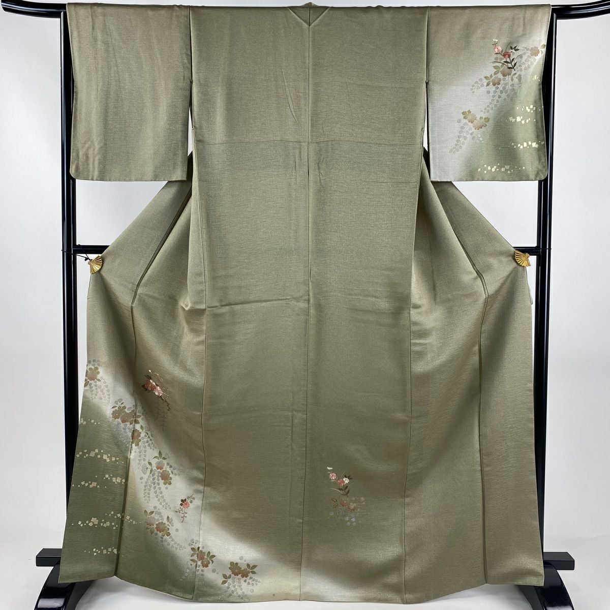 【在庫一掃】 色留袖 身丈172cm 裄丈63.5cm S 袷 扇面 草花 金銀彩 灰緑 正絹 秀品 一つ紋