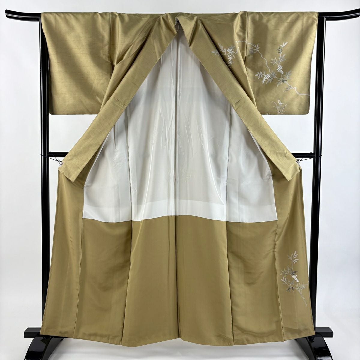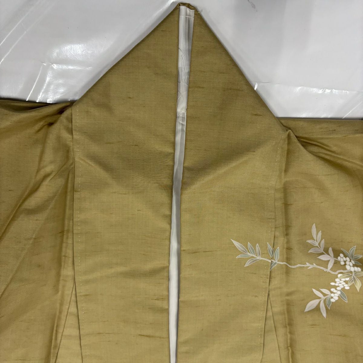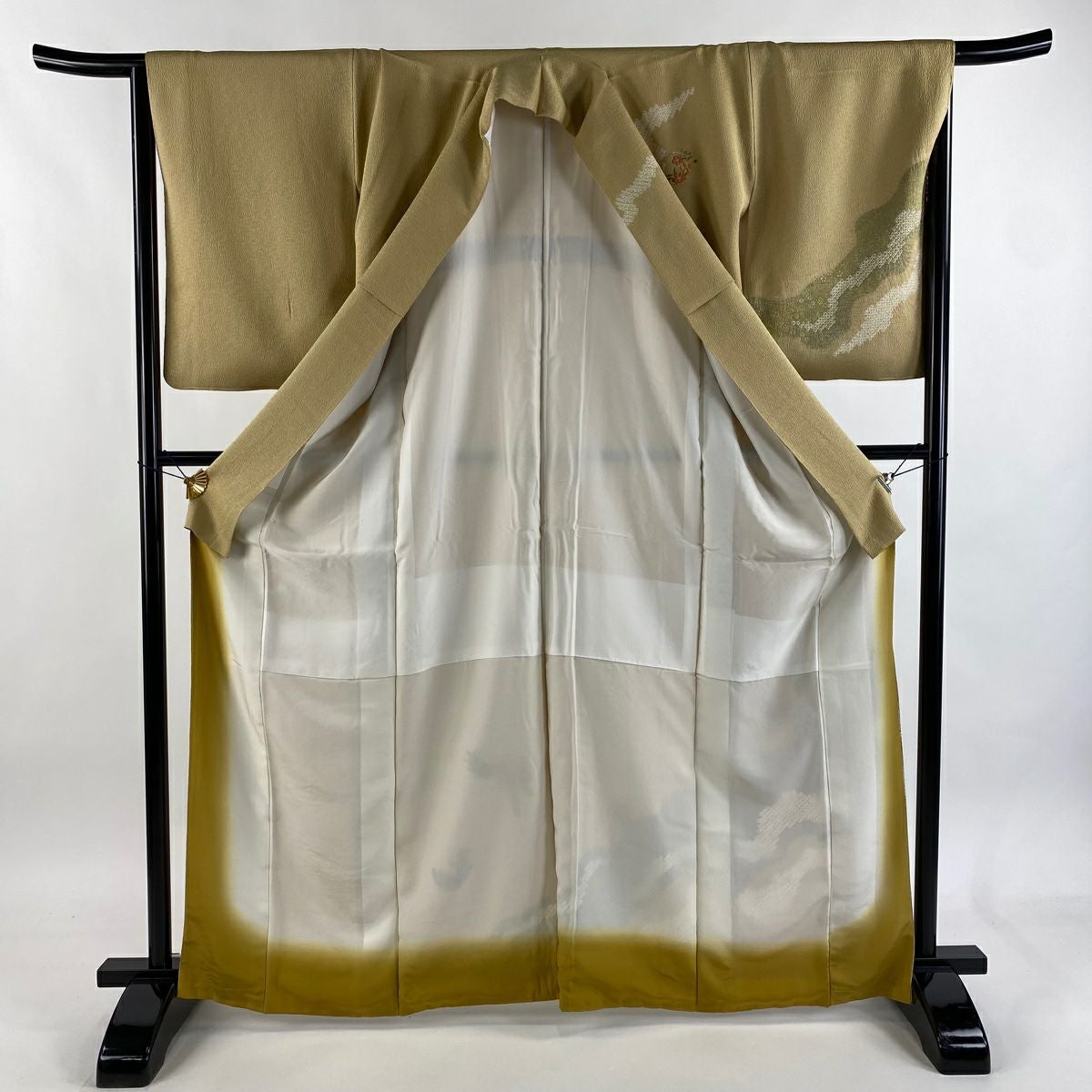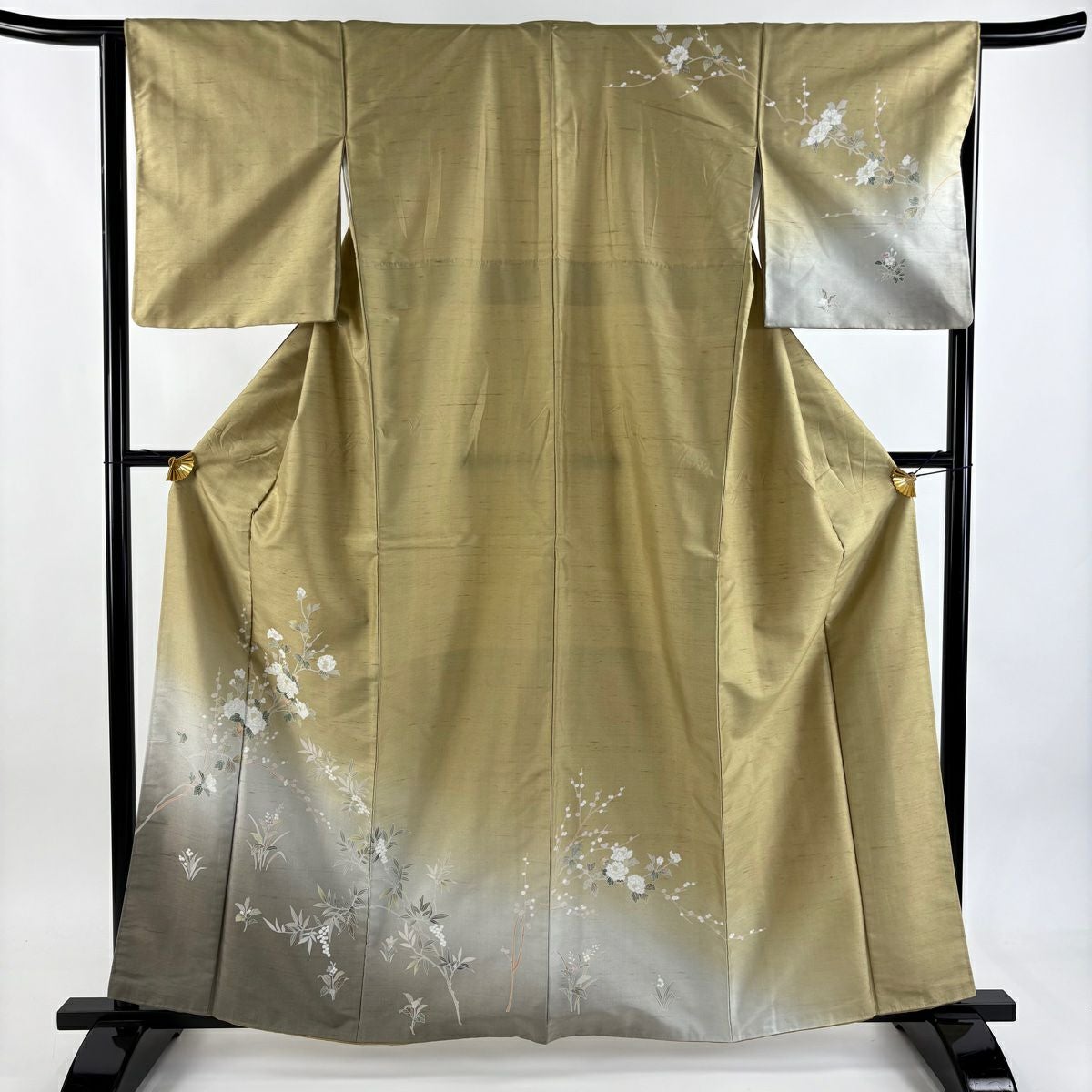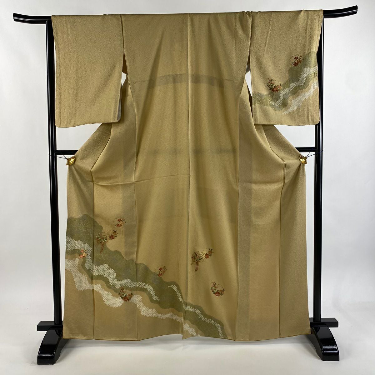 【在庫一掃】 【美品】 訪問着 身丈163cm 裄丈63cm S 袷 枝垂れ桜 蝶 金糸 刺繍 黄土色 正絹 秀品