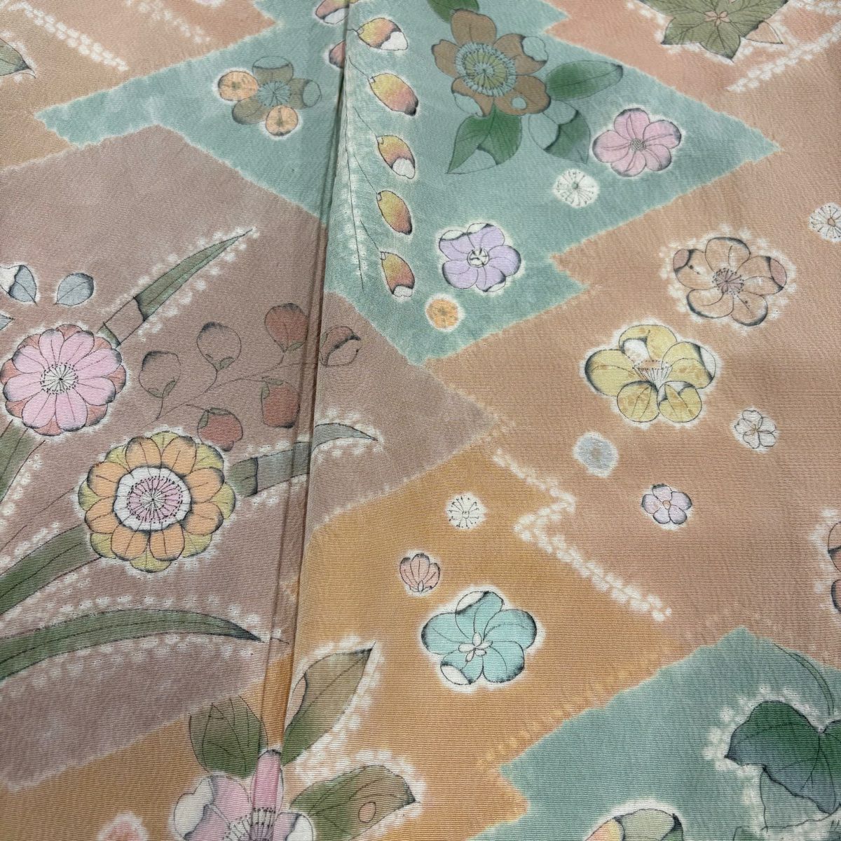 【在庫一掃】 付下げ 身丈159cm 裄丈61.5cm S 袷 草花 幾何学 絞り 薄オレンジ 正絹 秀品