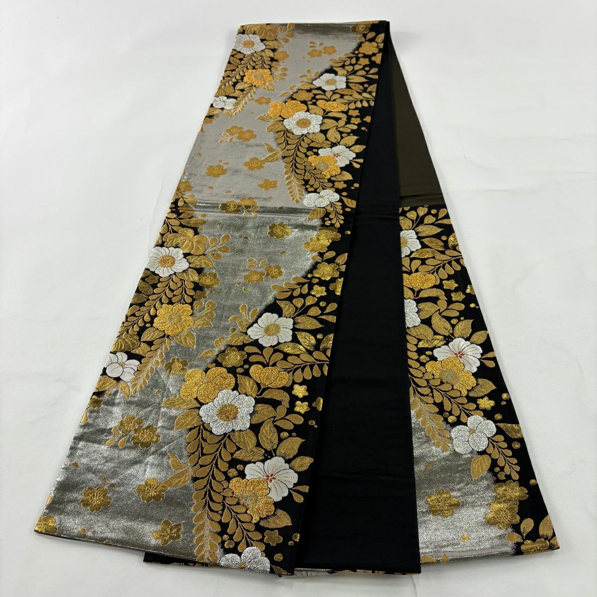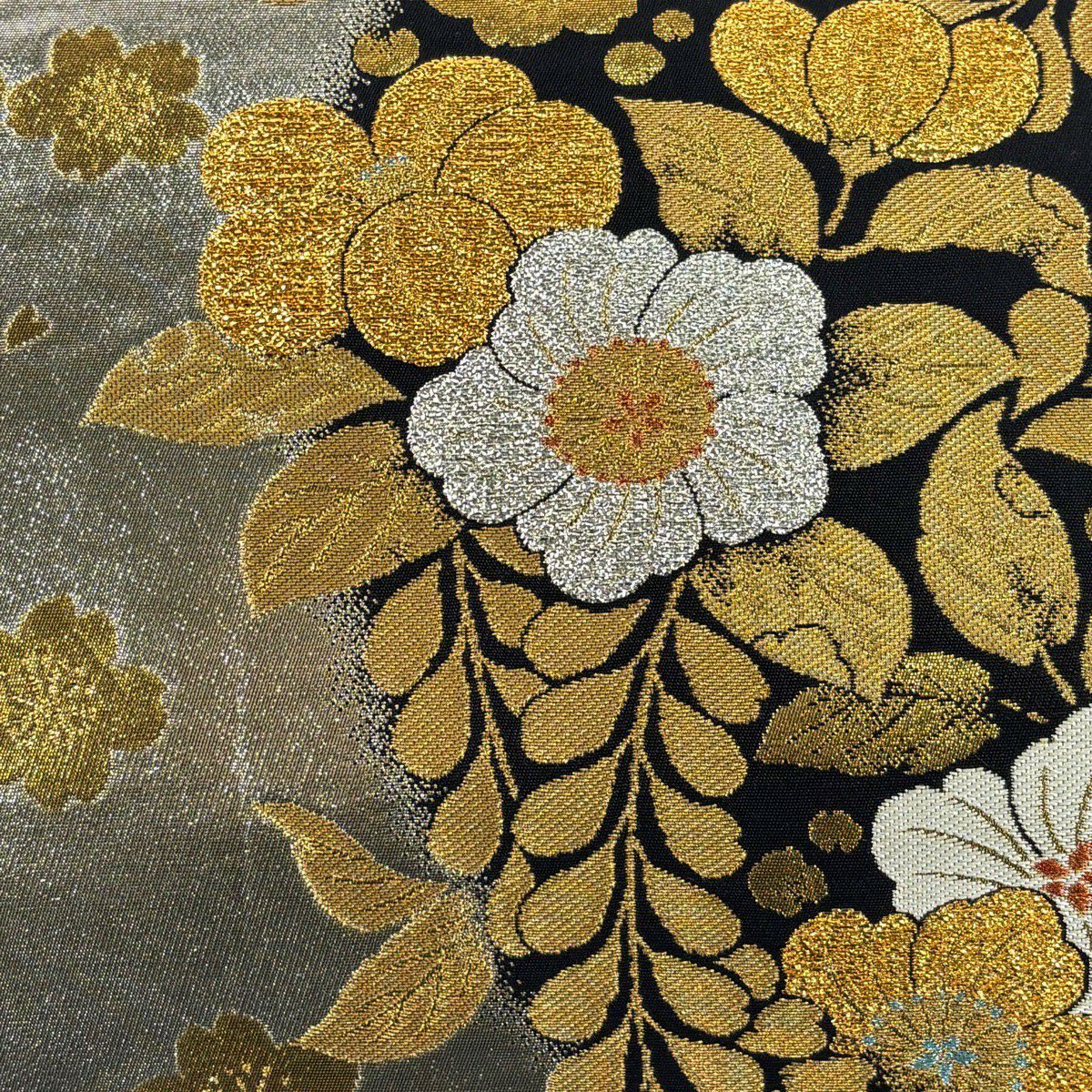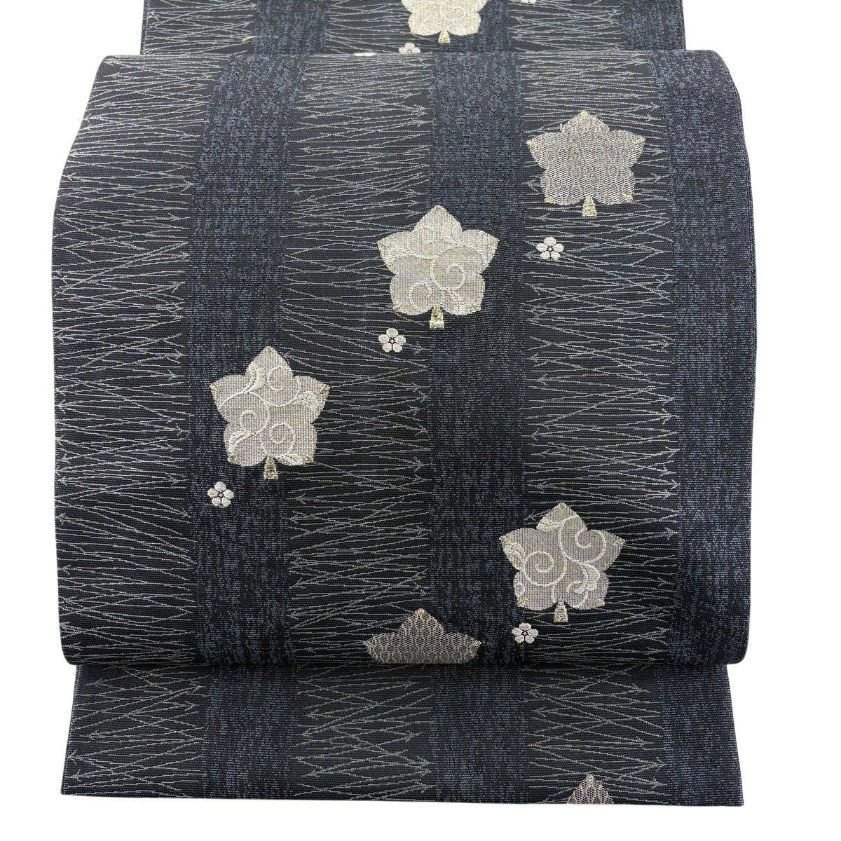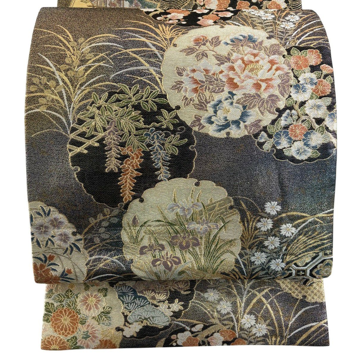 【美品】 袋帯 秀品 華文 草花 銀糸 箔 墨色 六通 正絹