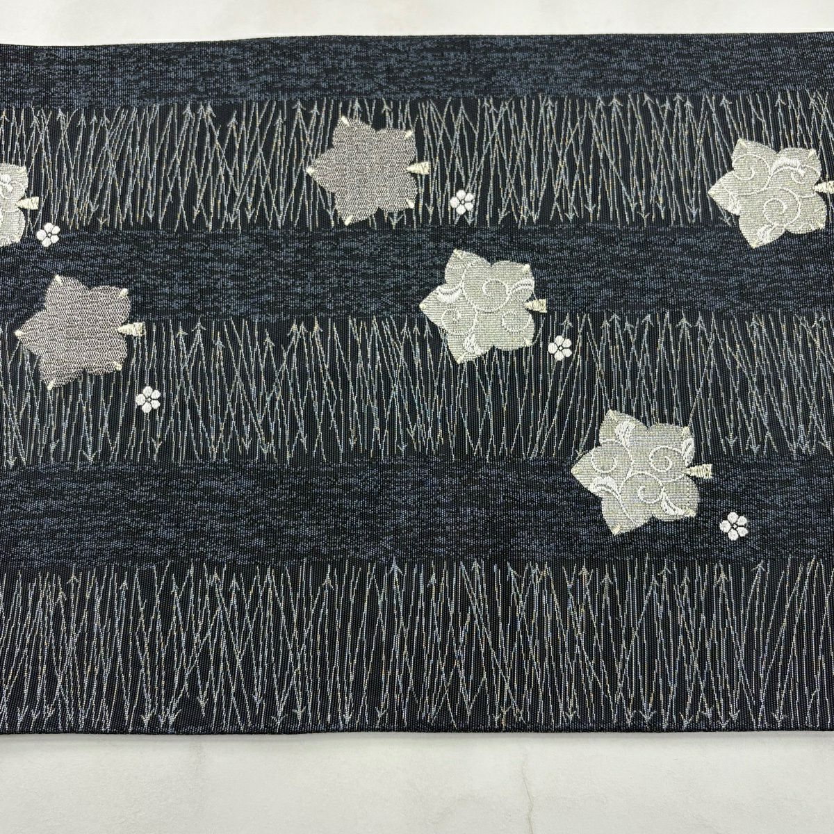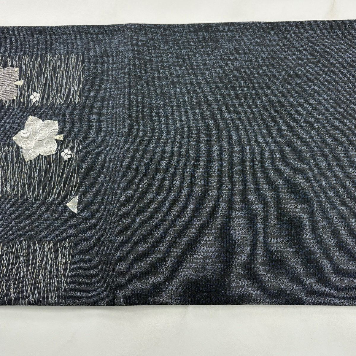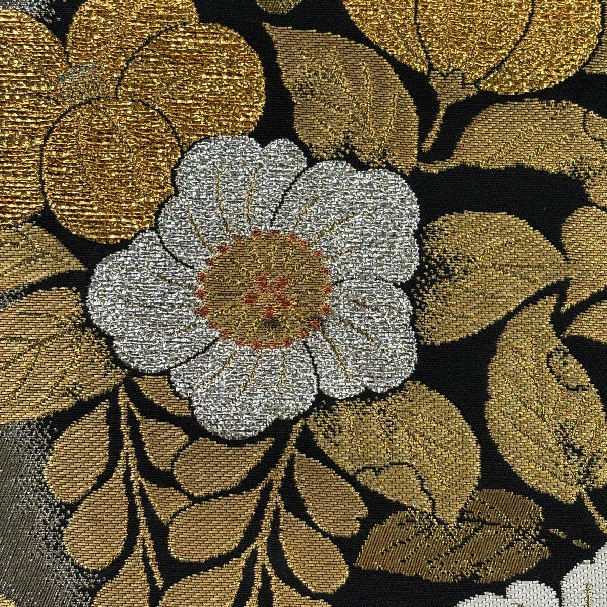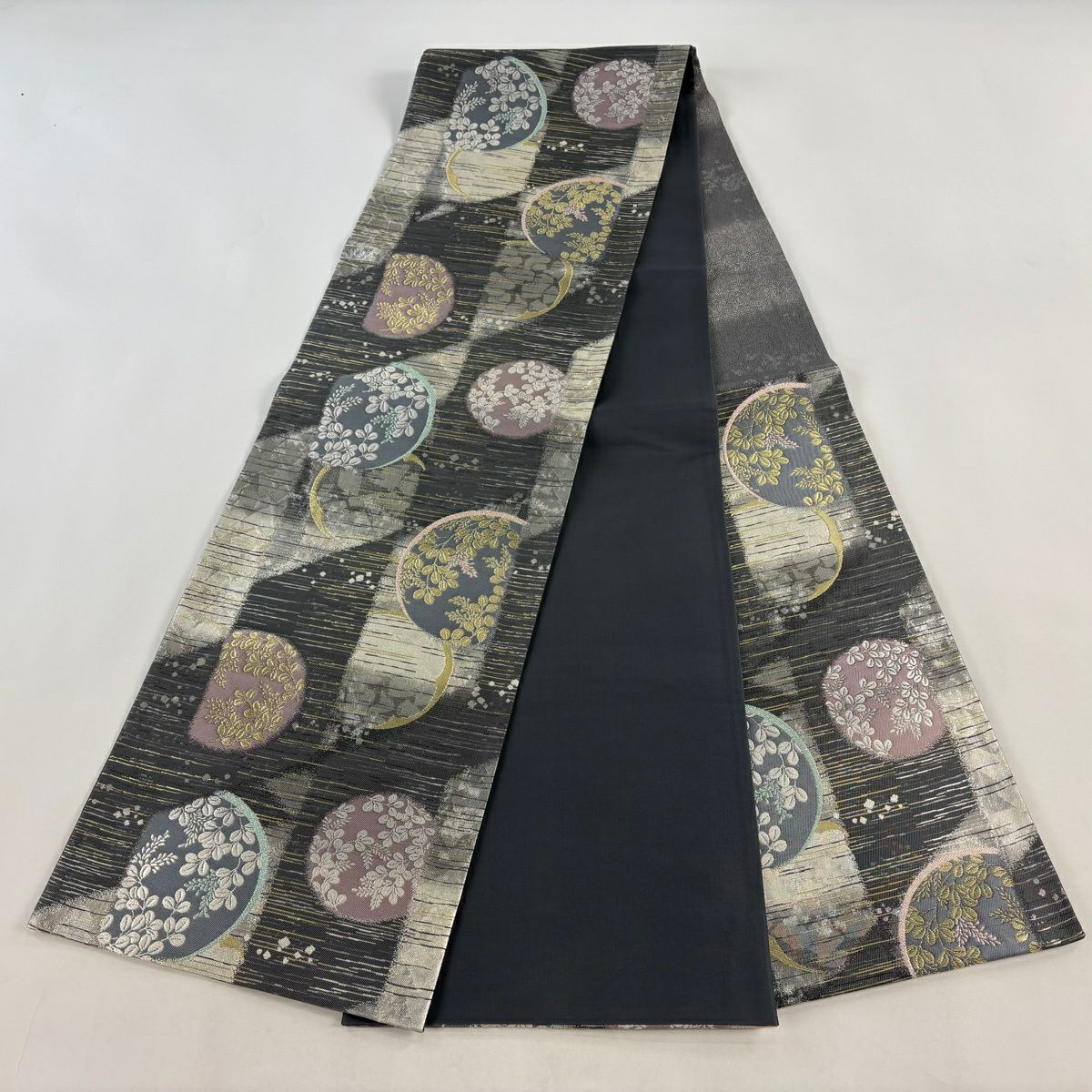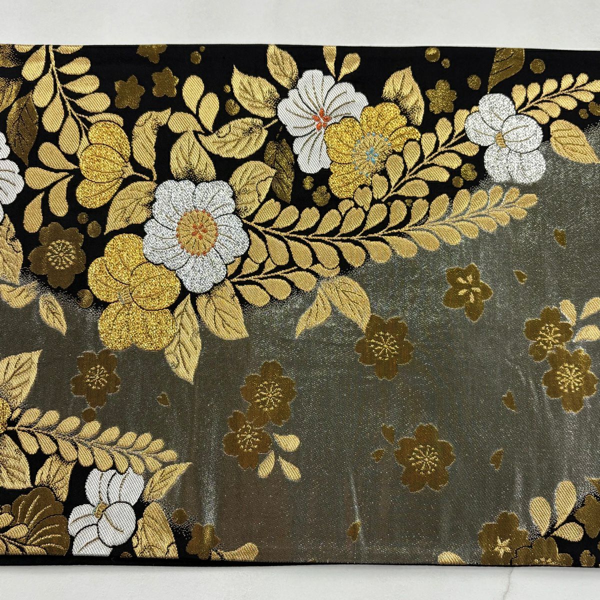 【美品】 袋帯 秀品 華文 草花 銀糸 箔 墨色 六通 正絹