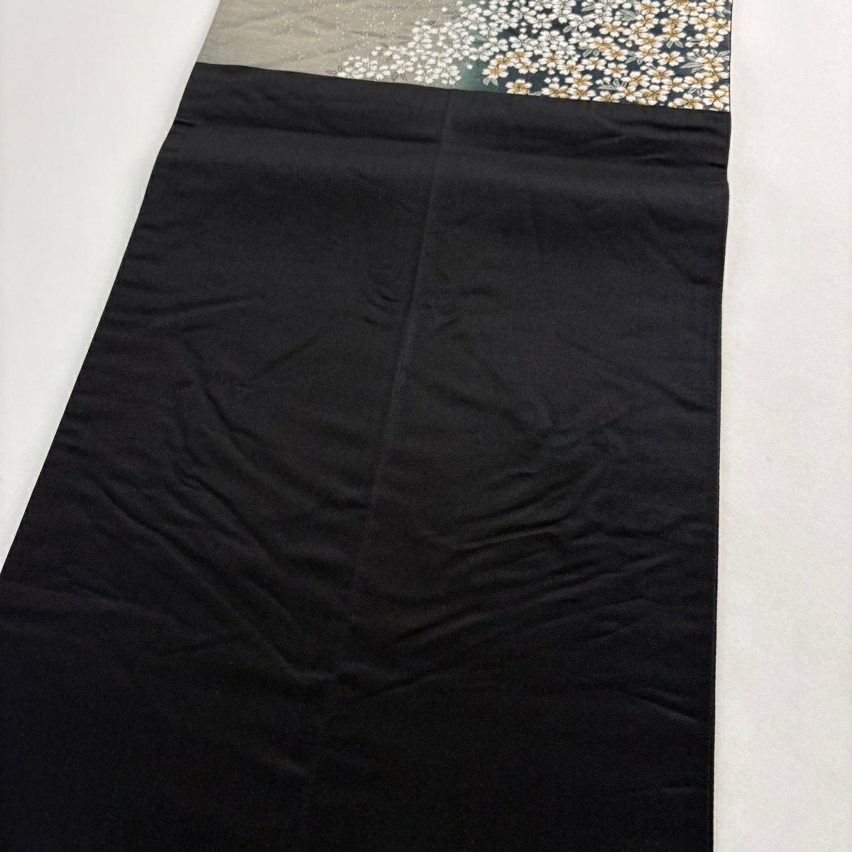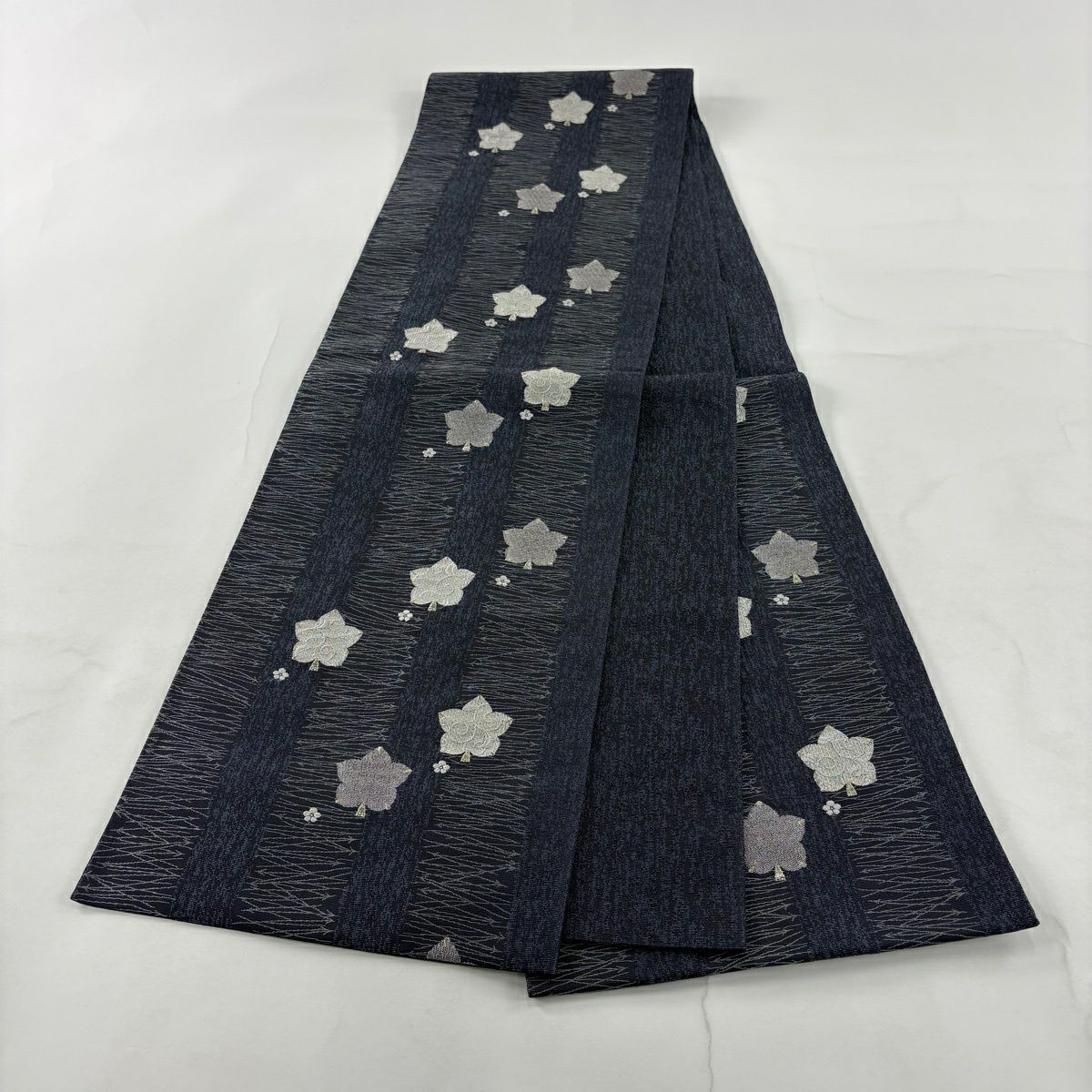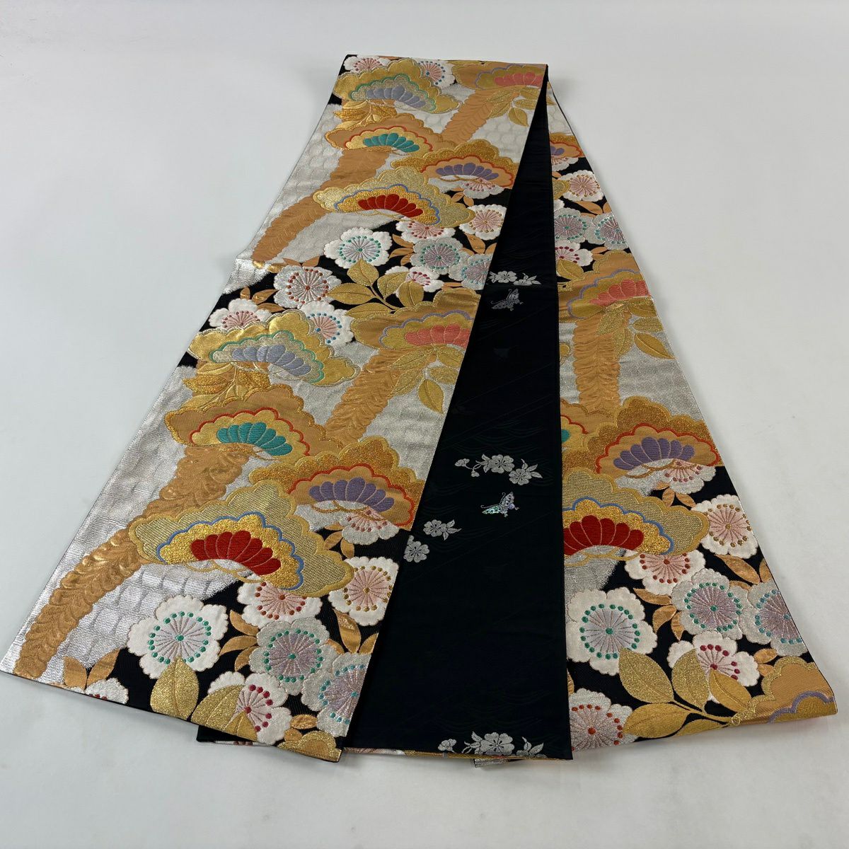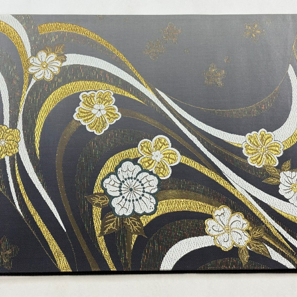 【美品】 袋帯 秀品 華文 草花 銀糸 箔 墨色 六通 正絹