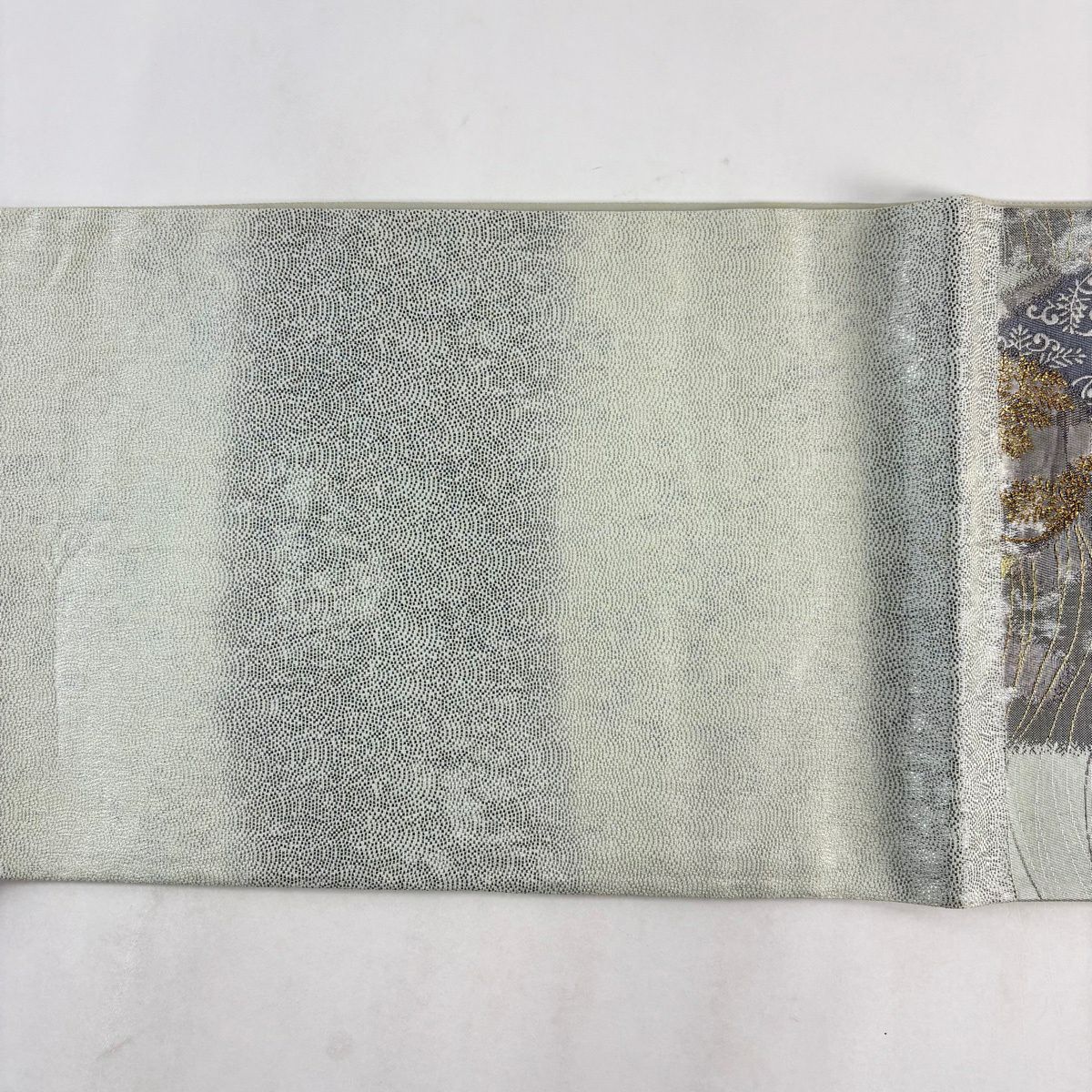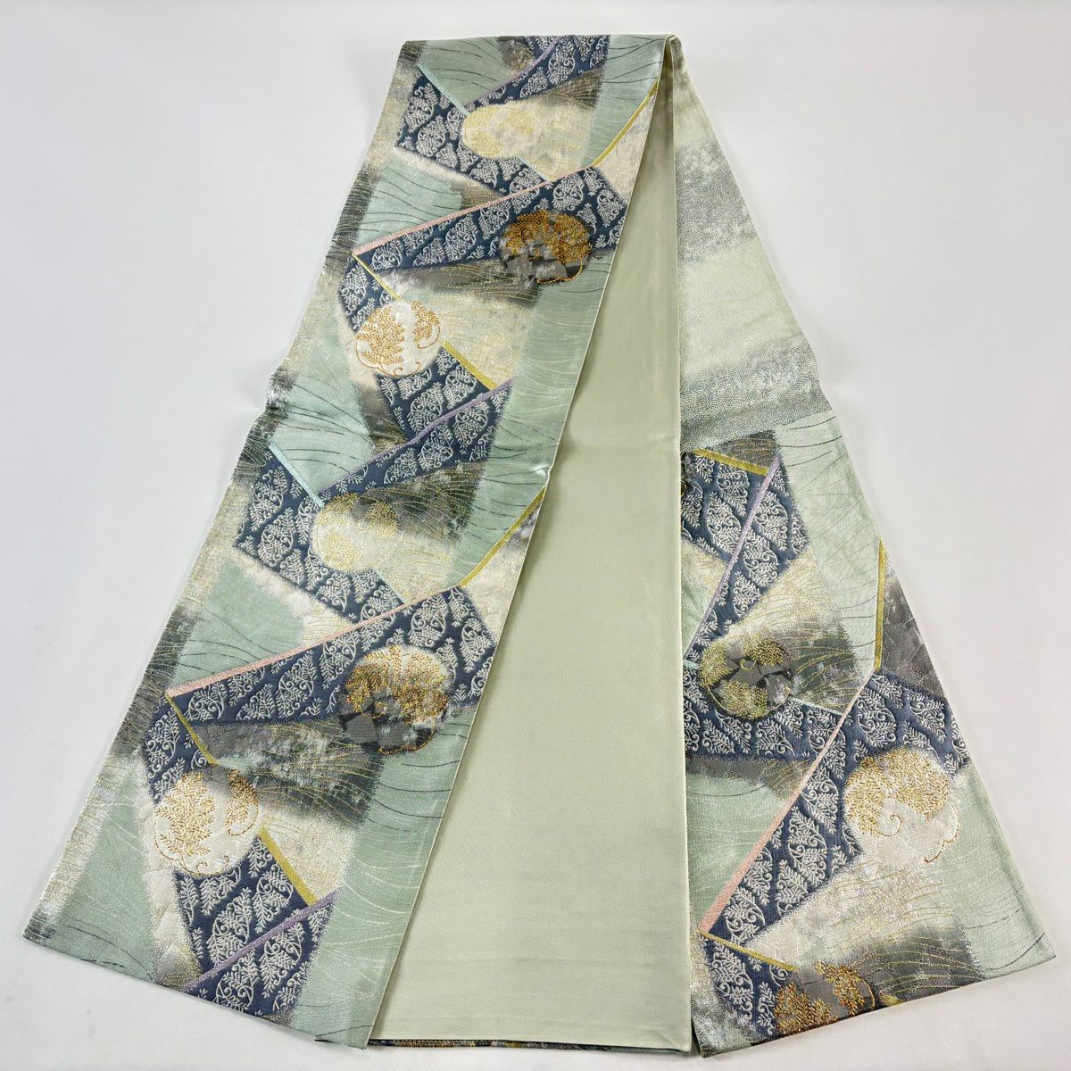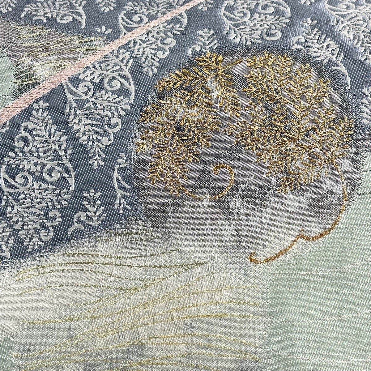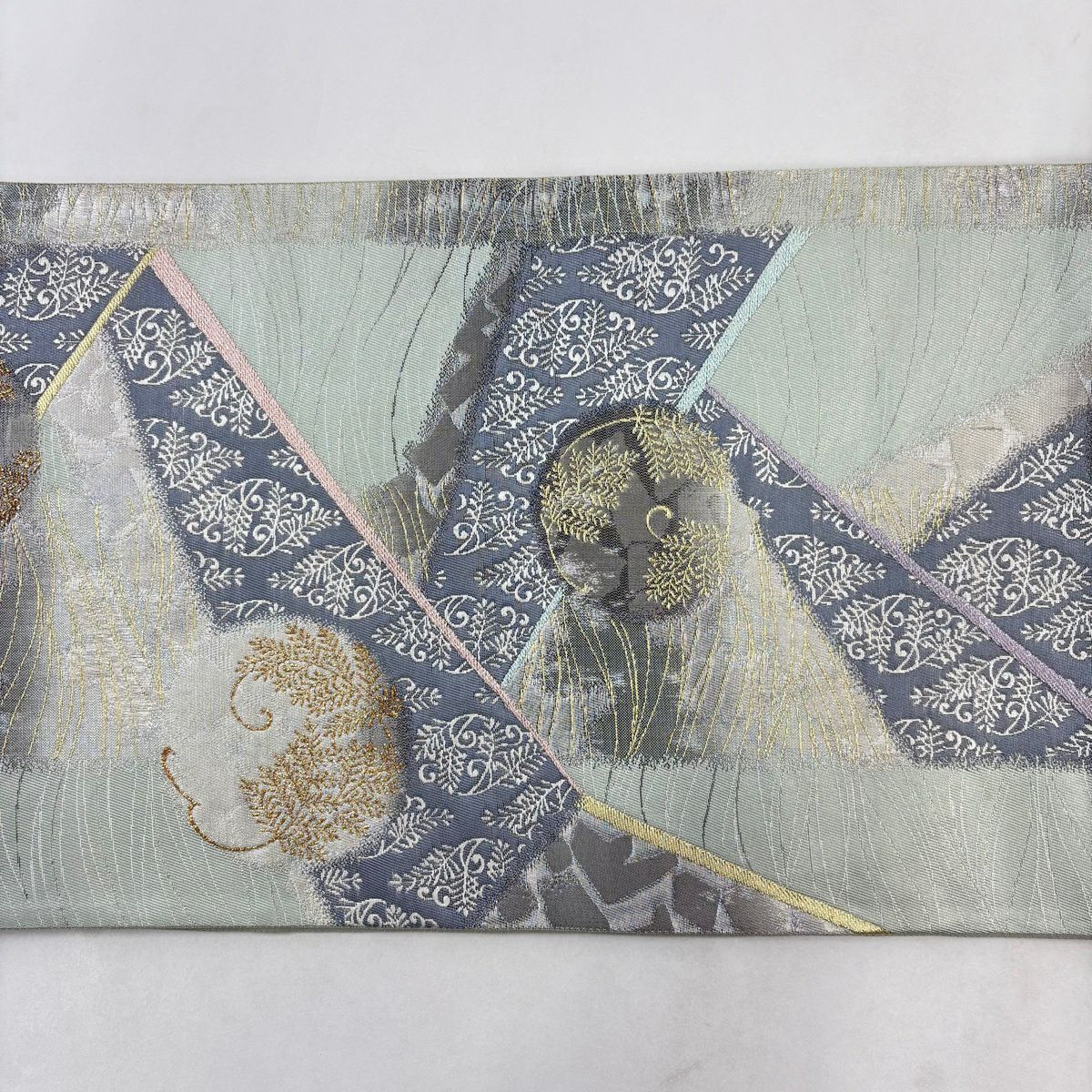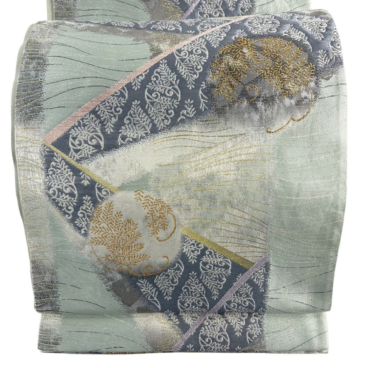 袋帯 秀品 花びら 幾何学模様 箔 ぼかし 灰緑 全通 正絹