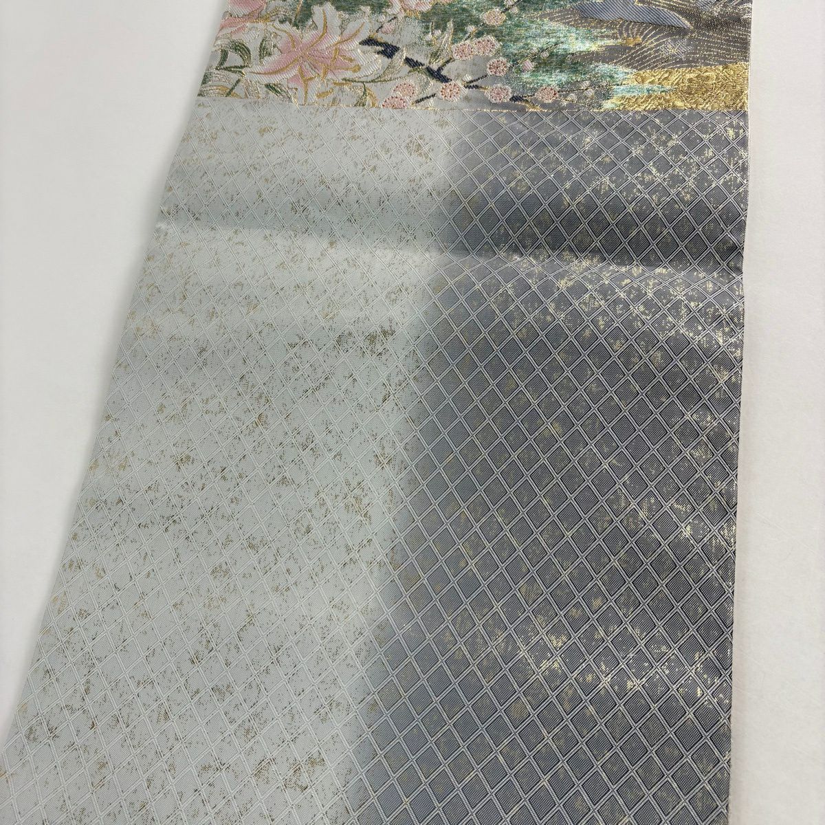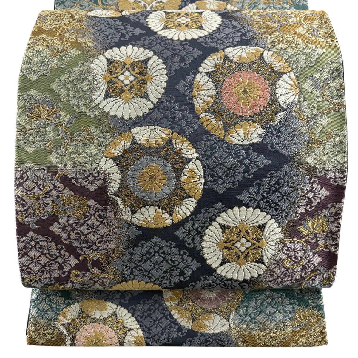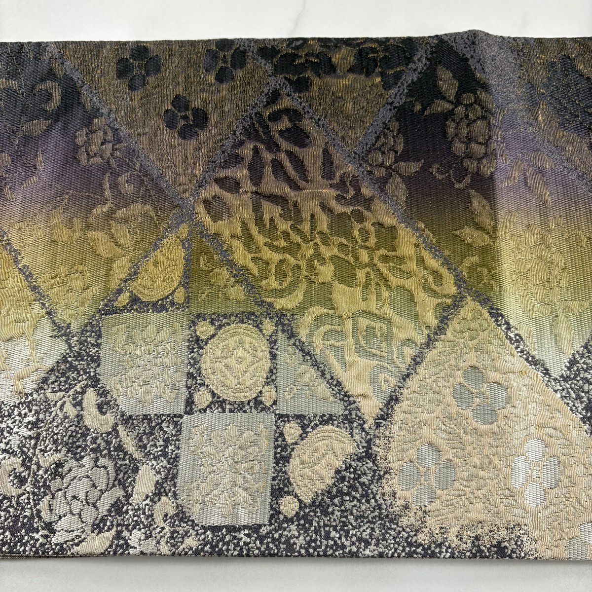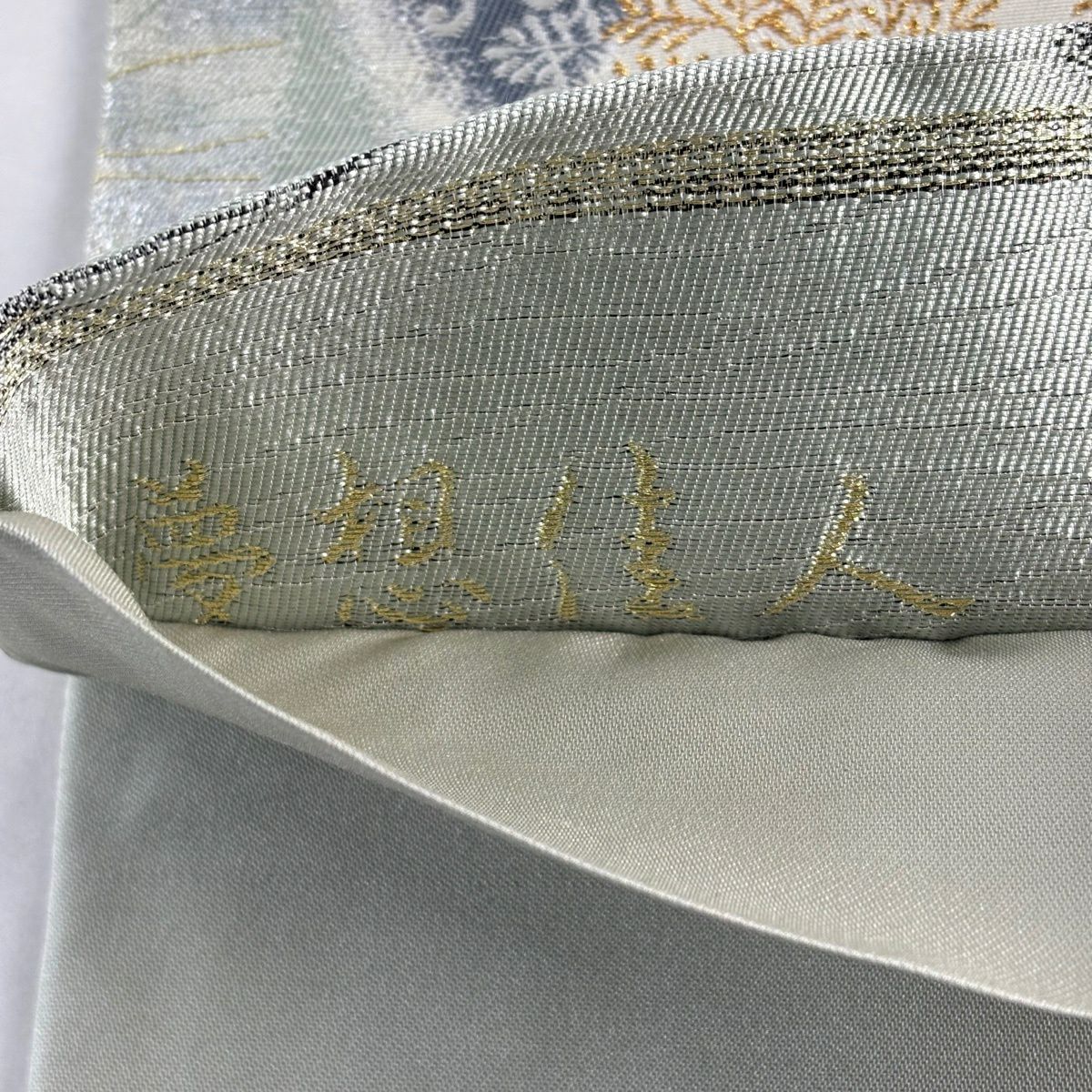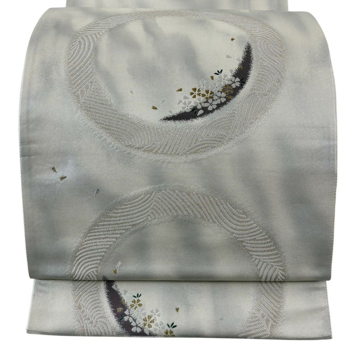 袋帯 秀品 花びら 幾何学模様 箔 ぼかし 灰緑 全通 正絹