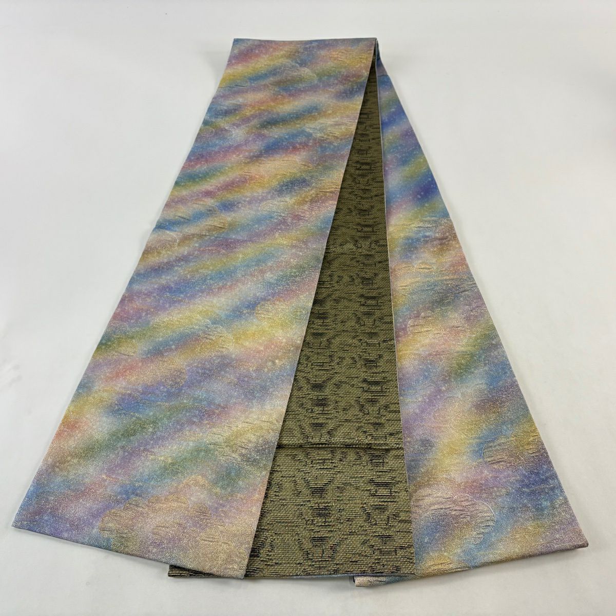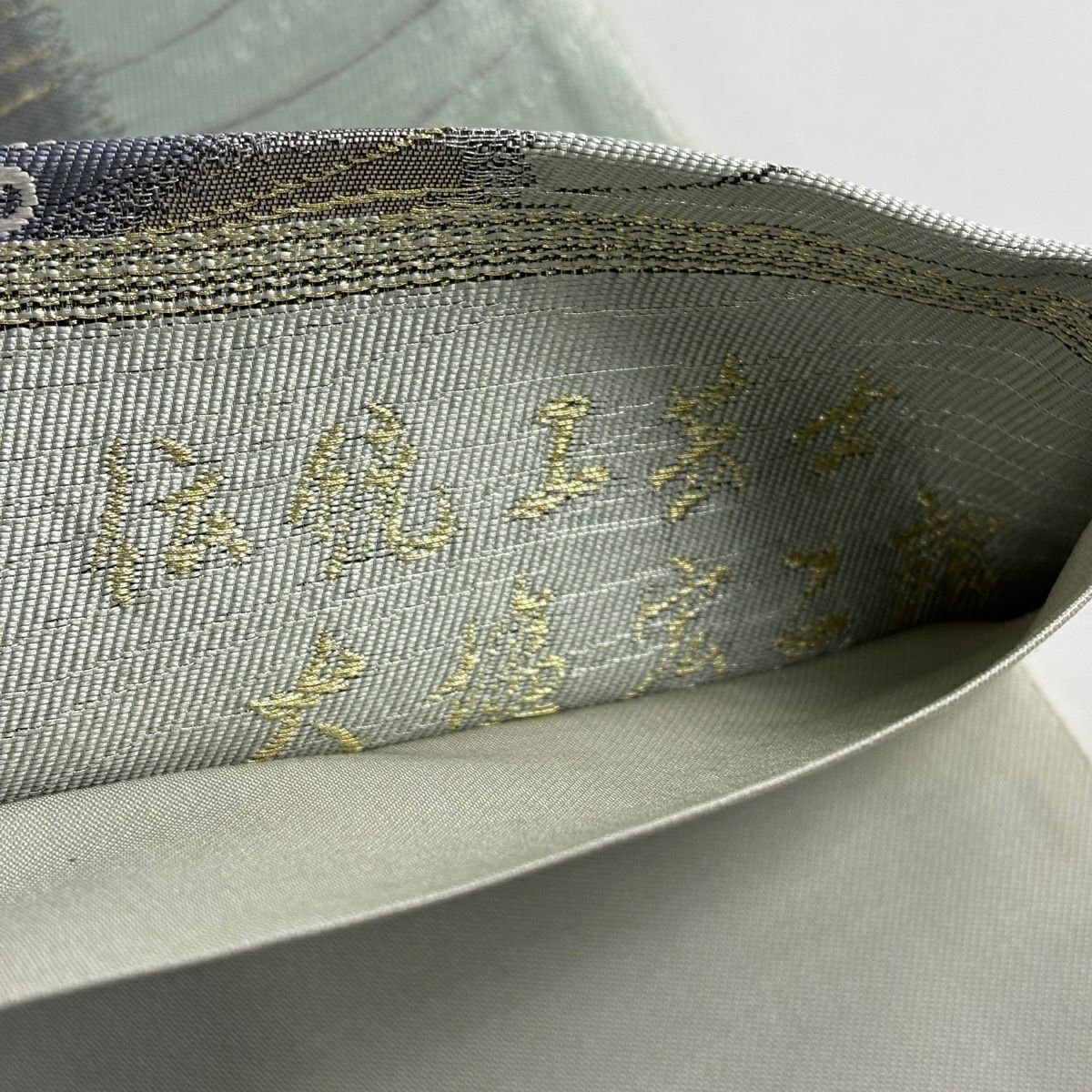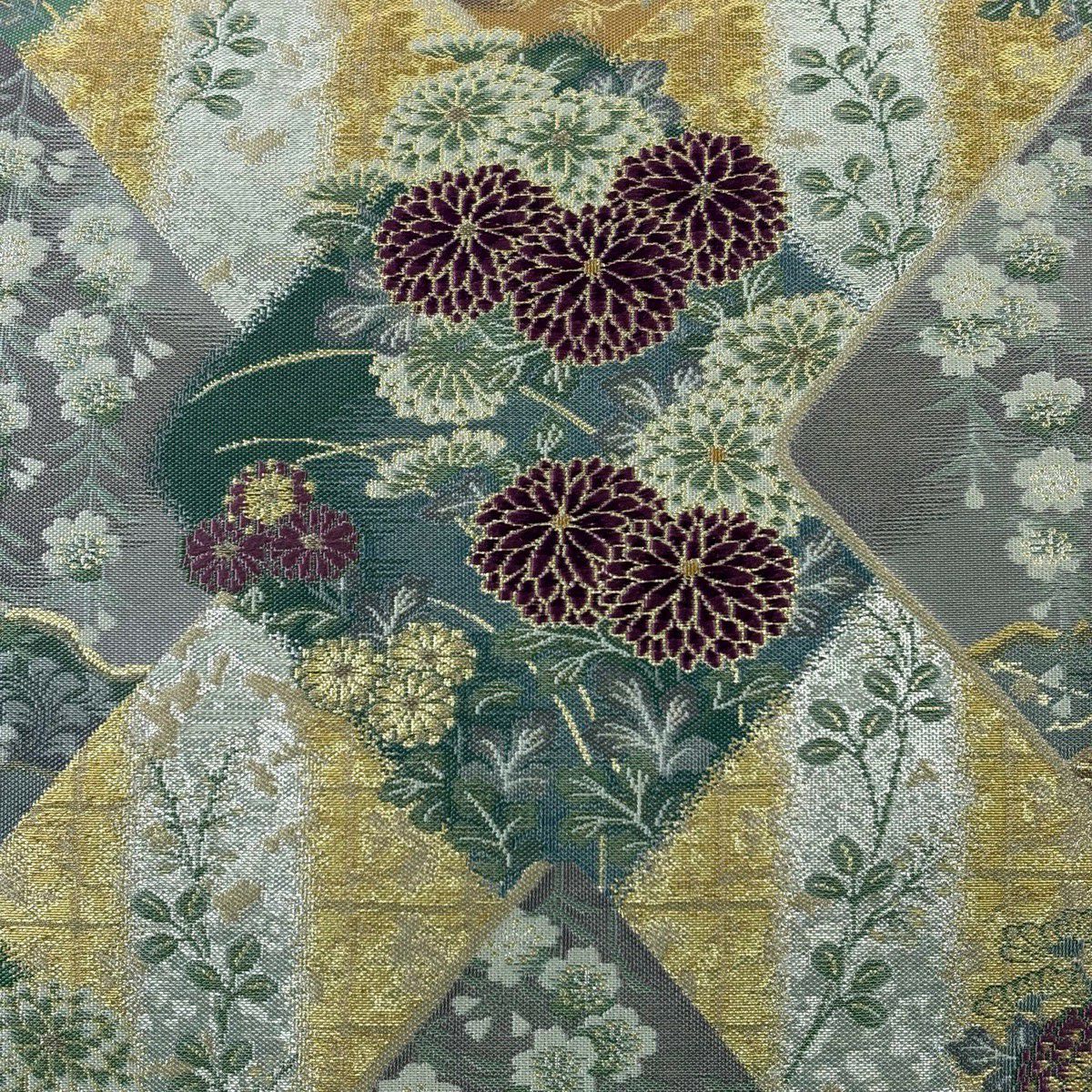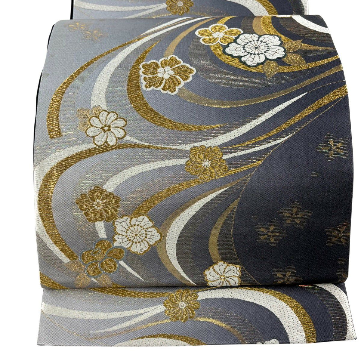 袋帯 秀品 花びら 幾何学模様 箔 ぼかし 灰緑 全通 正絹