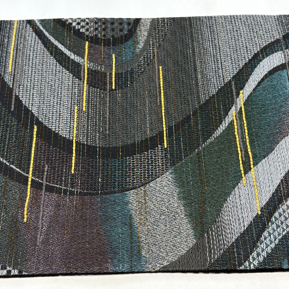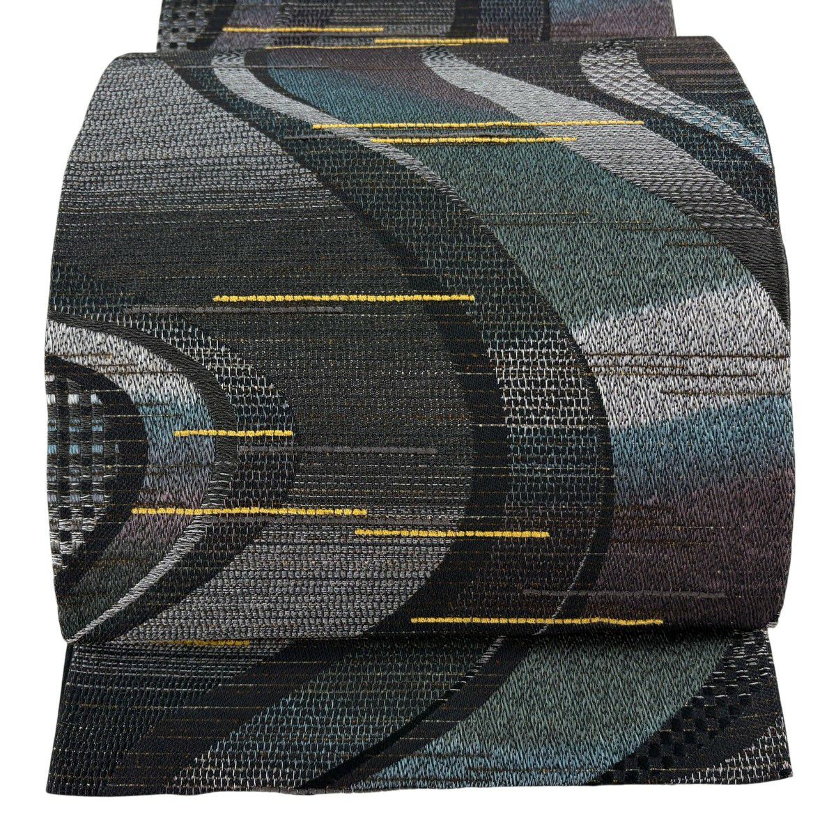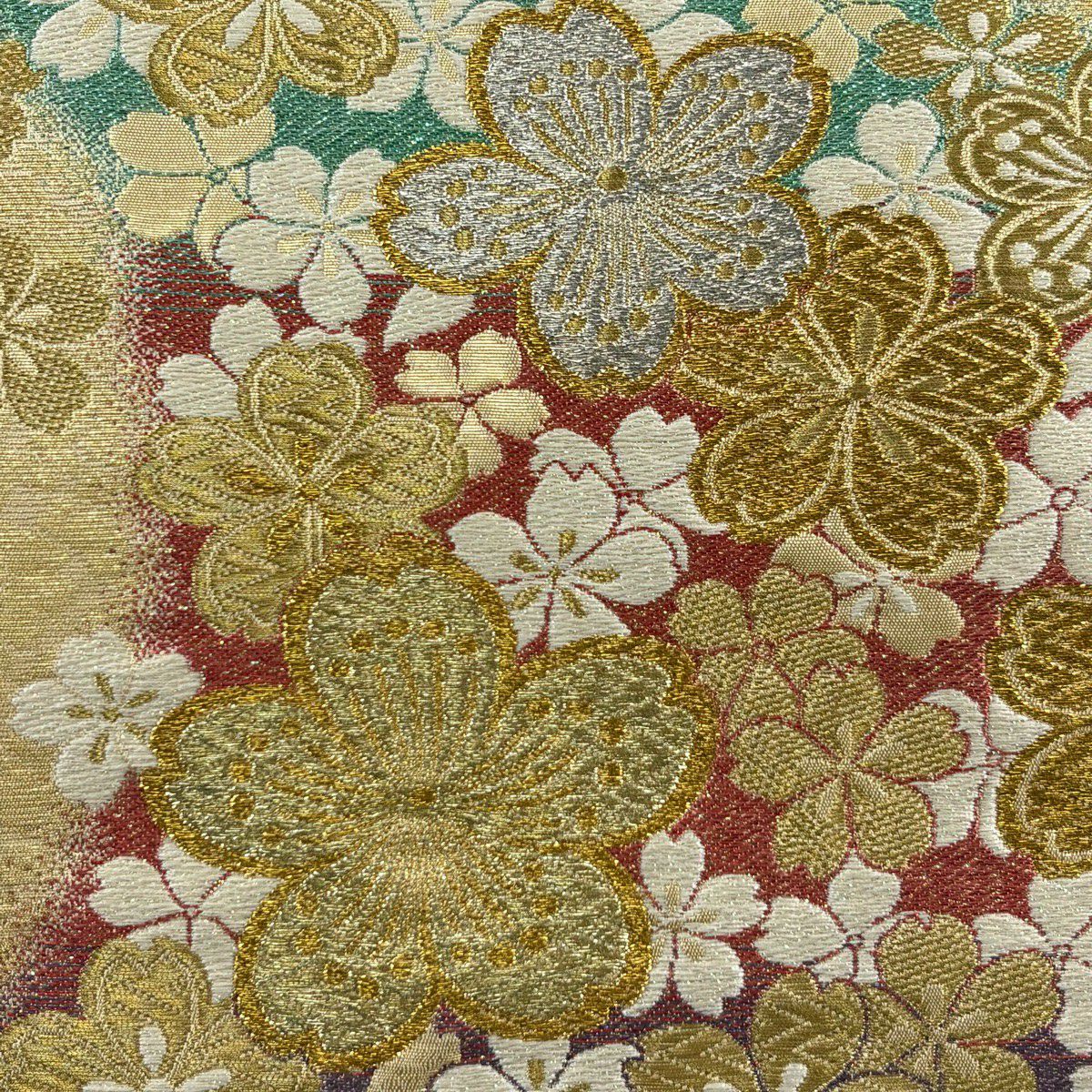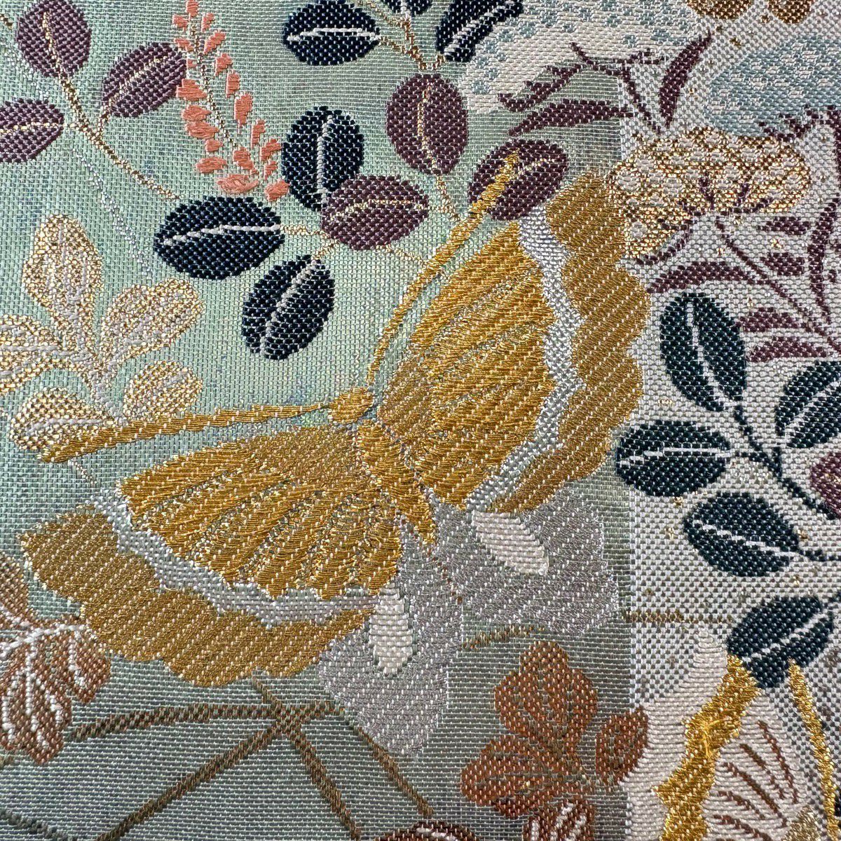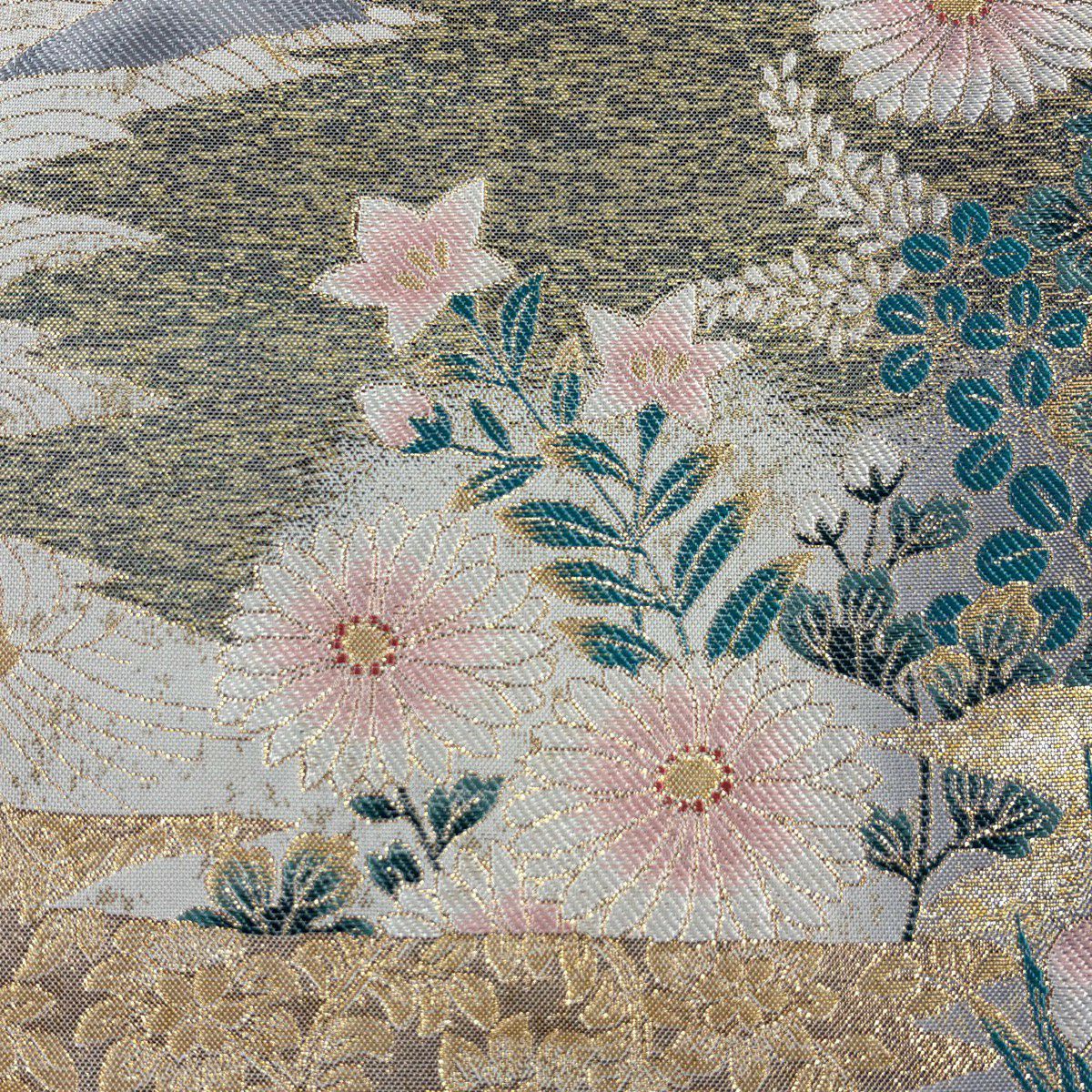 袋帯 秀品 花びら 幾何学模様 箔 ぼかし 灰緑 全通 正絹