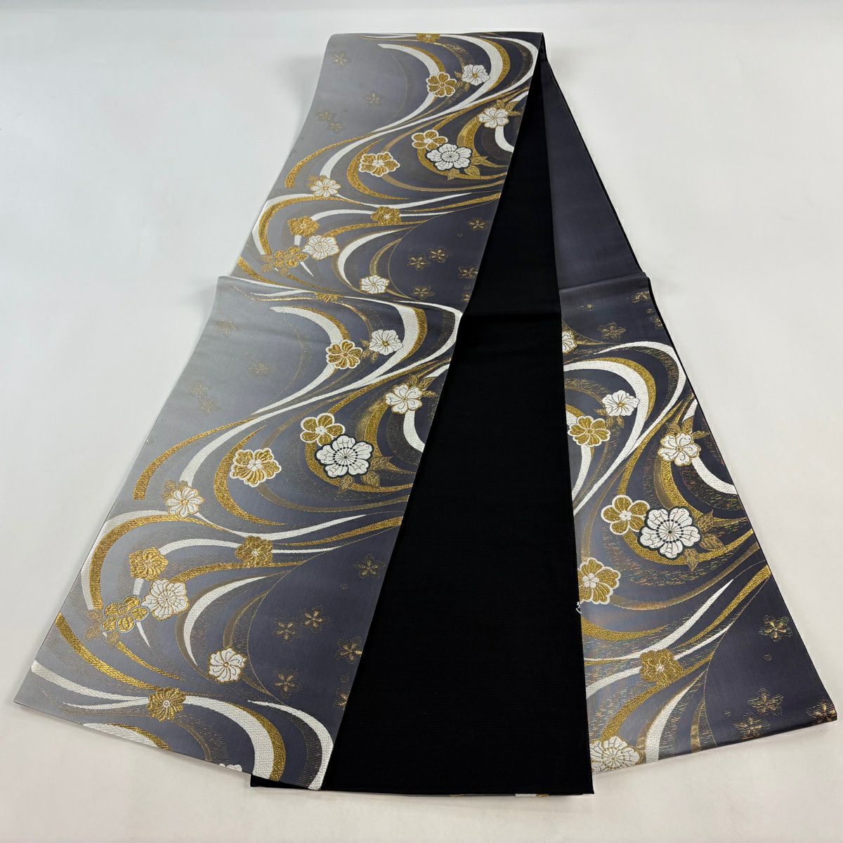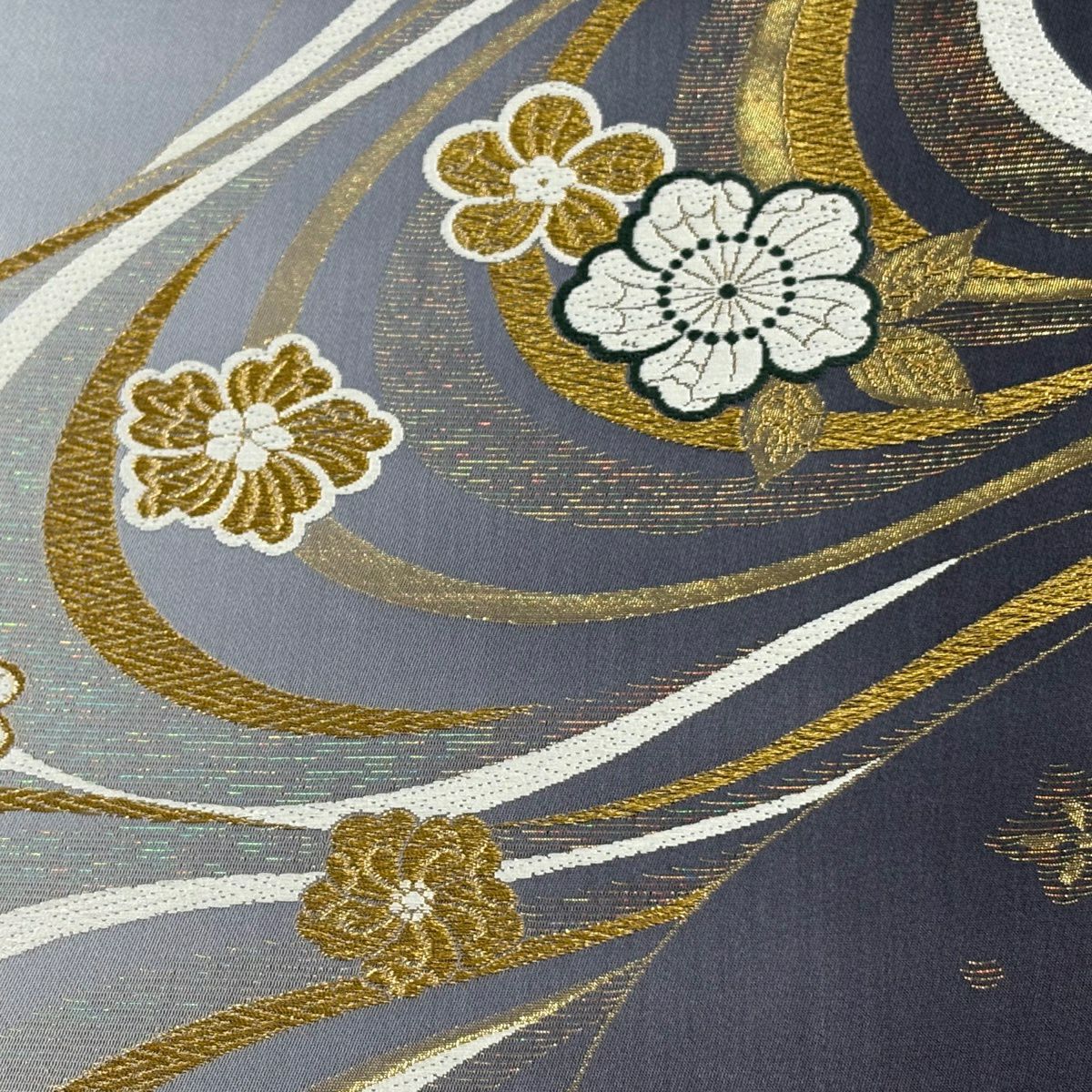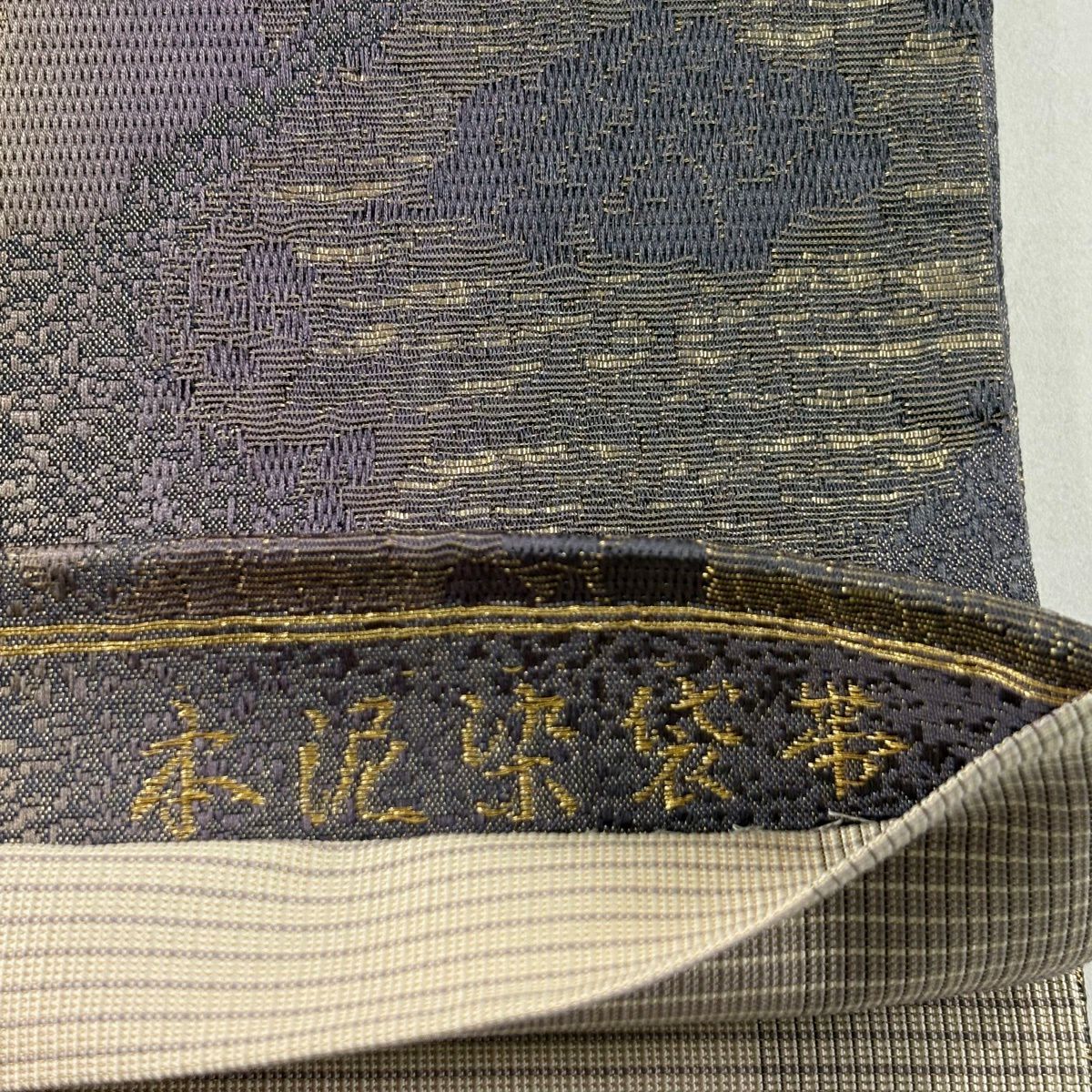 【美品】 袋帯 秀品 草花 流水 金糸 箔 灰紫 六通 正絹