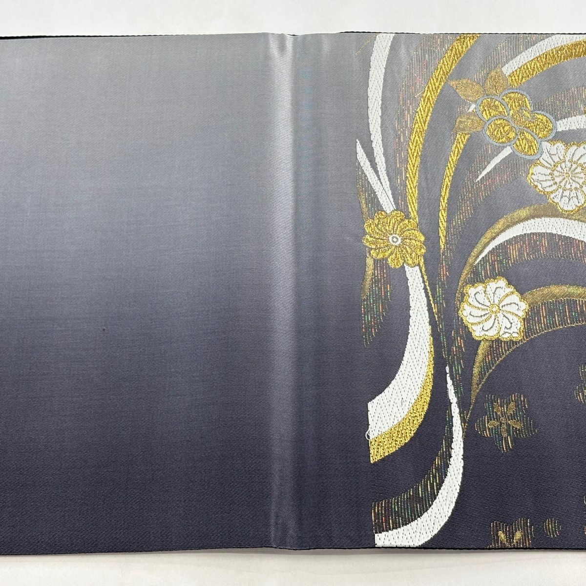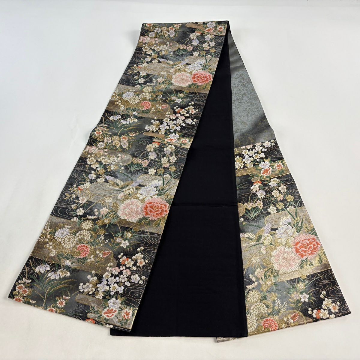 【美品】 袋帯 秀品 草花 ヱ霞 金糸 箔 黒灰 六通 正絹