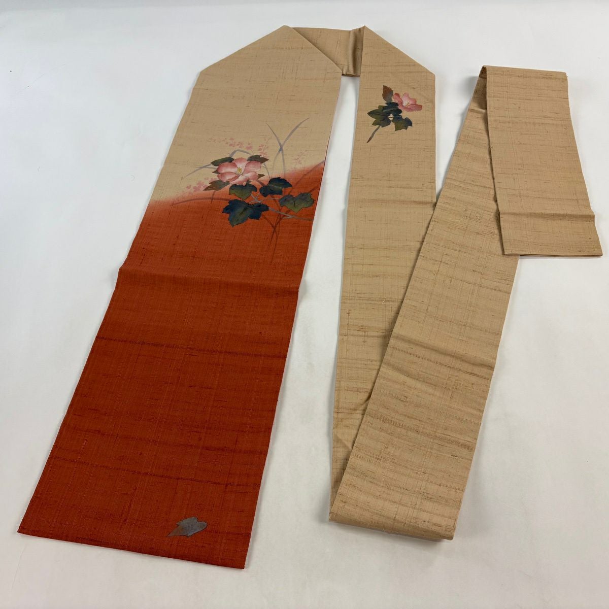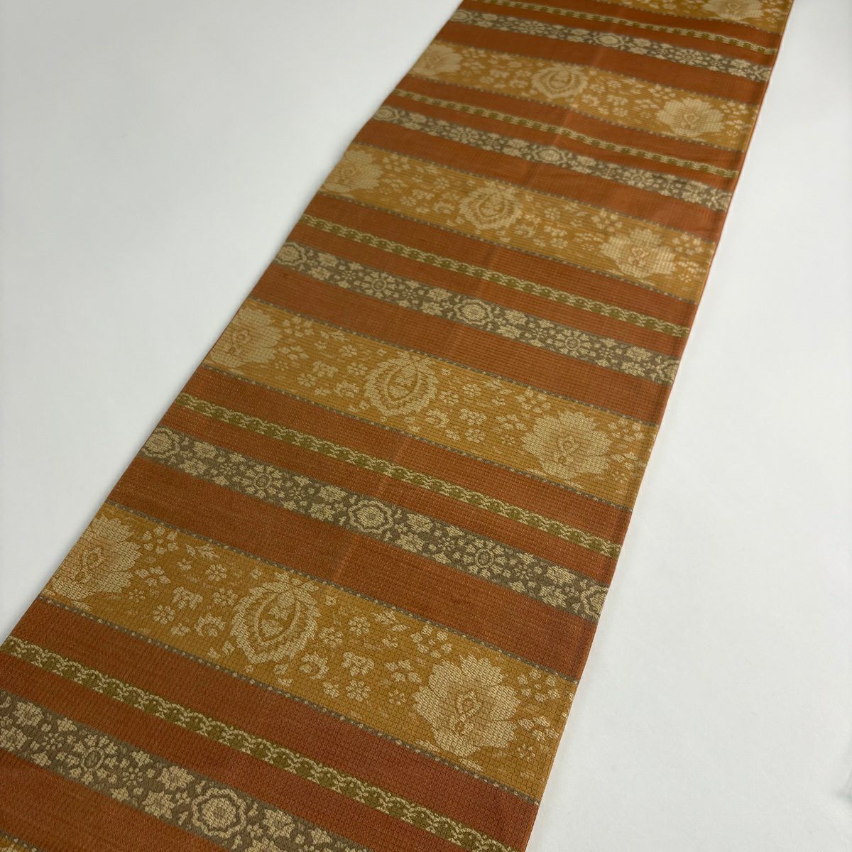 【美品】 袋帯 秀品 草花 縞 金糸 オレンジ 六通 正絹
