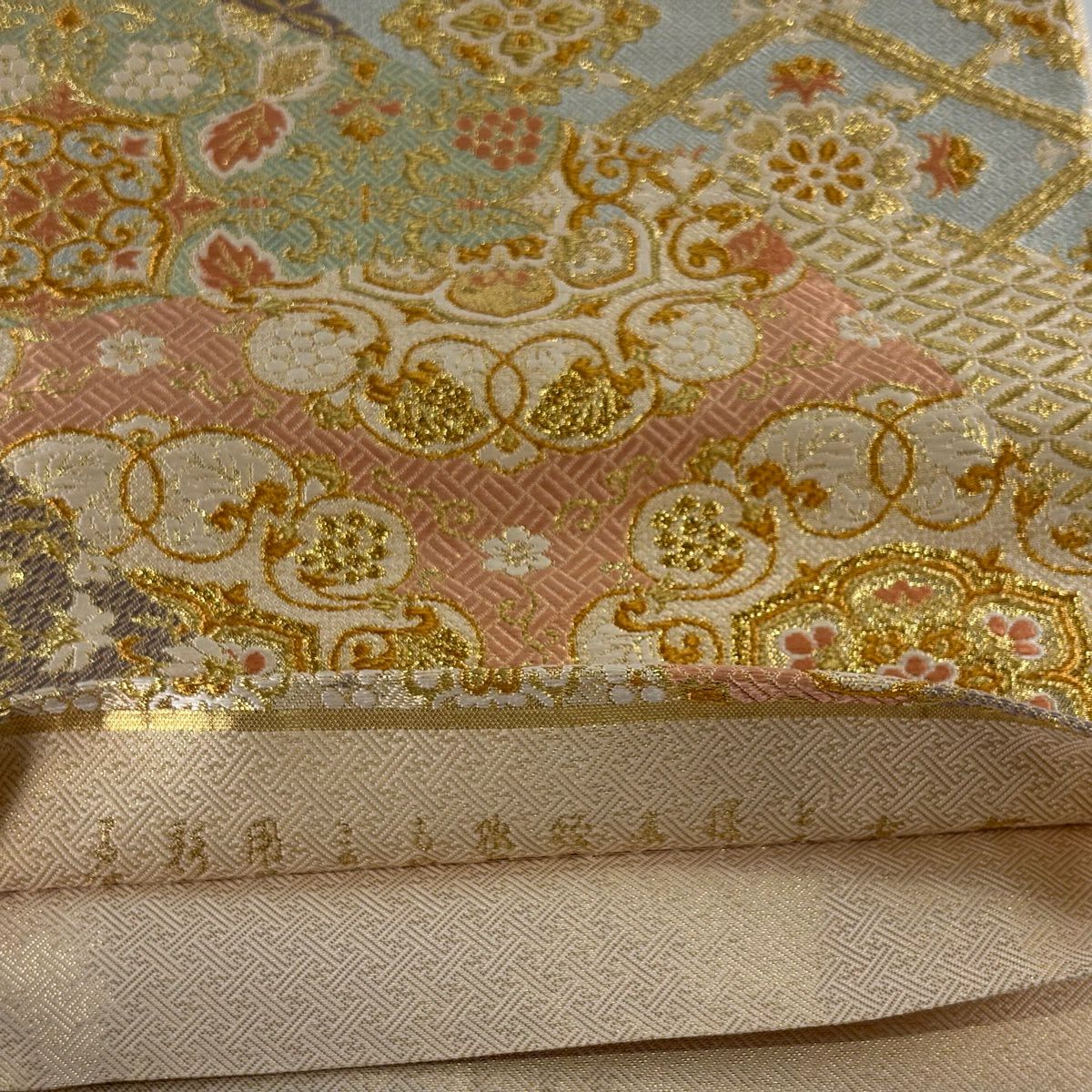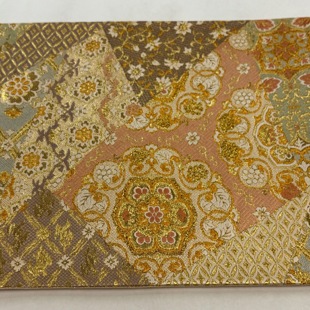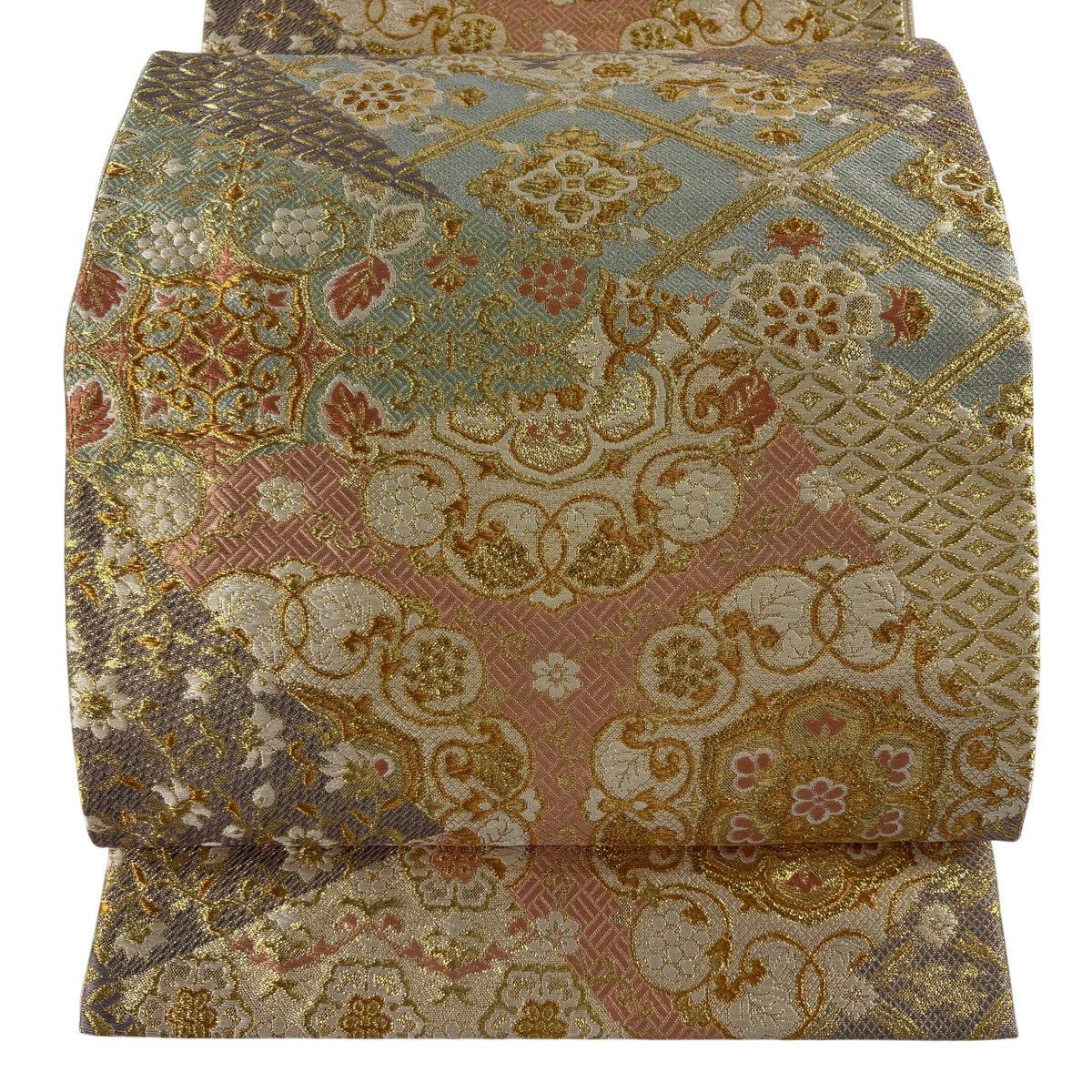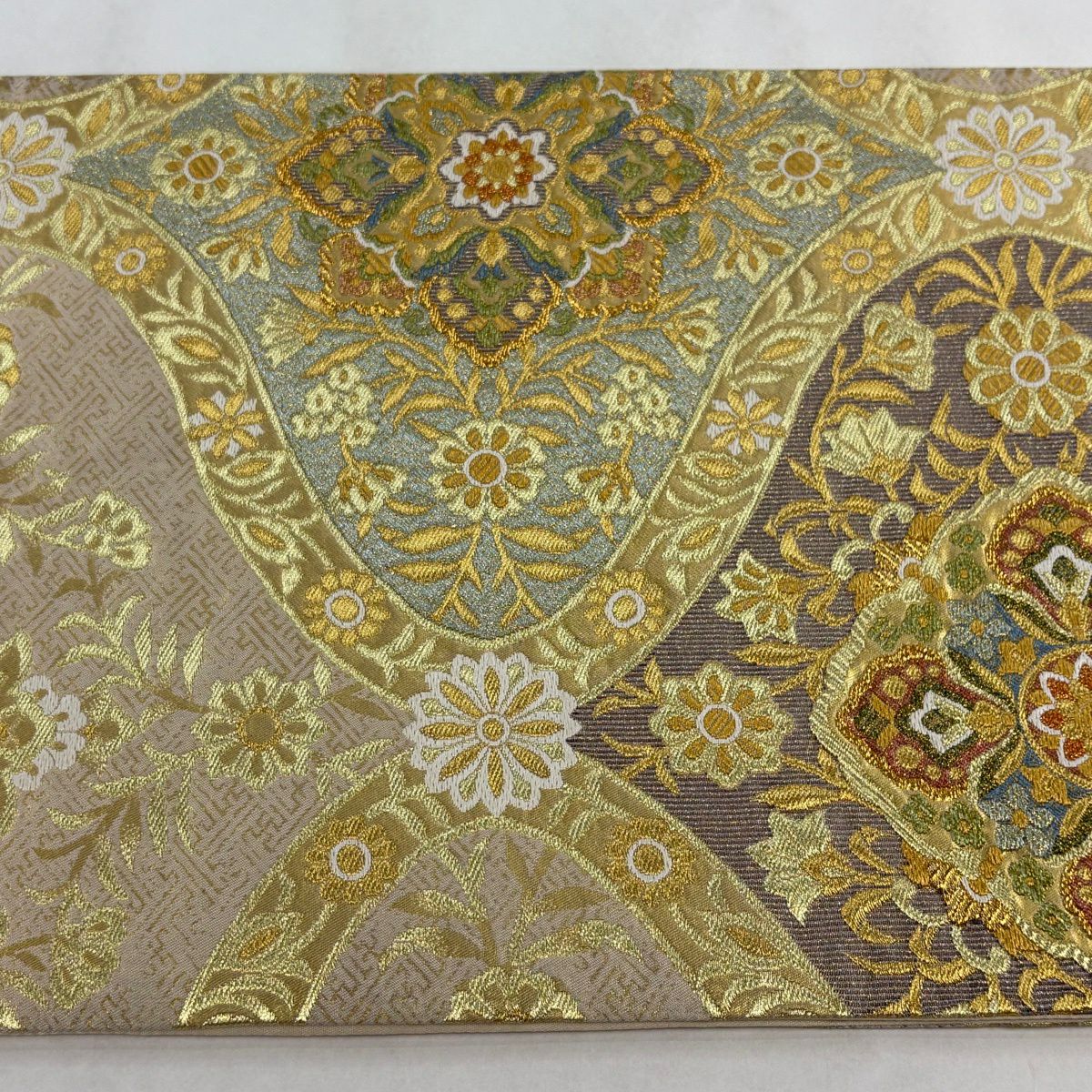 【美品】 袋帯 秀品 立枠更紗華文 金糸 箔 金色 六通 正絹