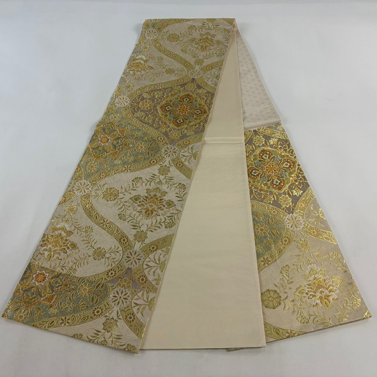 袋帯 秀品 青銅箔 草花 丸文 金銀糸 クリーム 六通 正絹