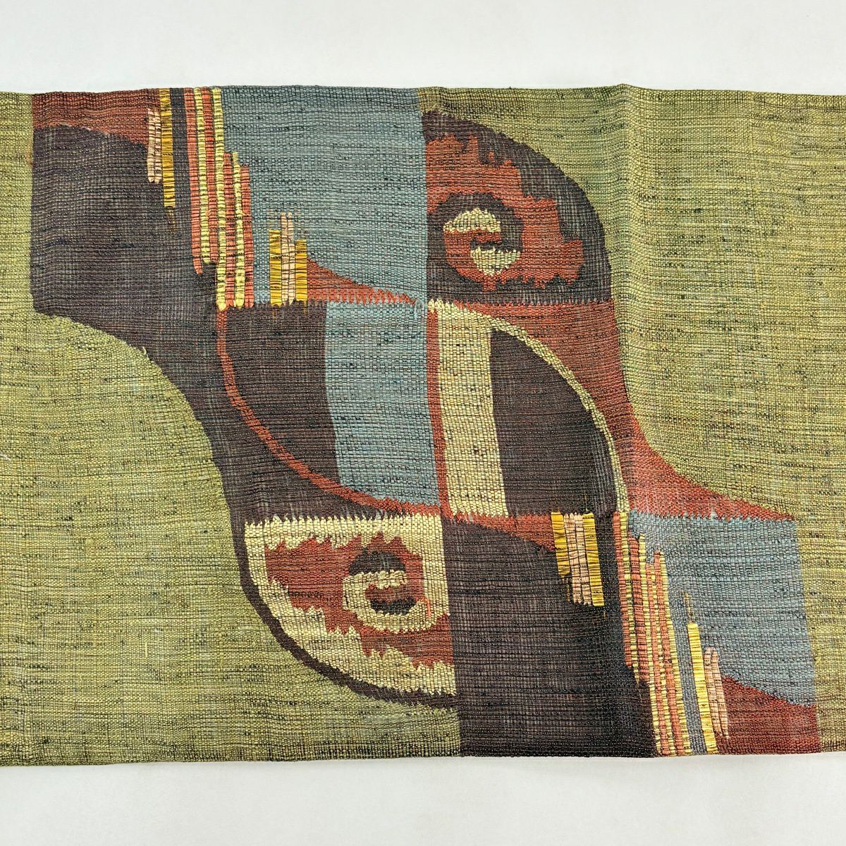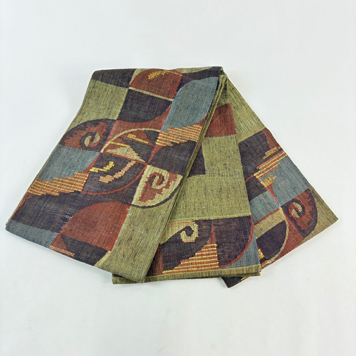 袋帯 秀品 紬地 幾何学模様 金糸 箔 灰緑 お太鼓柄 正絹