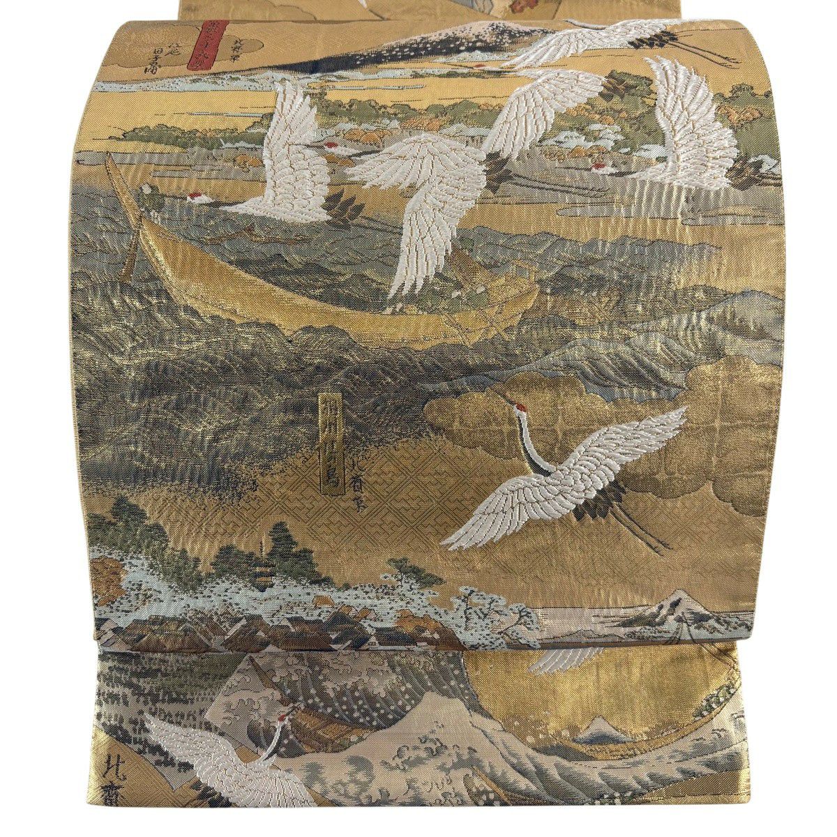 【美品】 袋帯 秀品 鶴 風景 箔 金糸 金色 お太鼓柄 正絹