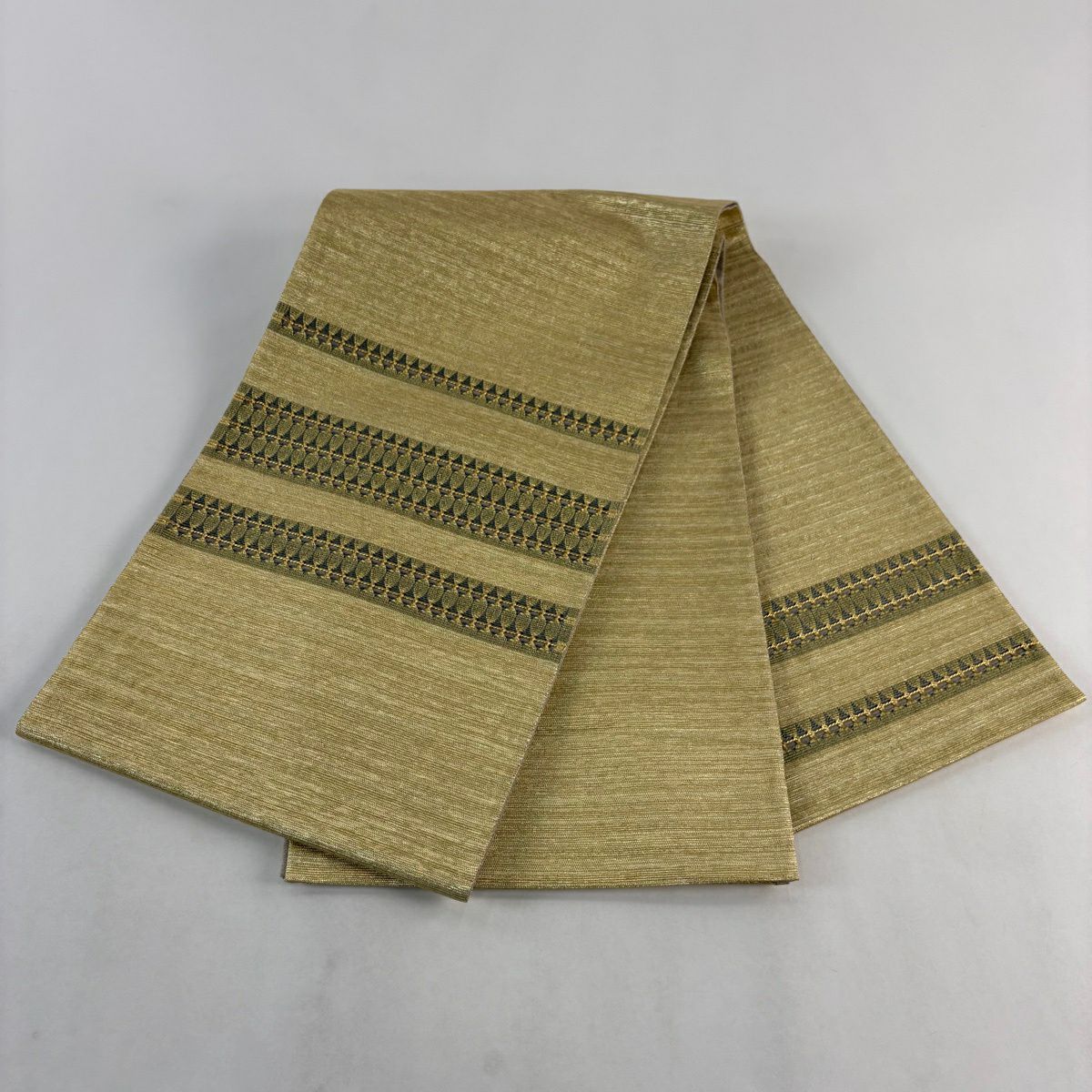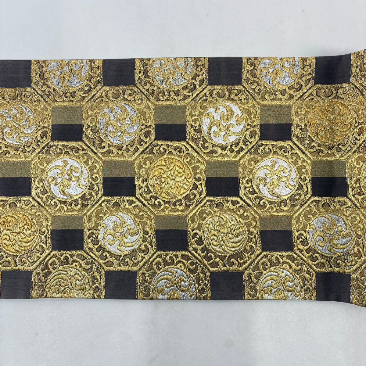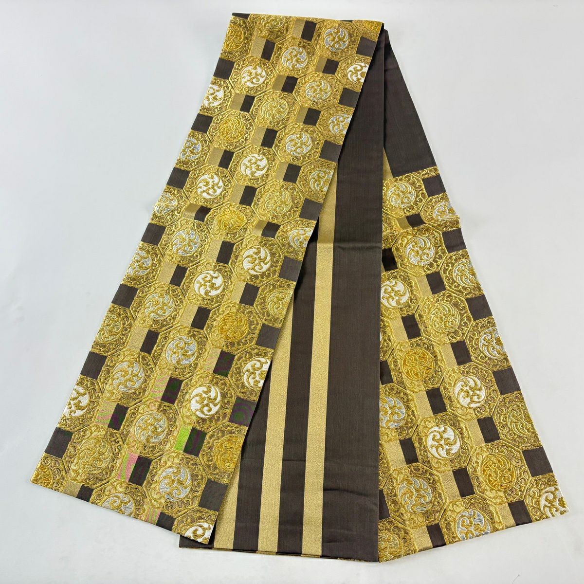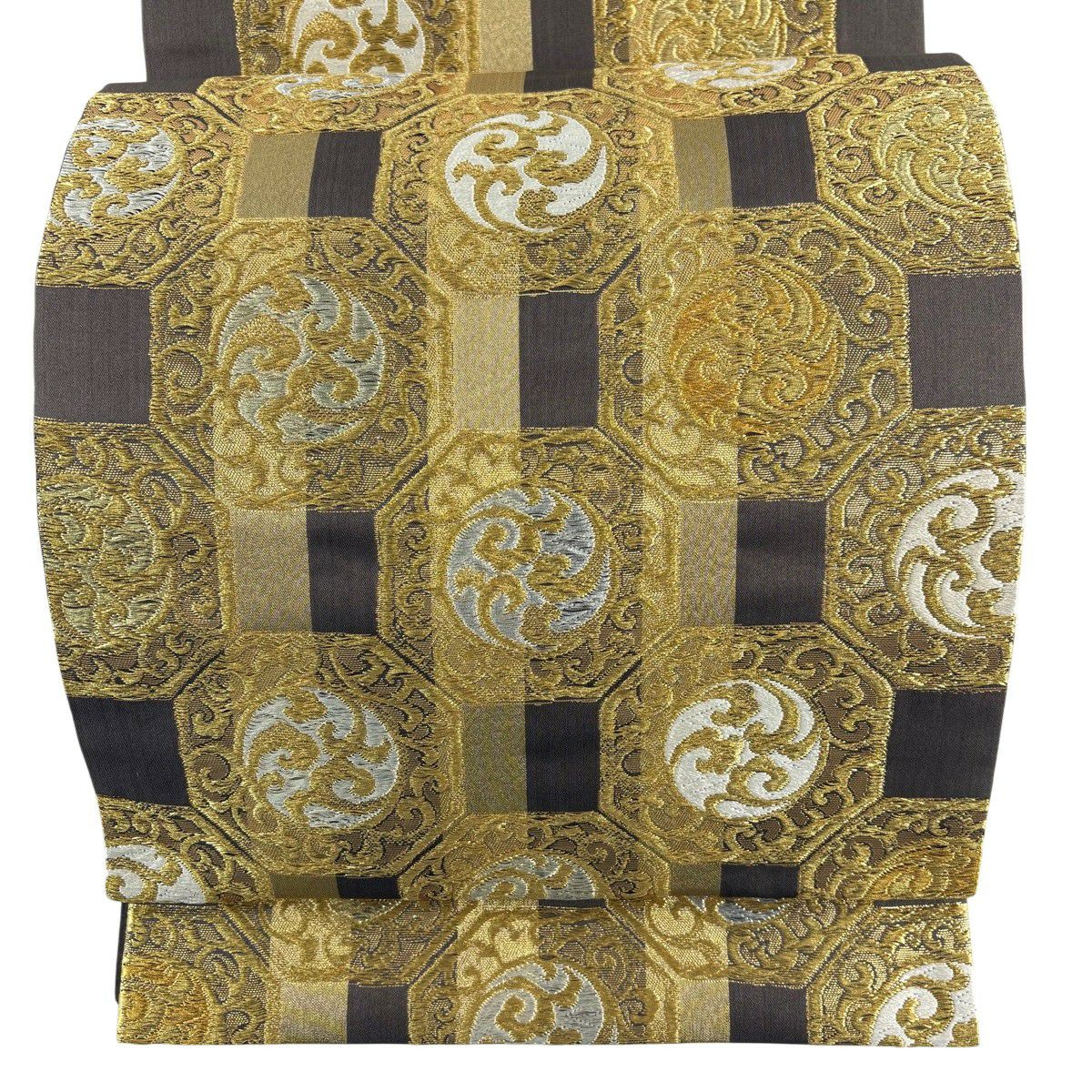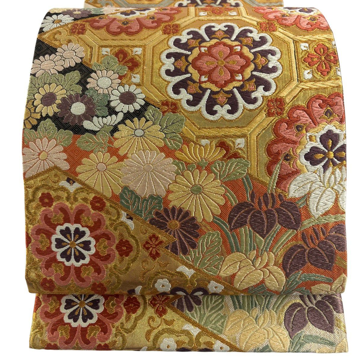 【美品】 袋帯 秀品 芝 幾何学模様 箔 黄土色 全通 正絹