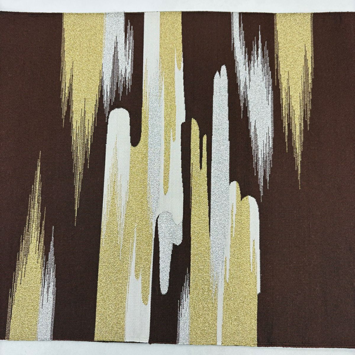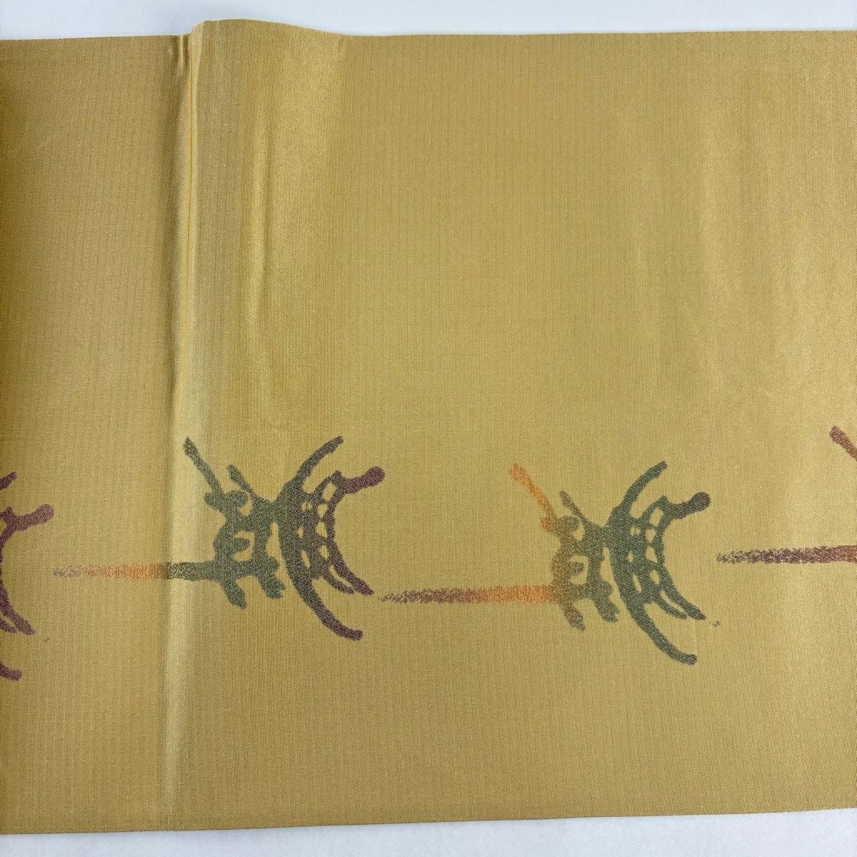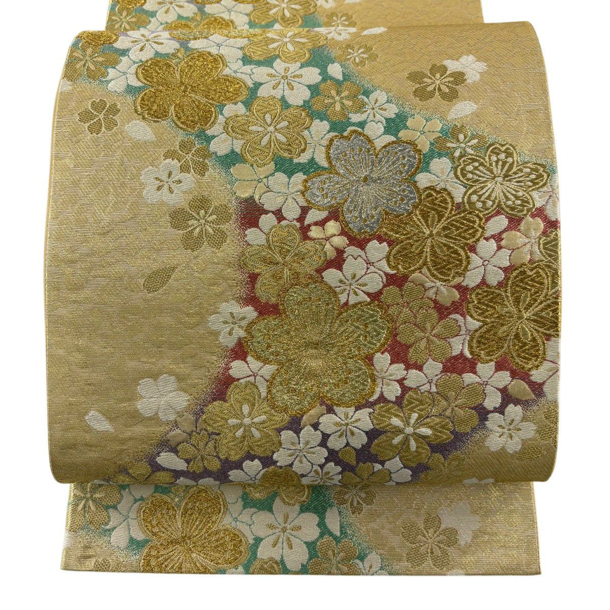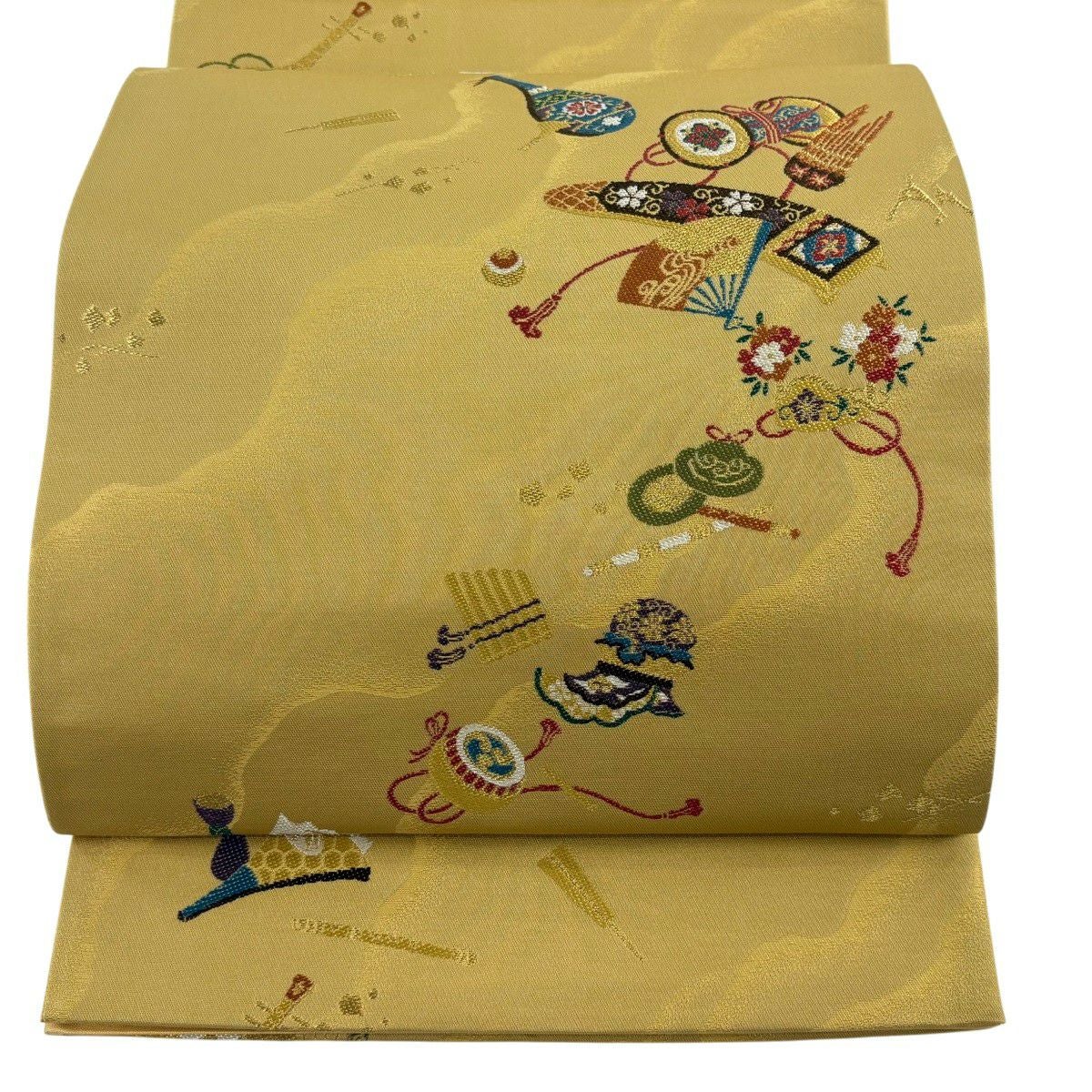 【美品】 袋帯 秀品 芝 幾何学模様 箔 黄土色 全通 正絹