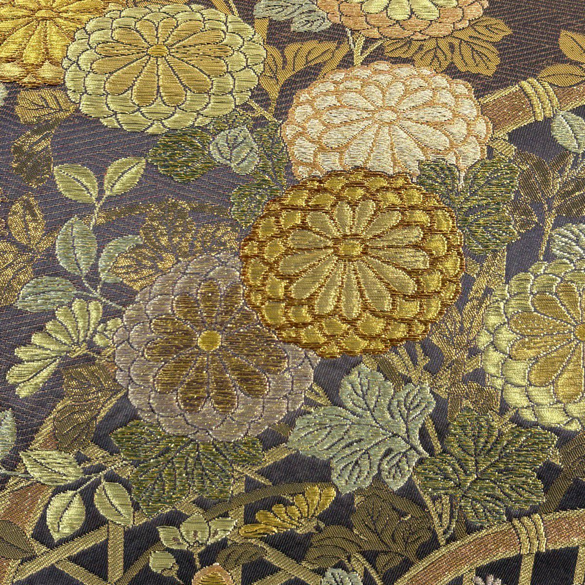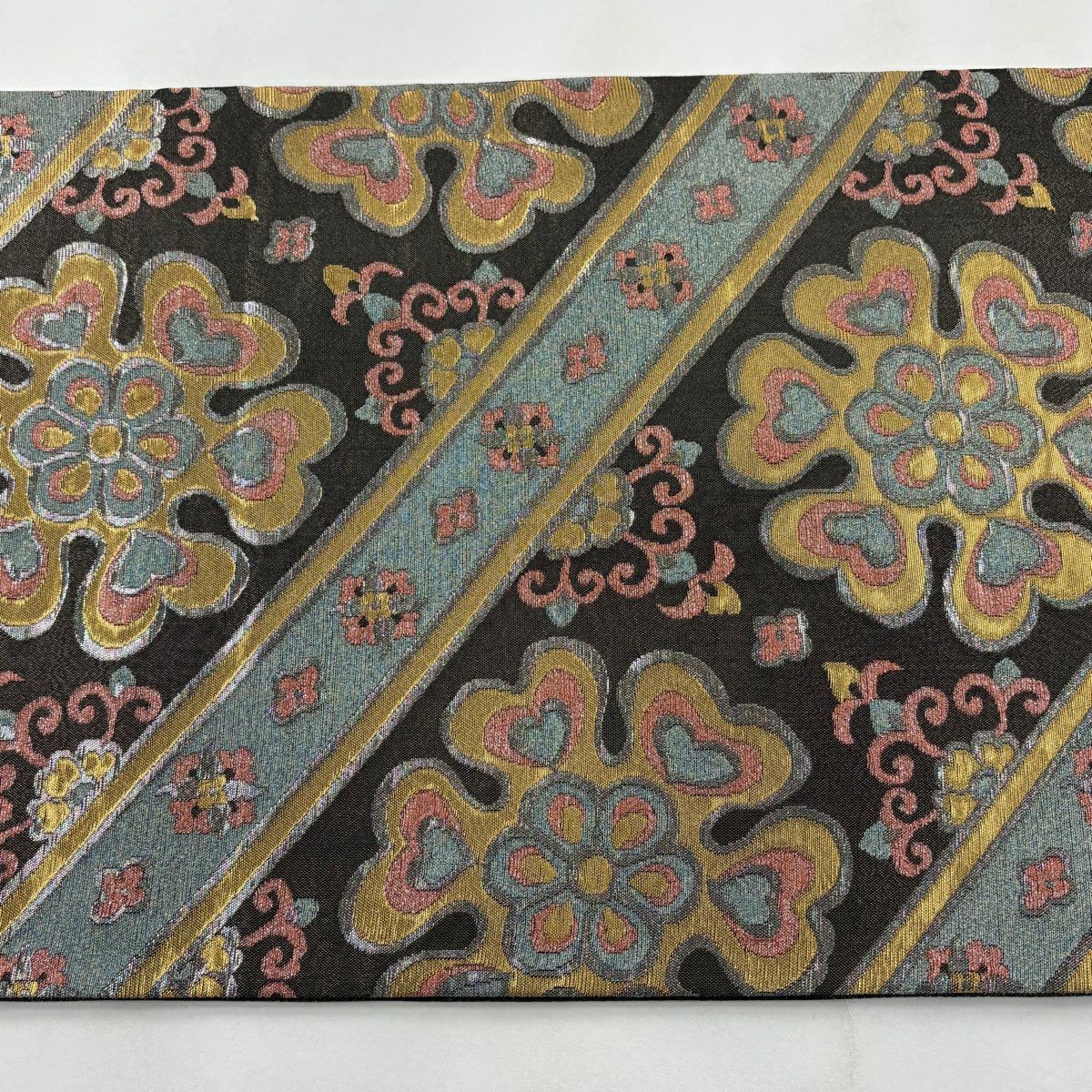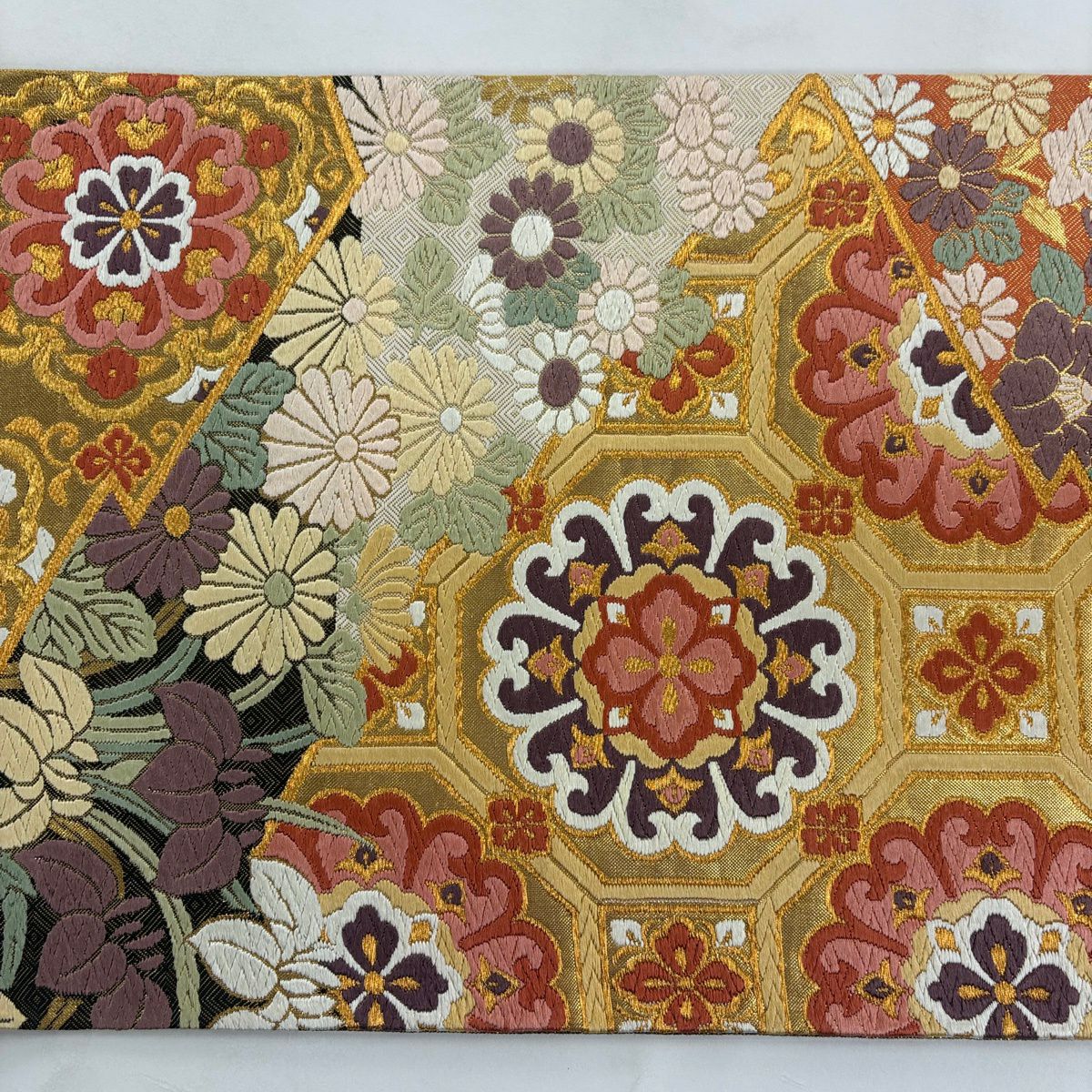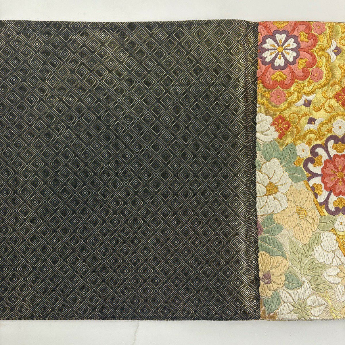 【美品】 袋帯 秀品 蜀江文 花 箔 刺繍 墨色 六通 正絹