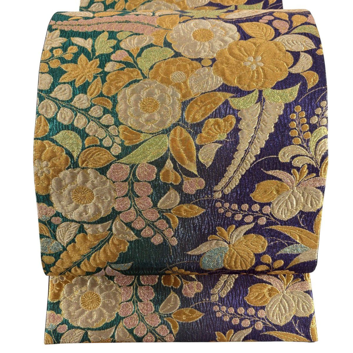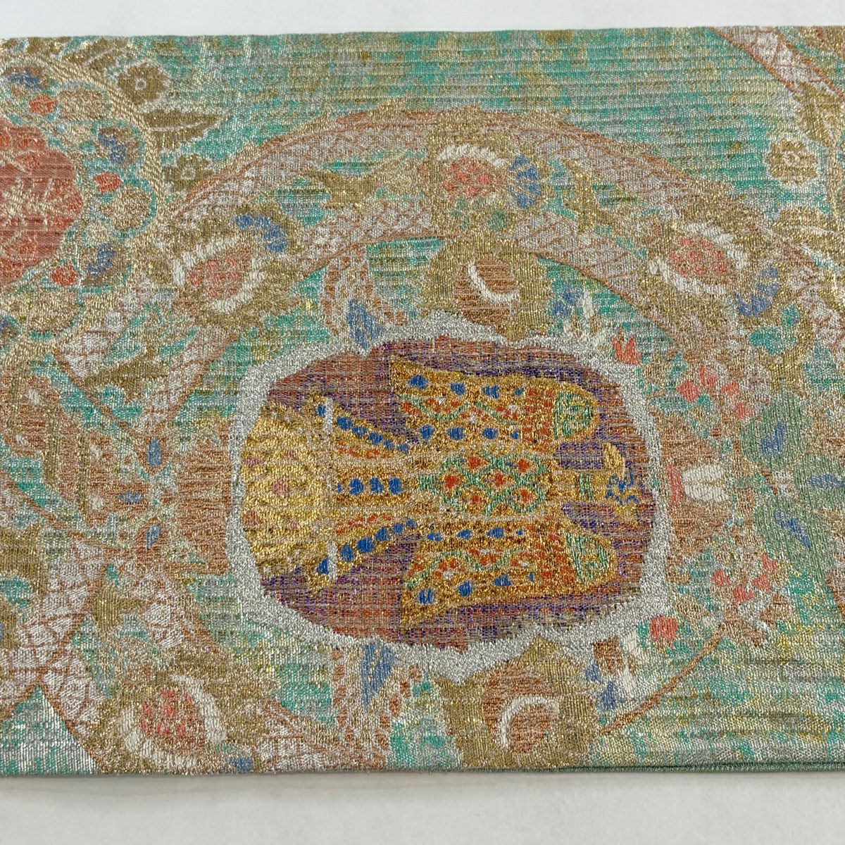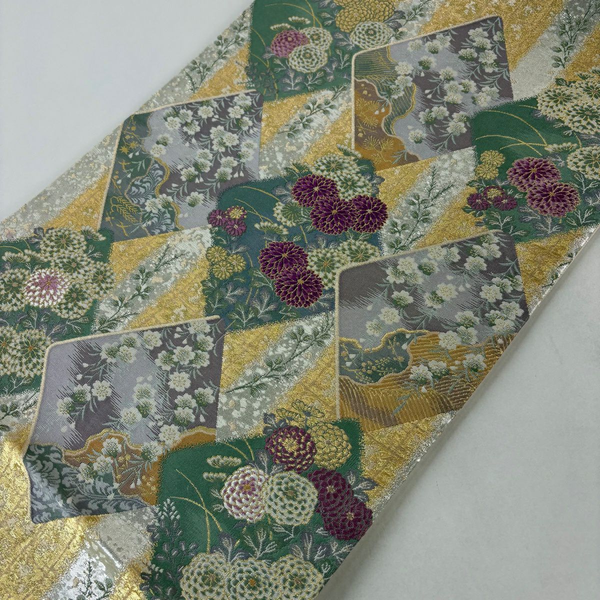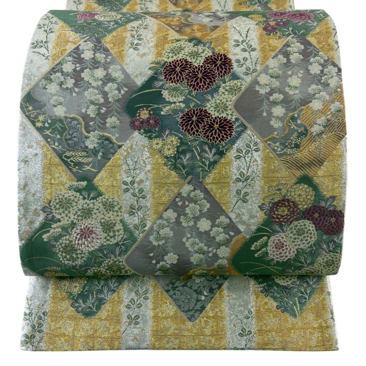 【美品】 袋帯 秀品 花 幾何学 金銀糸 箔 緑 六通 正絹