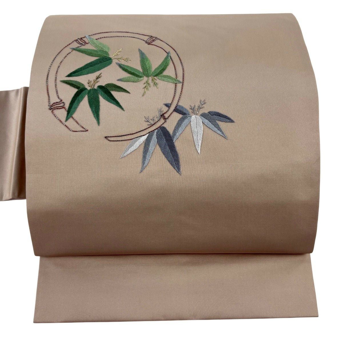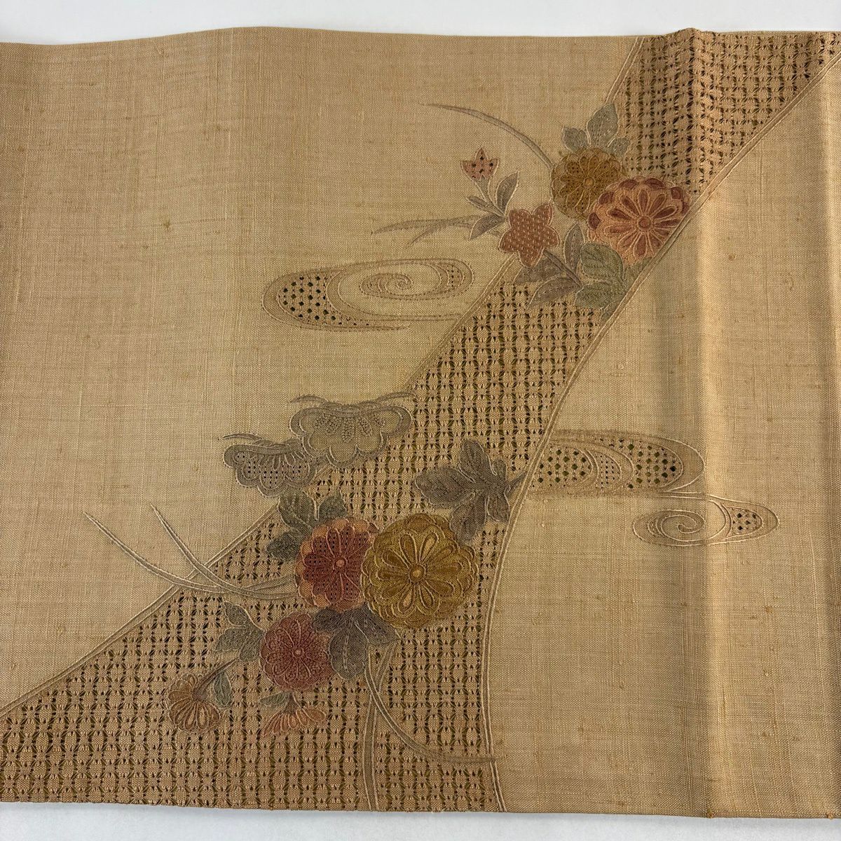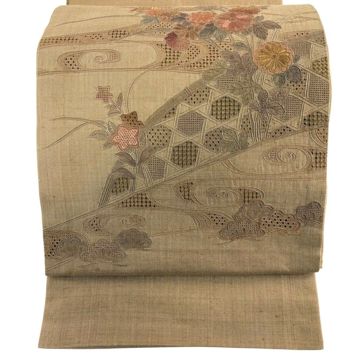 袋帯 秀品 扇 草花 金銀糸 刺繍 ベージュ 六通 正絹