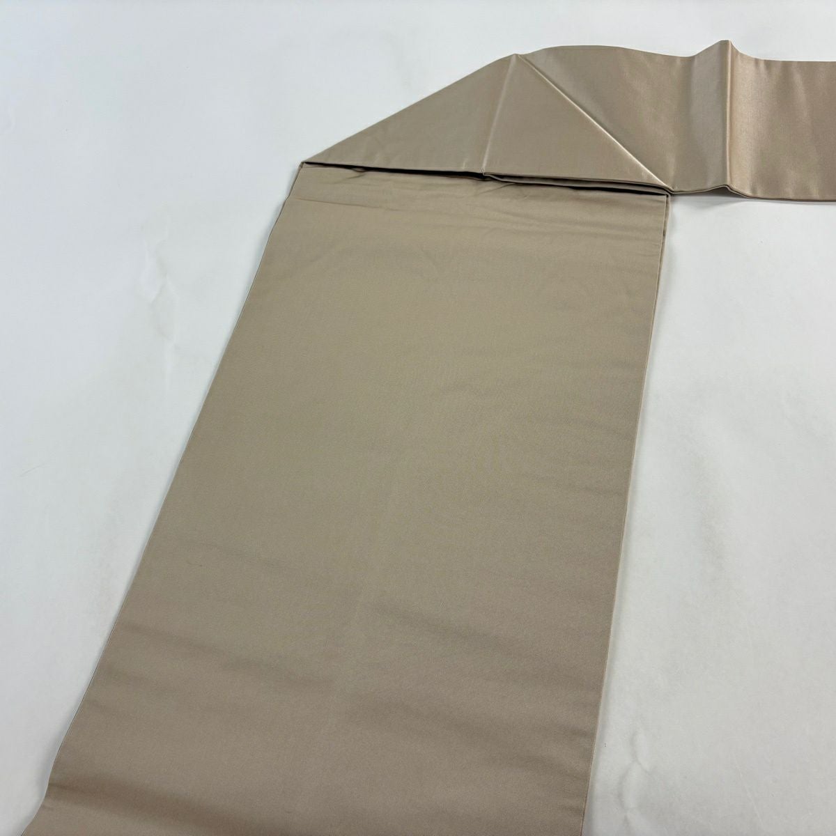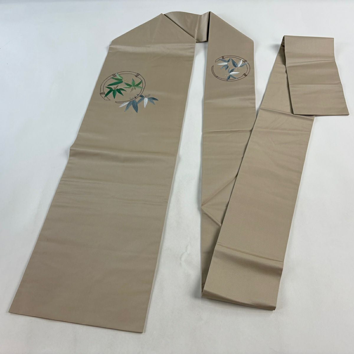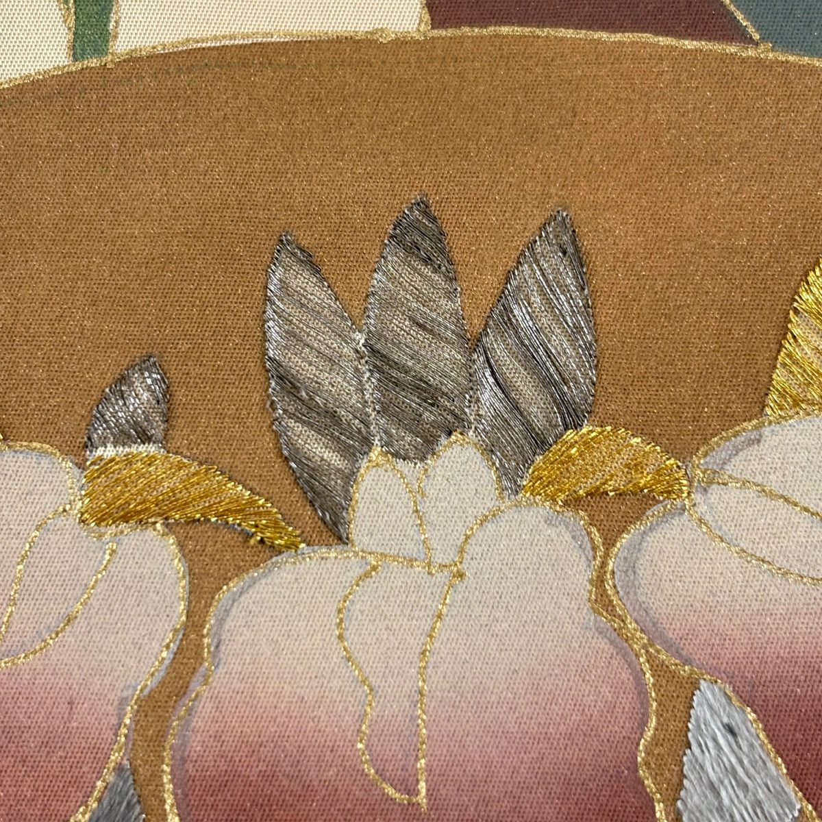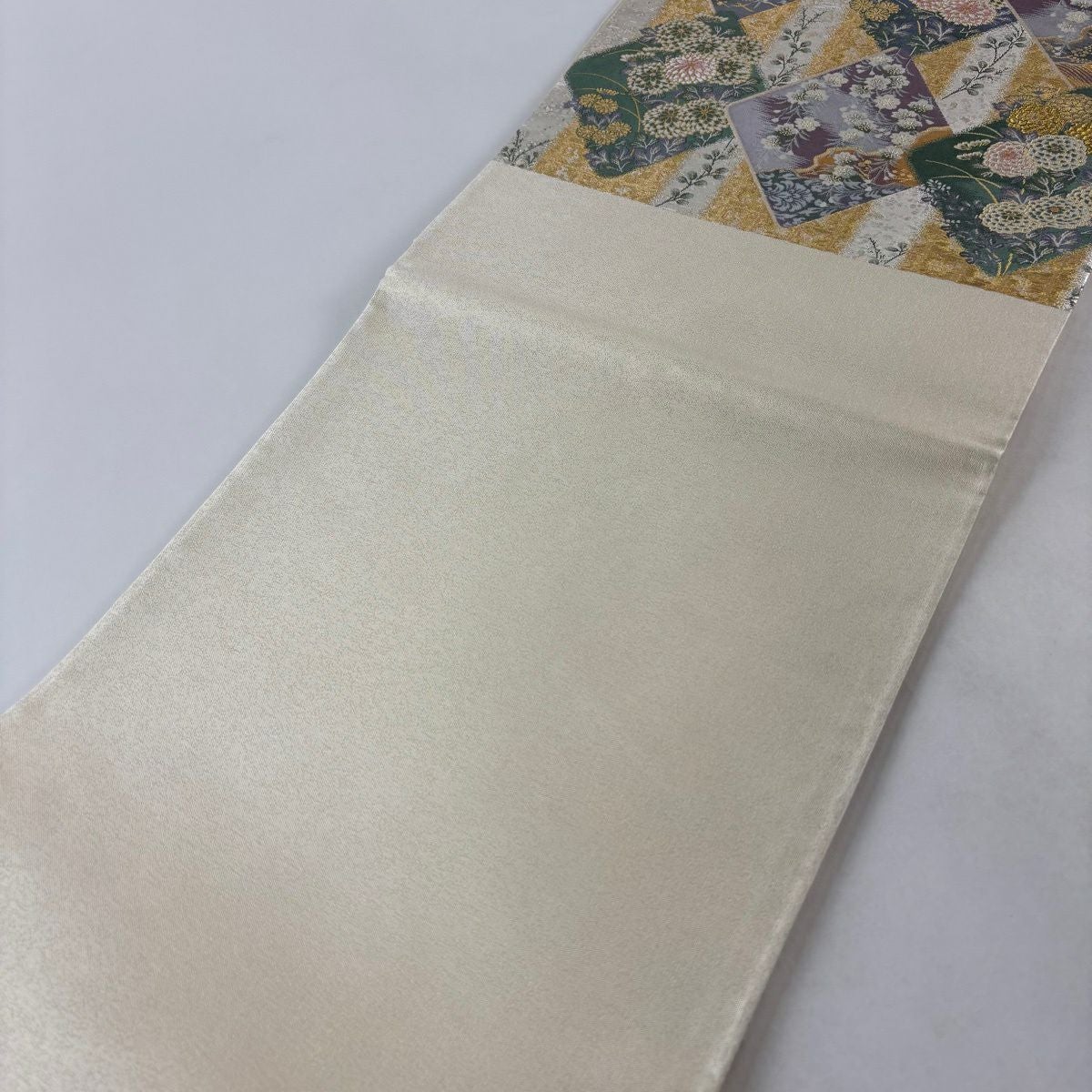 袋帯 秀品 扇 草花 金銀糸 刺繍 ベージュ 六通 正絹