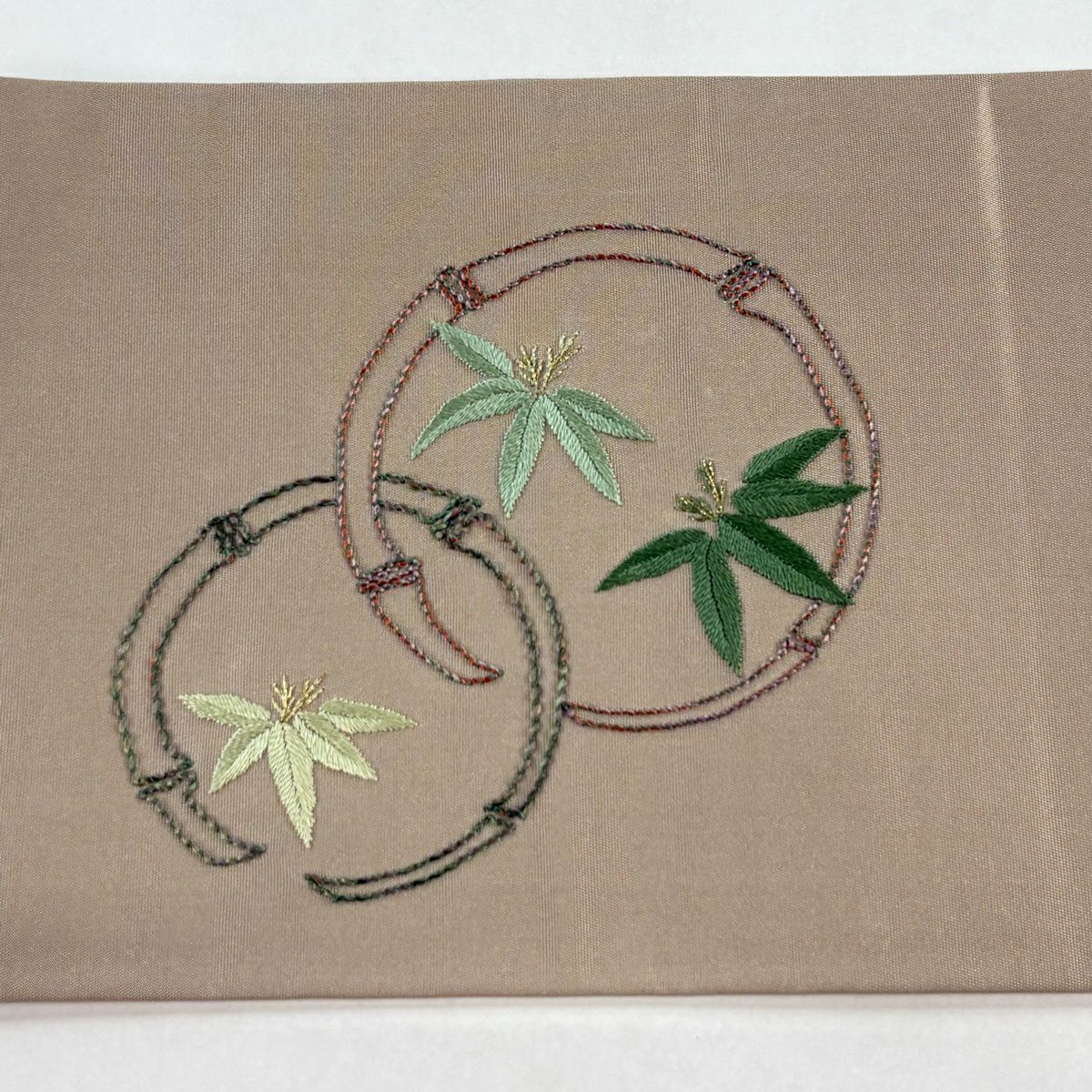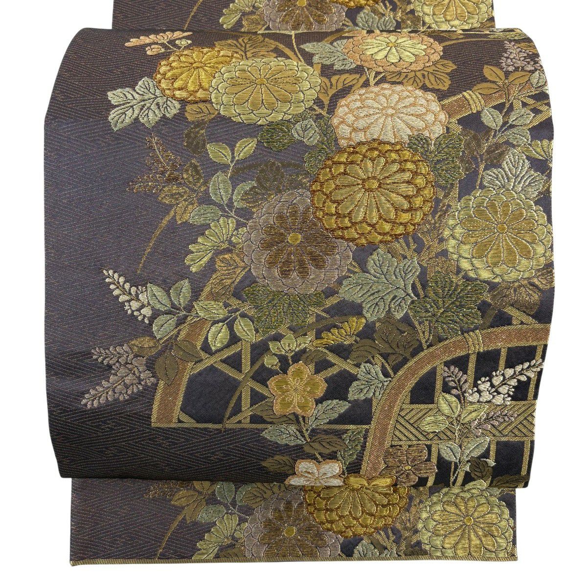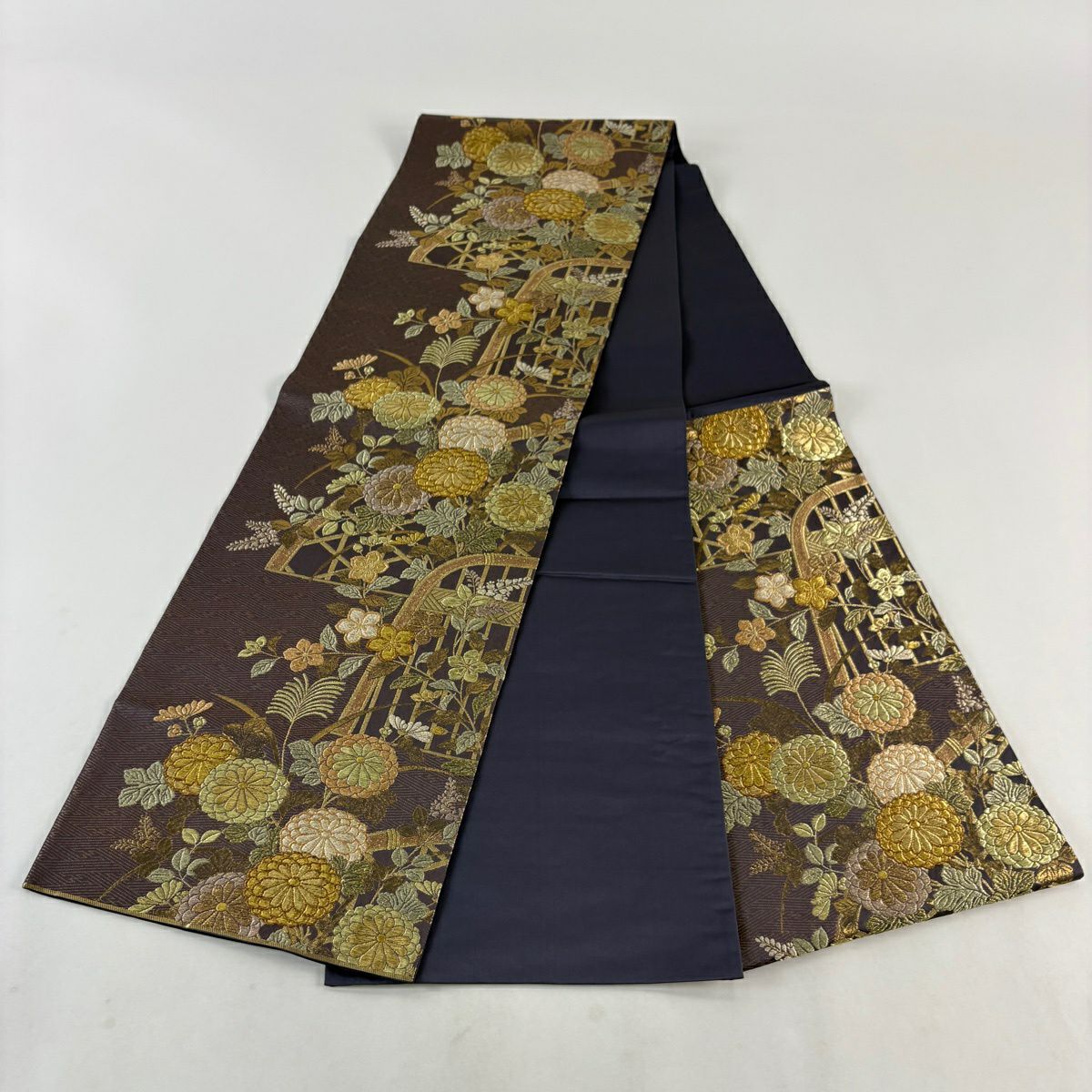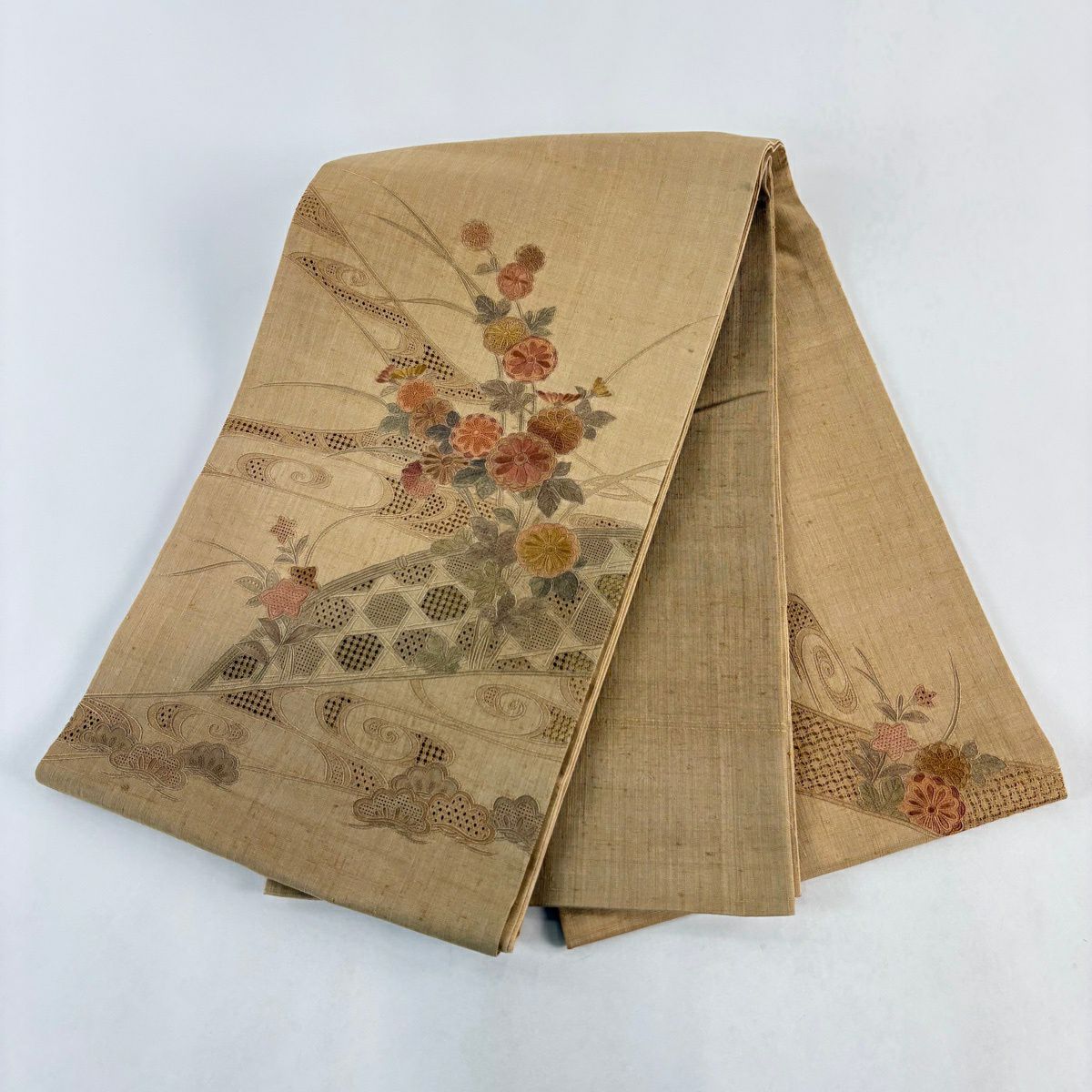 【美品】 袋帯 秀品 菊 間垣 刺繍 薄茶色 お太鼓柄 正絹