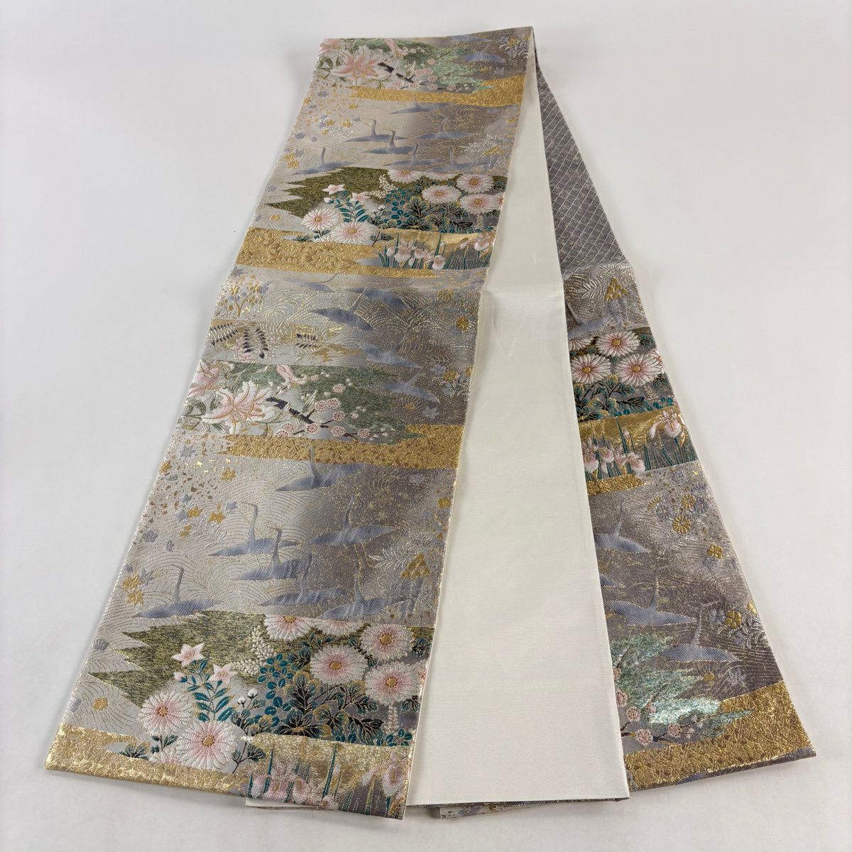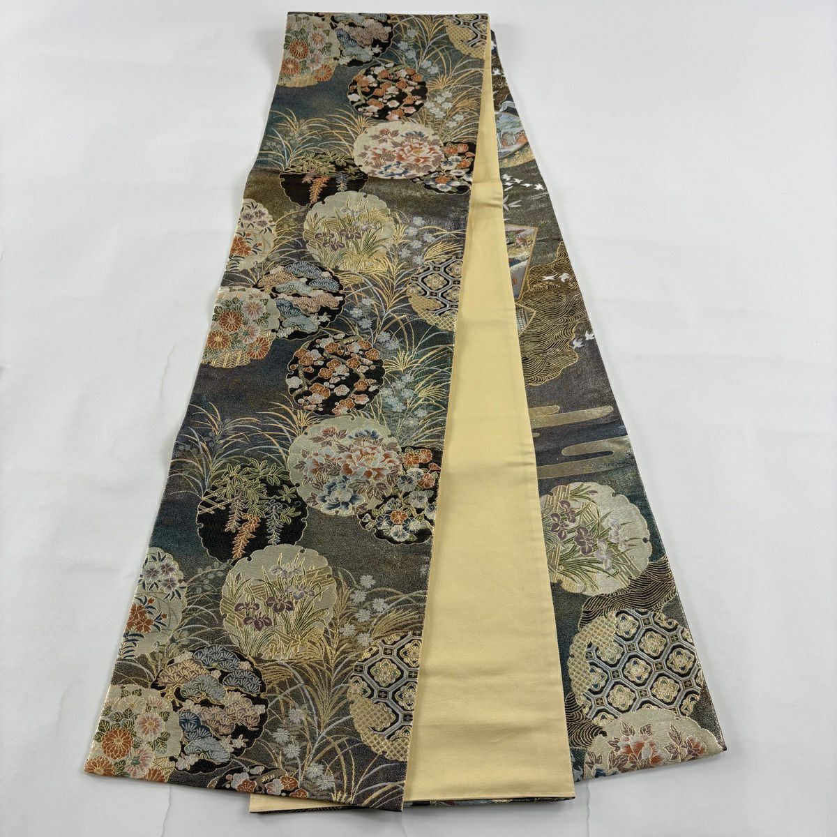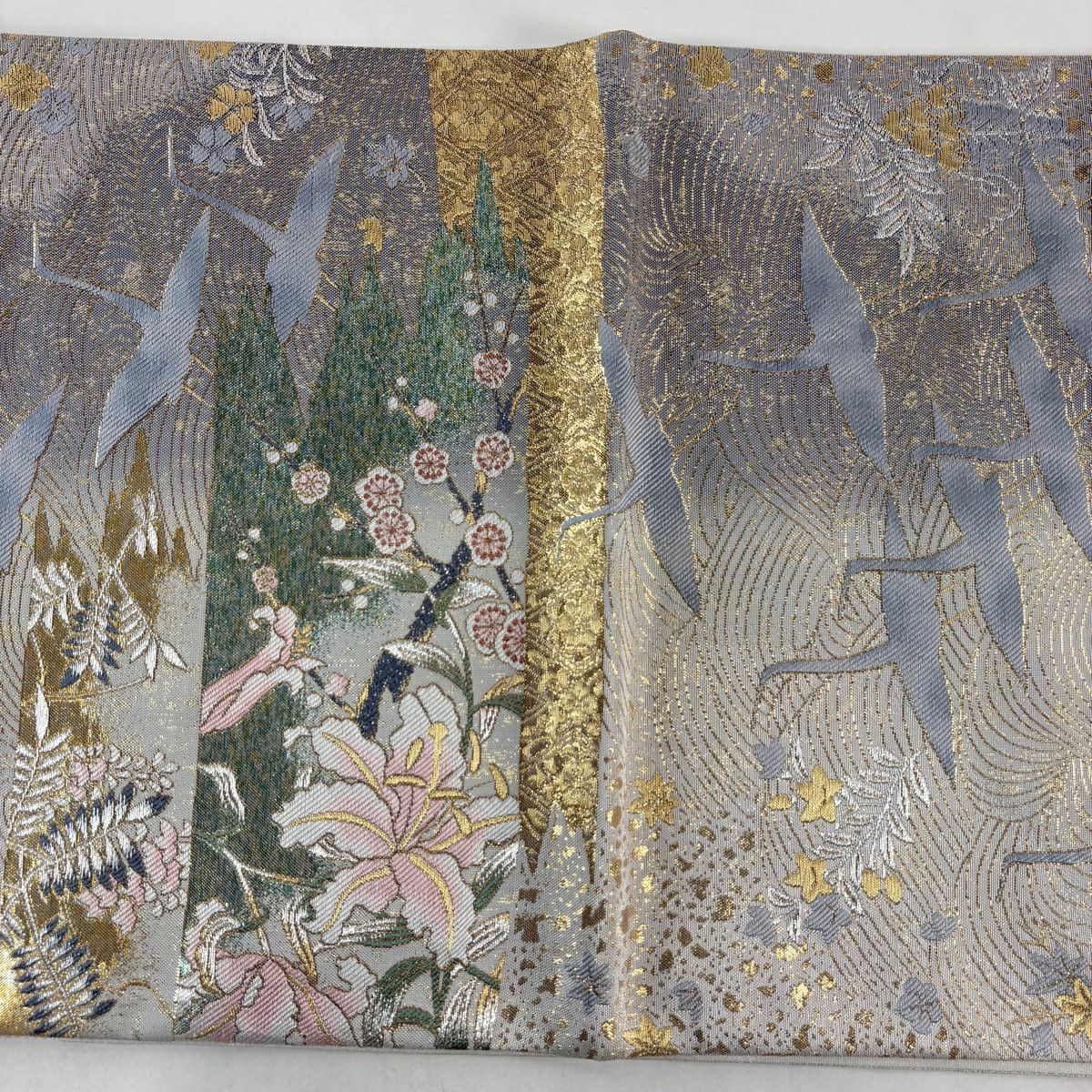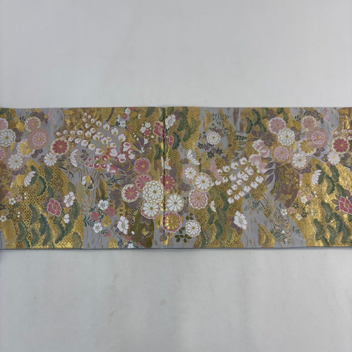 【美品】 袋帯 秀品 花鳥 流水 唐織 箔 灰色 全通 正絹